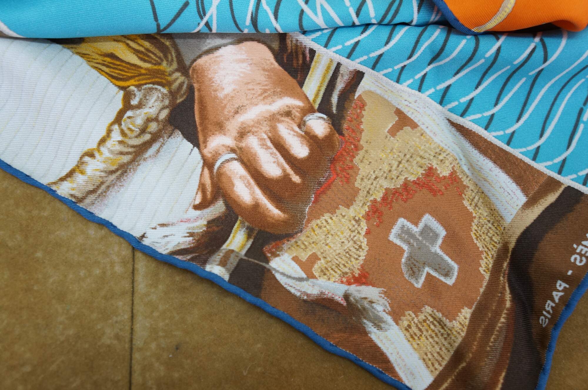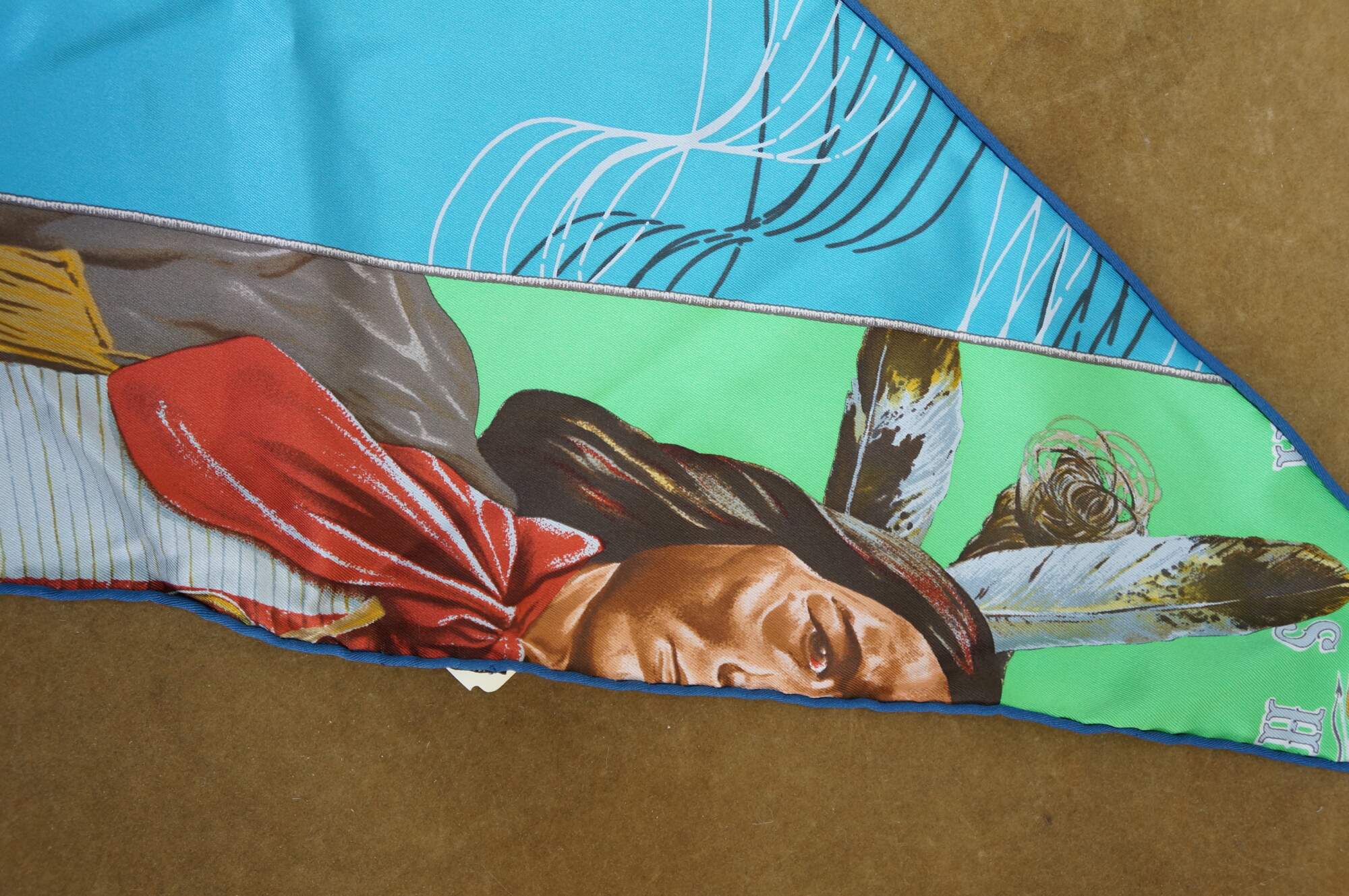 Vintage Hermes Carre en Carres Small Multi Hermes Pointu 100% Silk kerchief / triangular scarf. Made in France. Purchased at Bergdorf Goodman NYC - tag attached. Includes original box. Features a tiger, equestrian / horse / horsebit theme and Native American / Southwestern Indian theme.