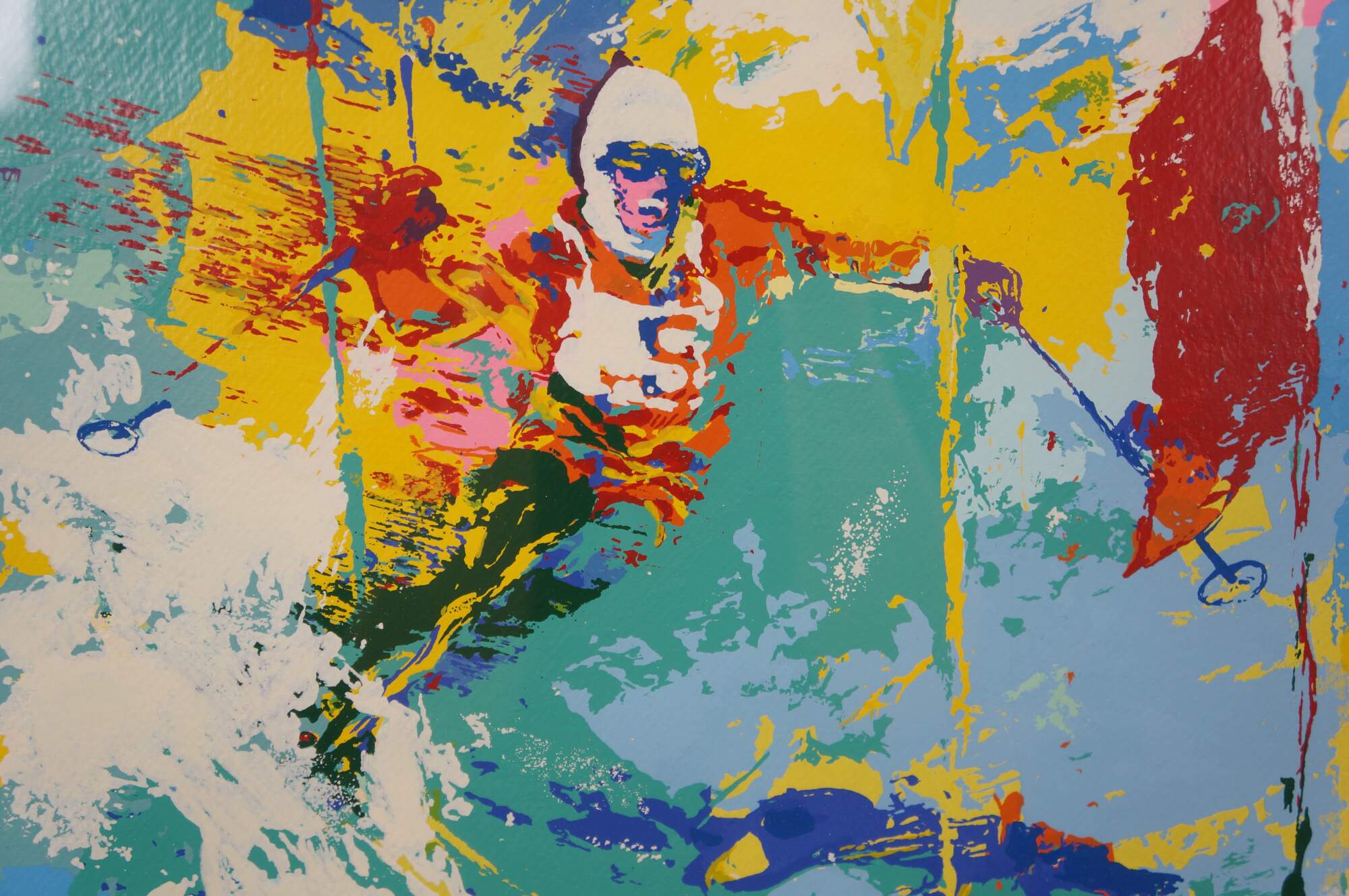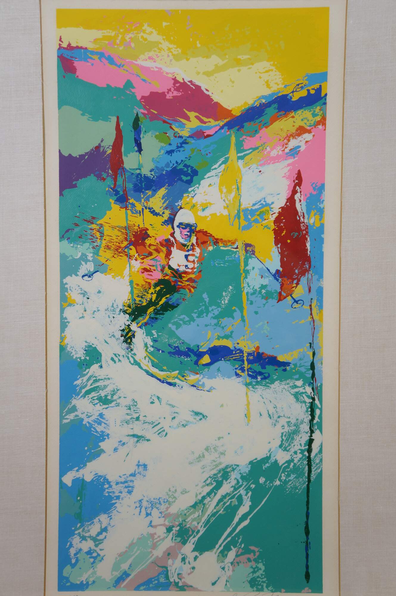 1973 serigraph print titled "Downhill" by LeRoy Neiman. Depicts a brightly colored Olympic skier coasting through red and yellow flags. Pencil signed and numbered 287/300, lower edge. Includes Certificate of Authenticity. Beveled giltwood frame; white linen mat.
