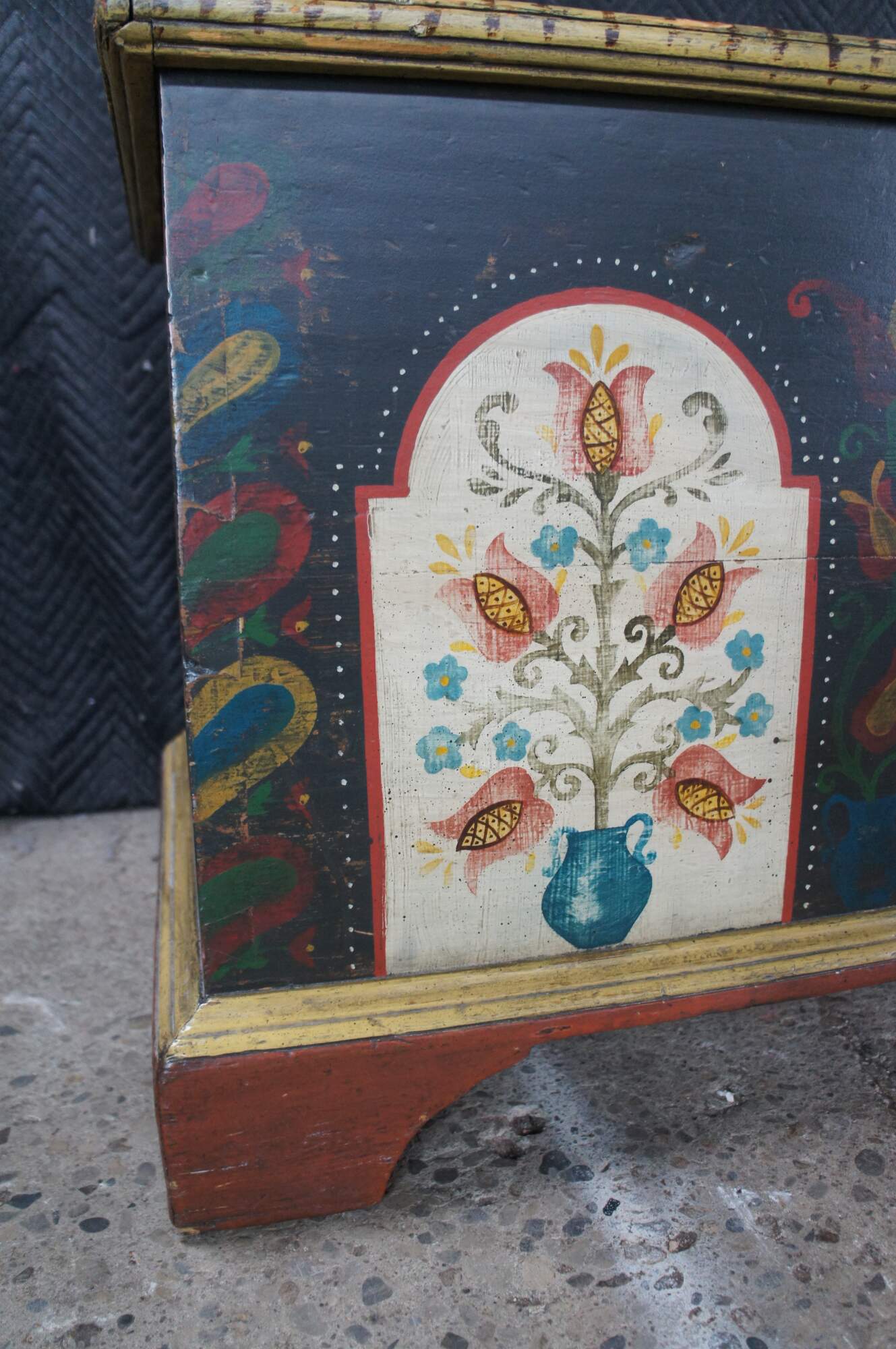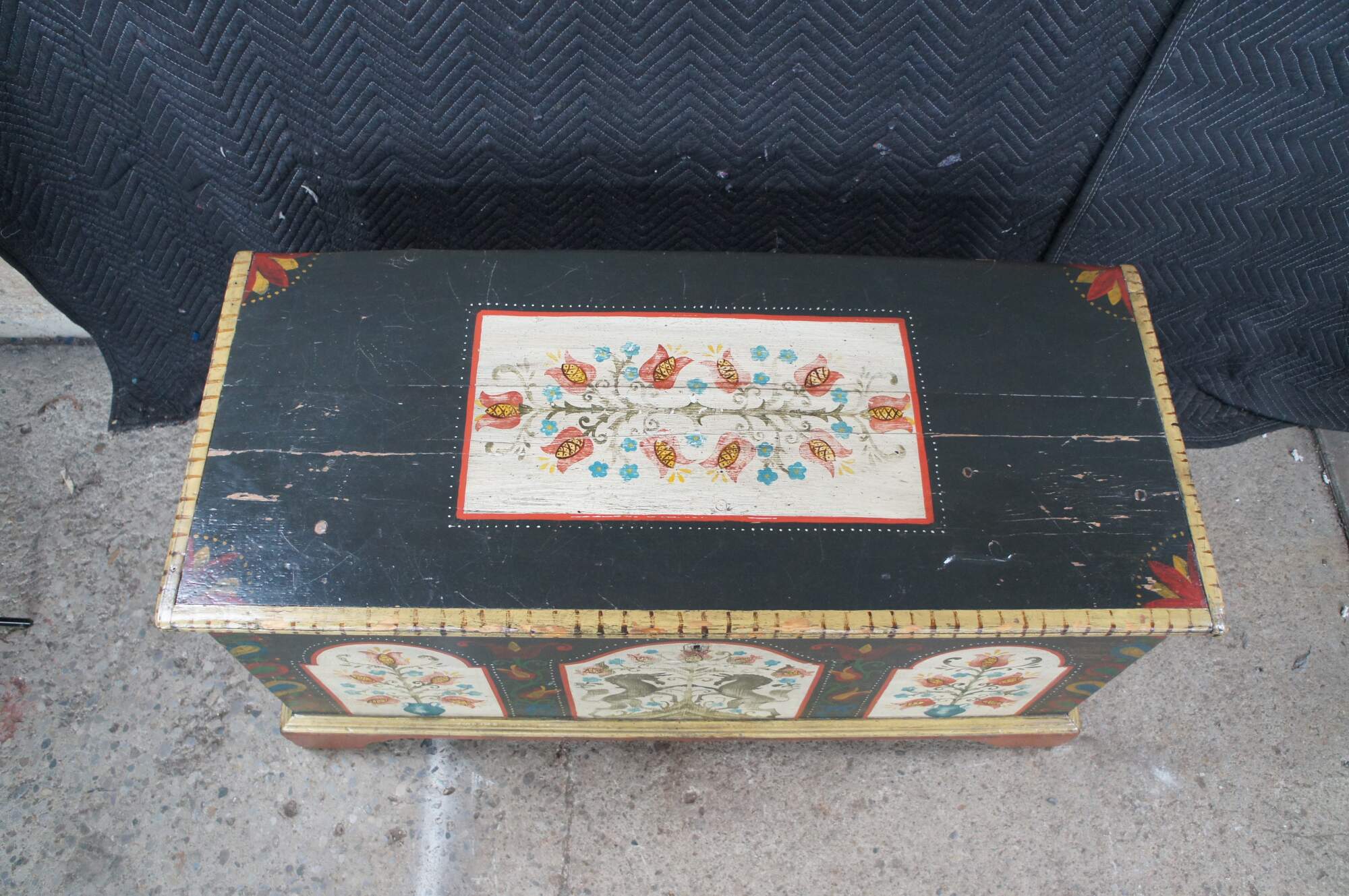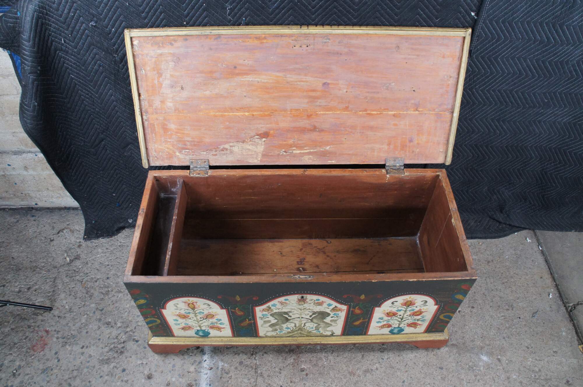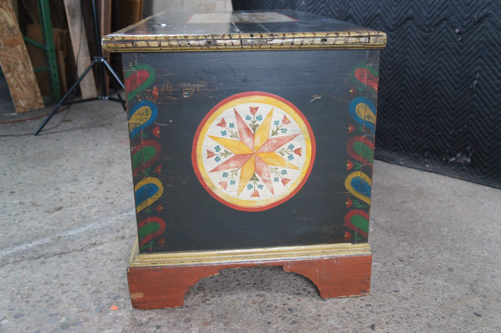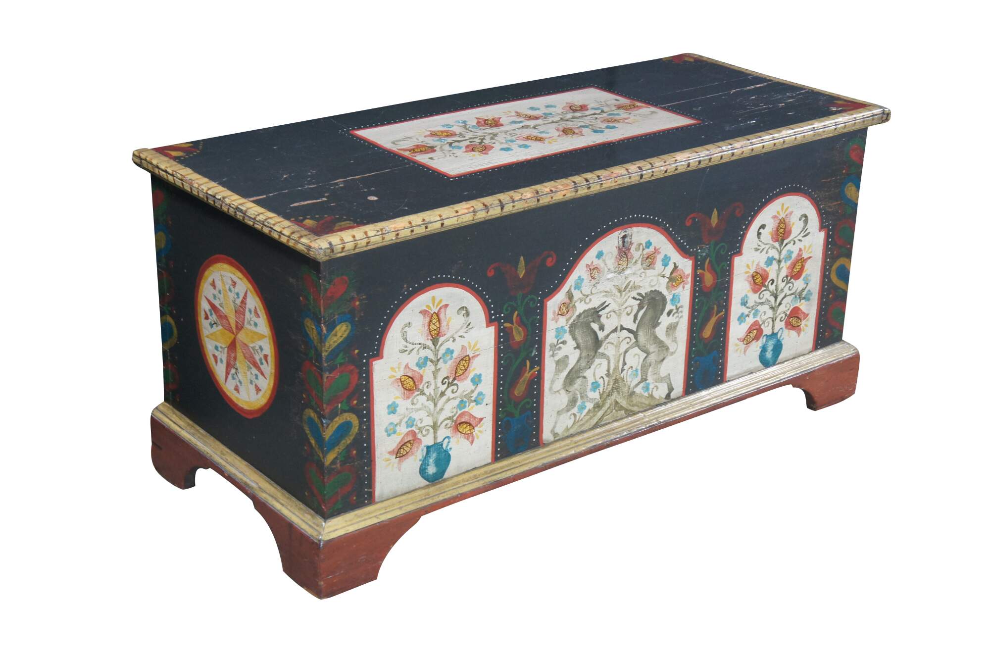 Antique late 18th to early 19th century Pennsylvania Dutch blanket trunk / hope / dowry / wedding chest featuring painted unicorns, floral roses, and 8-pointed LeMoyne Stars.