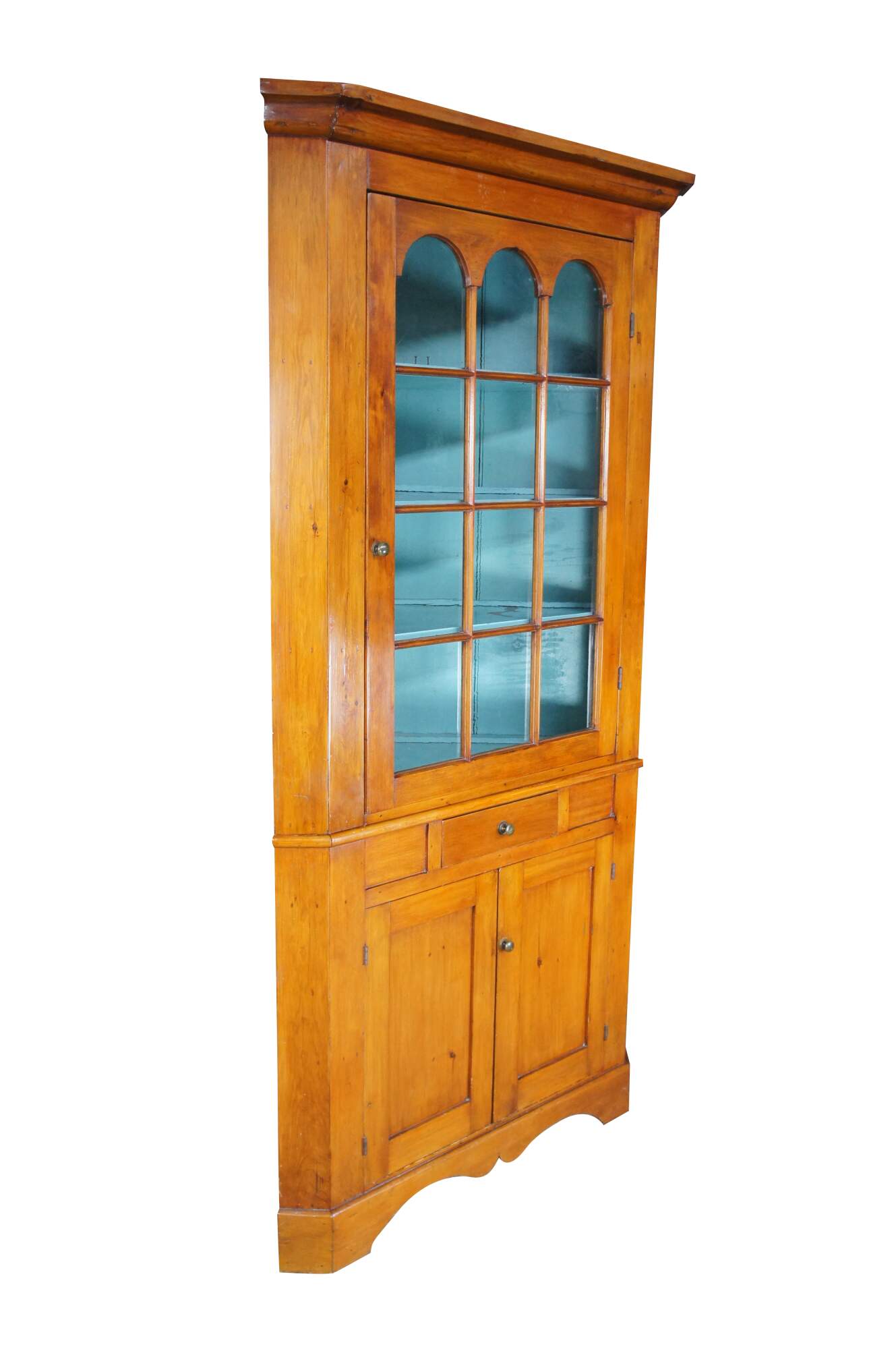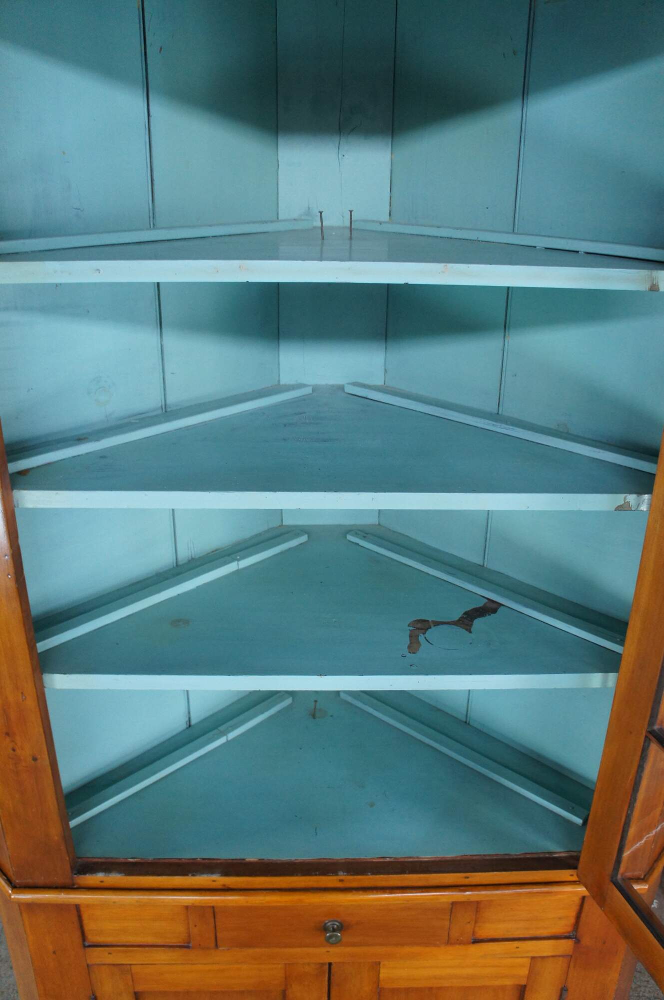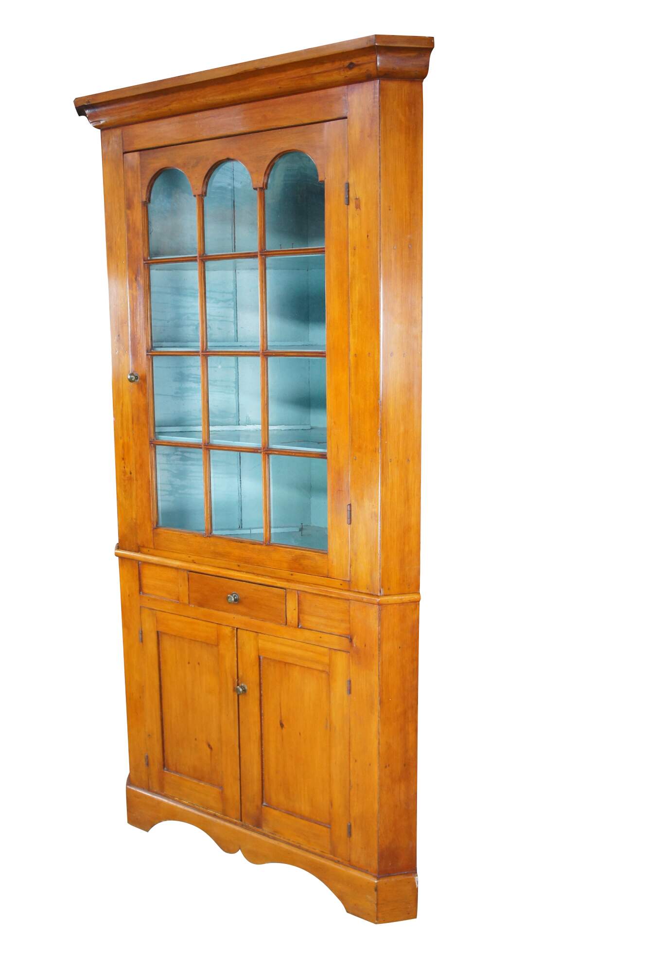 An antique early 19th century American primitive country farmhouse corner cabinet. Made of pine featuring a large 12 pane rolled glass arcaded door that opens to a blue painted interior with four shelves and plate grooves, supported by a lower cabinet with a central drawer.