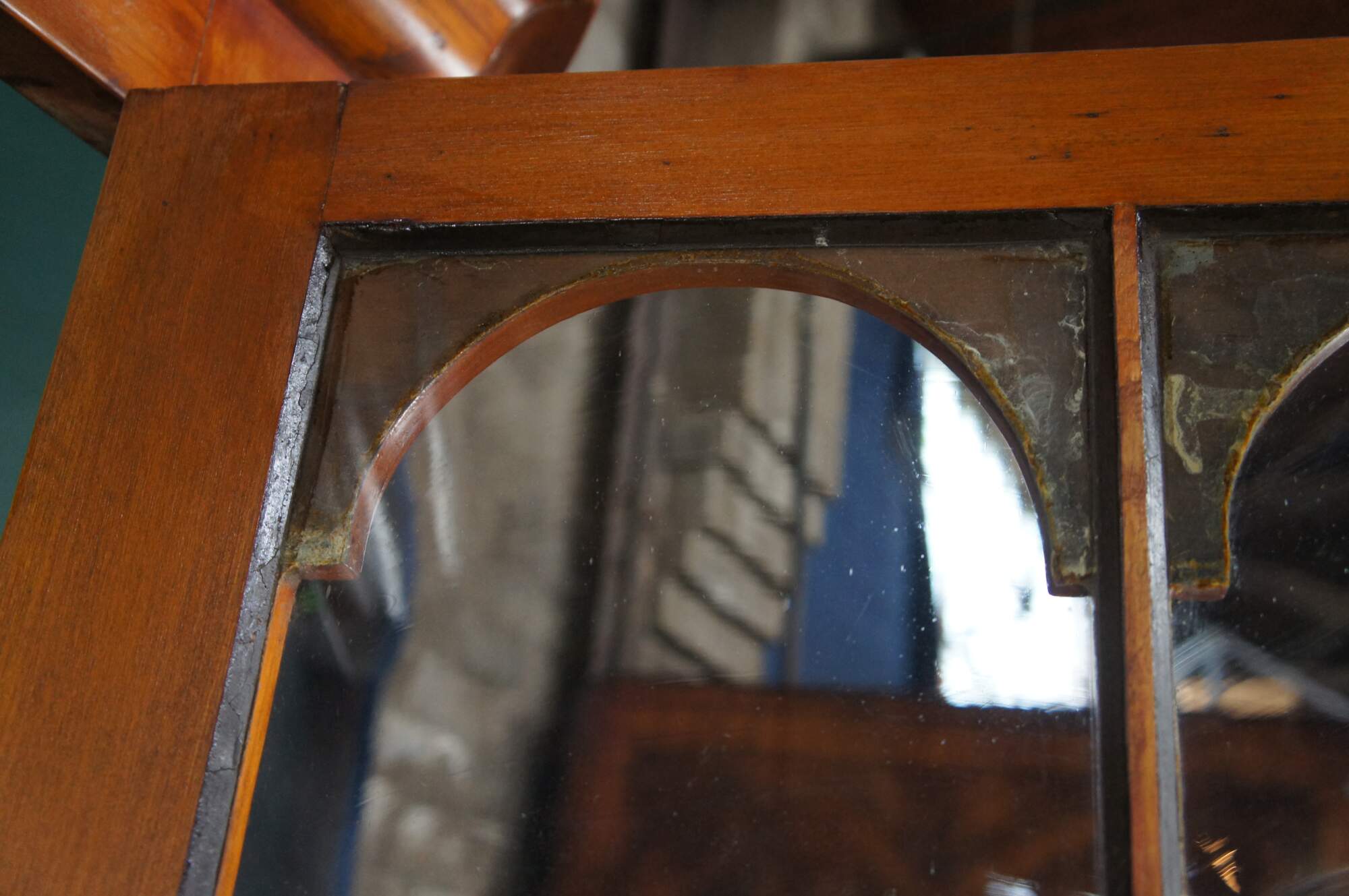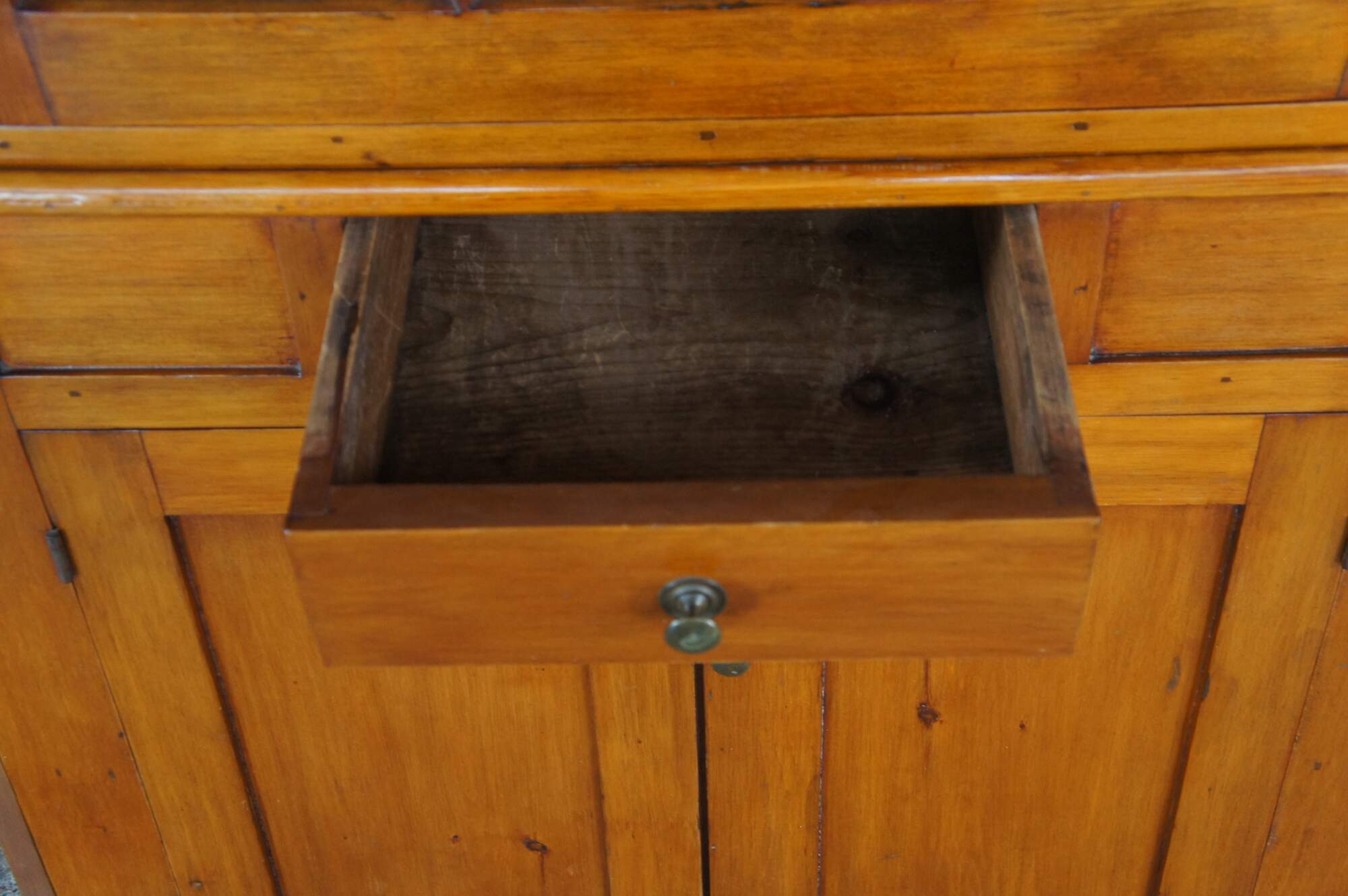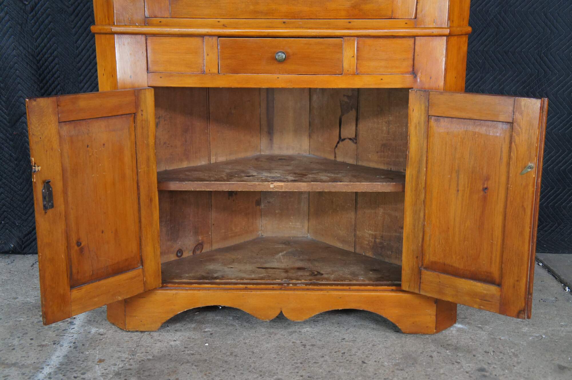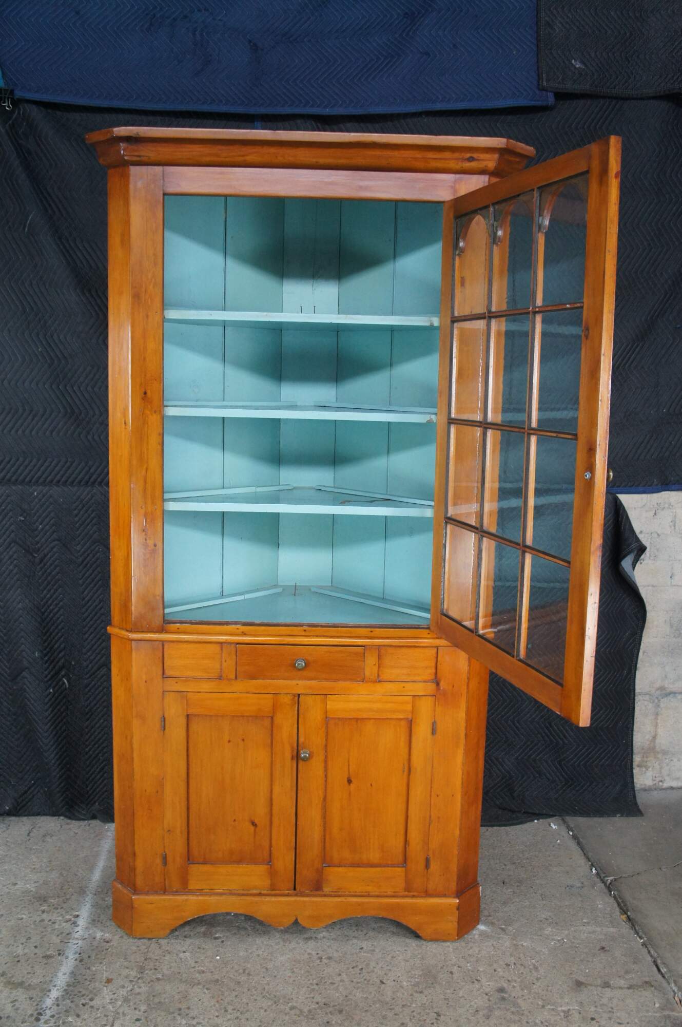 An antique early 19th century American primitive country farmhouse corner cabinet. Made of pine featuring a large 12 pane rolled glass arcaded door that opens to a blue painted interior with four shelves and plate grooves, supported by a lower cabinet with a central drawer.