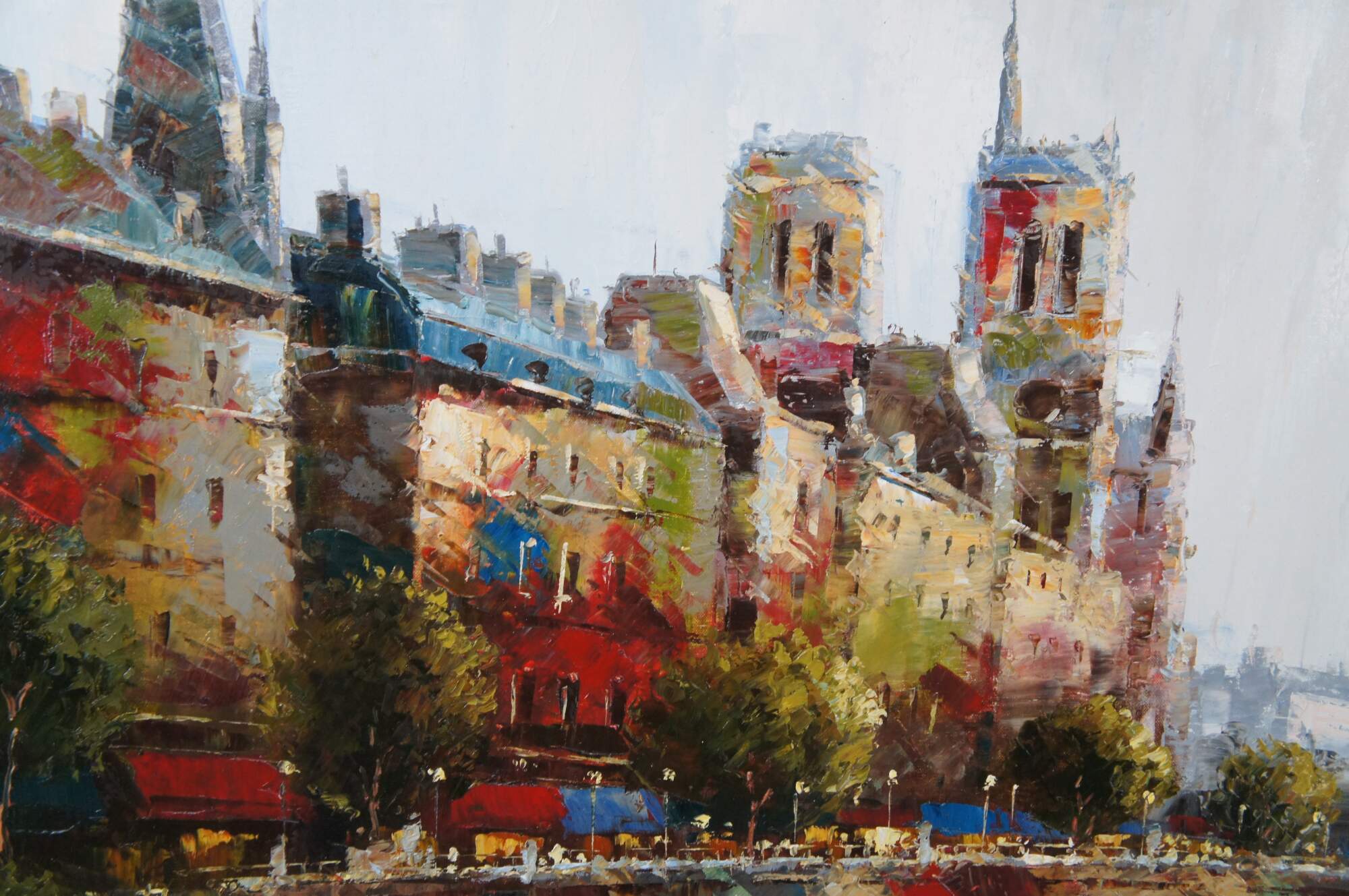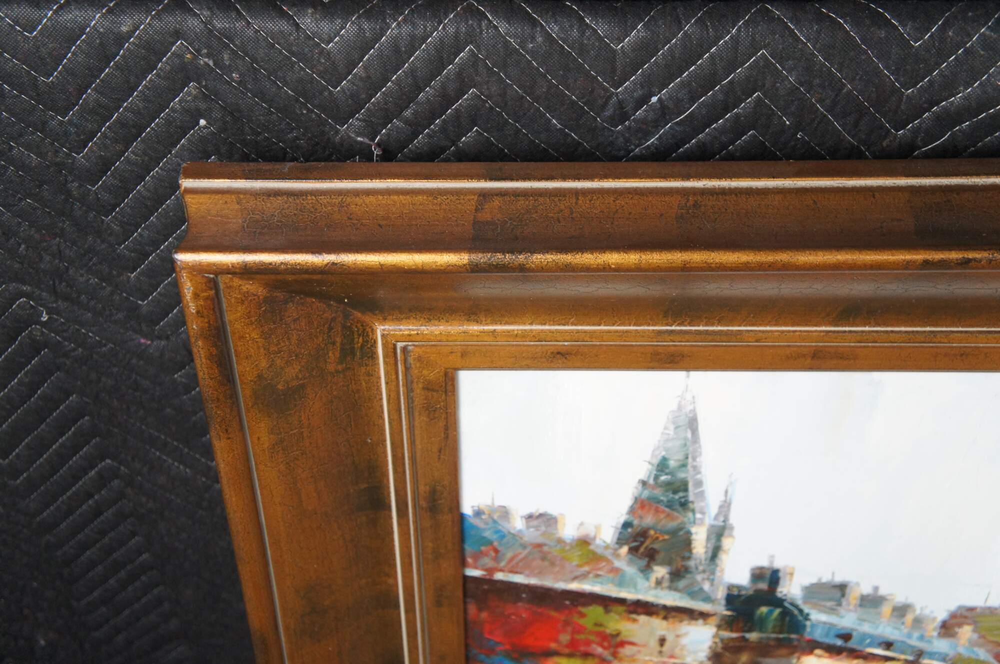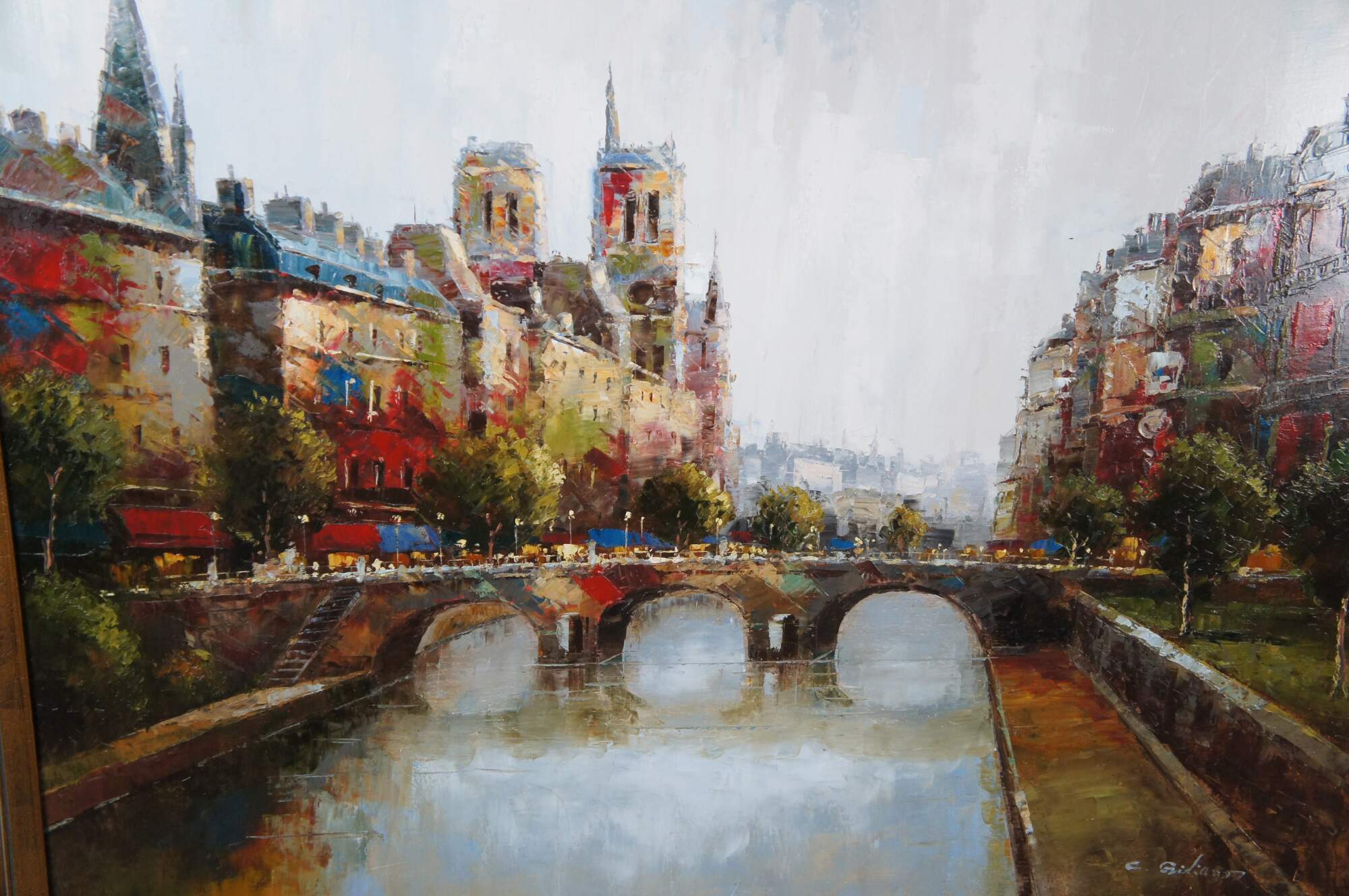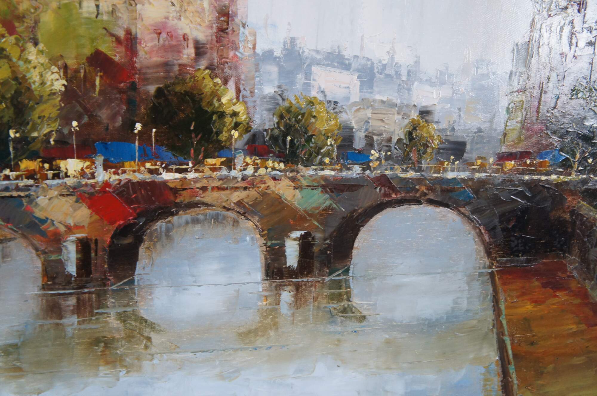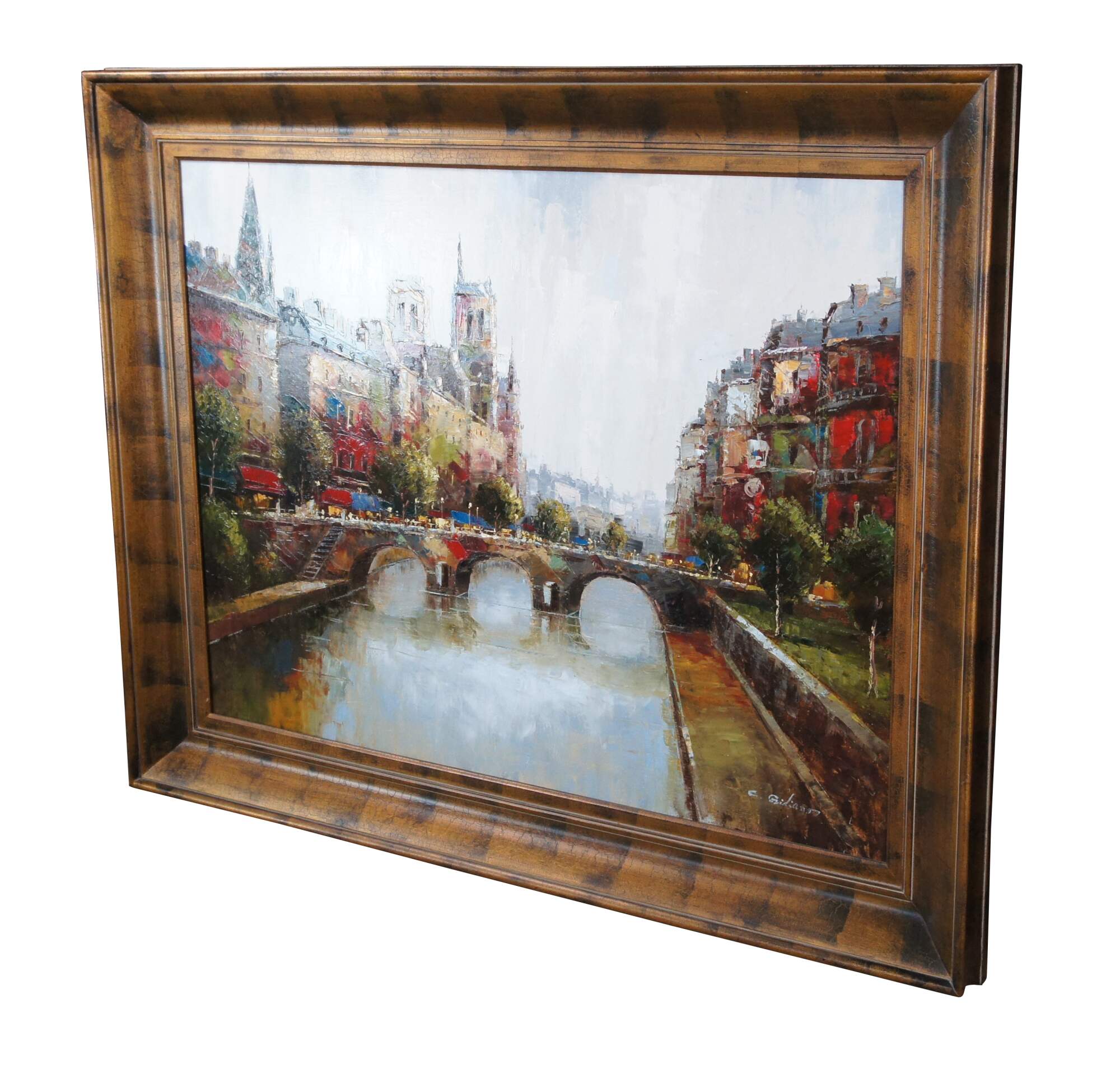 A beautiful Parisian cityscape painting by the Italian Contemporary painter C. Giliano. Features a view down the river near an arcaded bridge flanked by colorful buildnigs and steeples. The oil painting is on canvas and signed along the lower right. The canvas is framed in gold and black with a natural craquelure. A beautiful addition to any space.