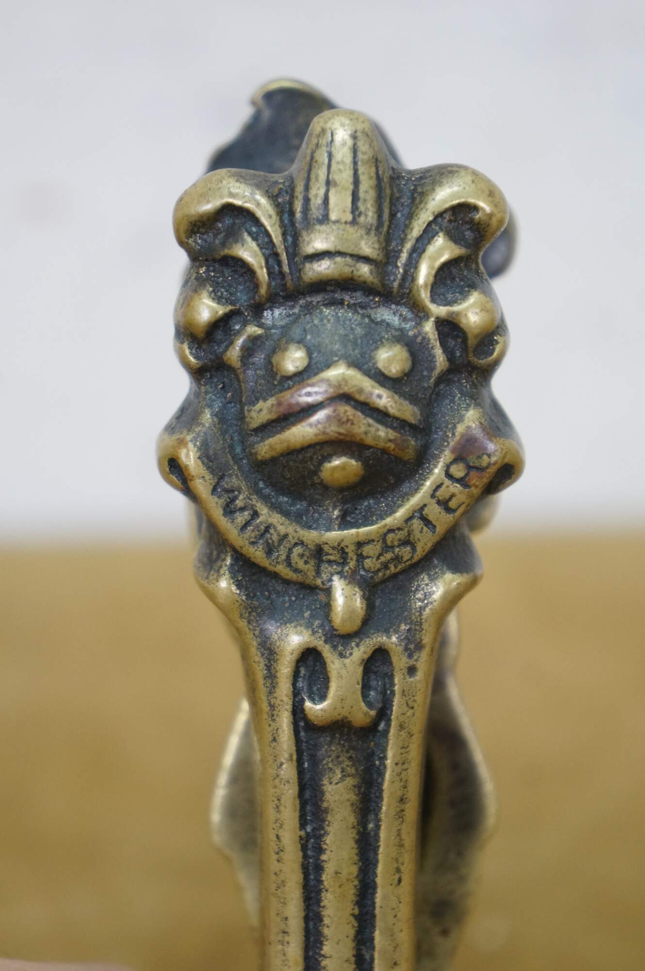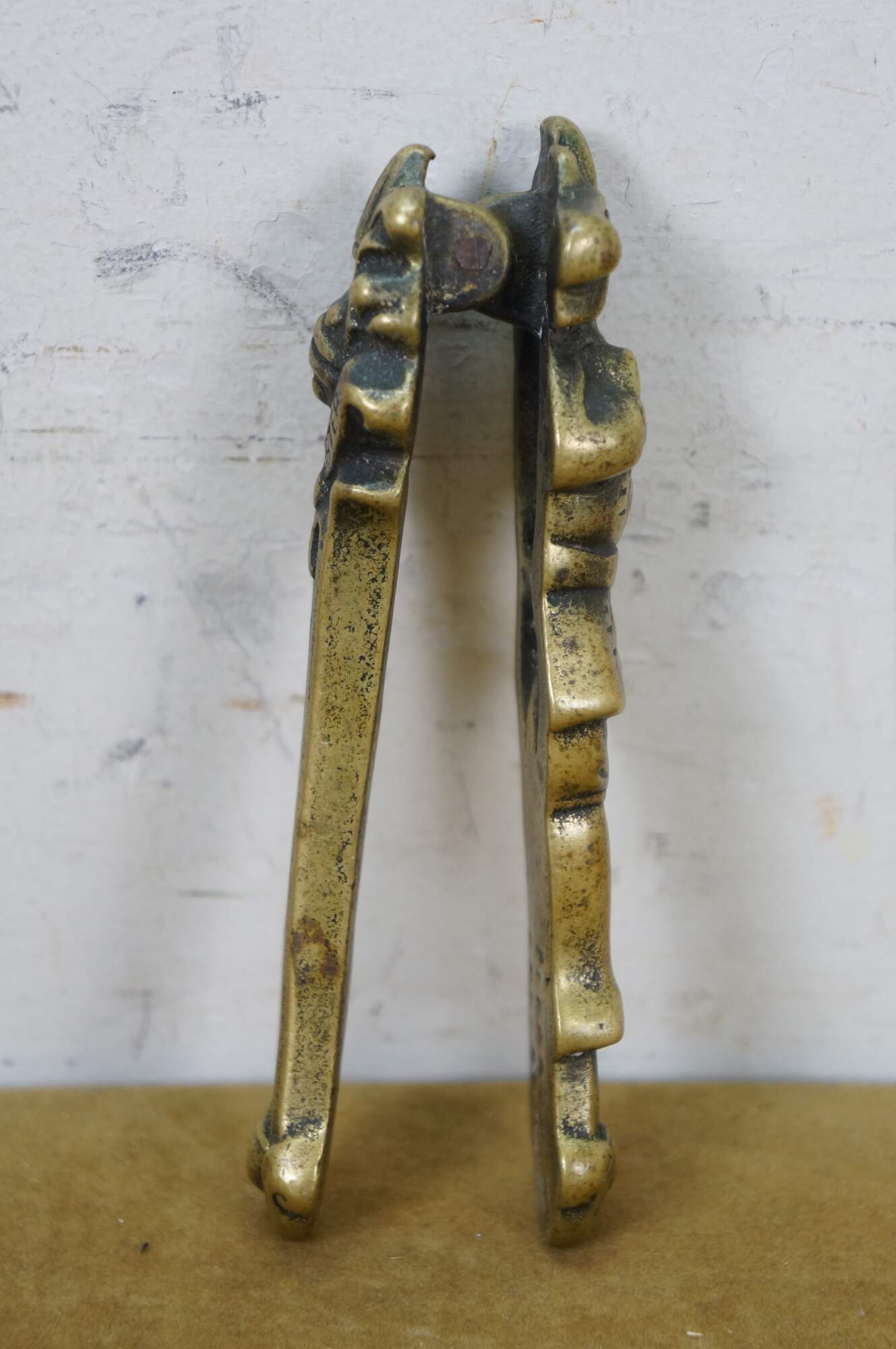 Pair of vintage 20th Peerage brass nutcrackers. One features traditional British puppet show characters Mr. Punch and Judy. the other features an anthropomorphic goat standing over the legend "Trusty Servant" one one side and a armorial design over "Winchester" on the other.
