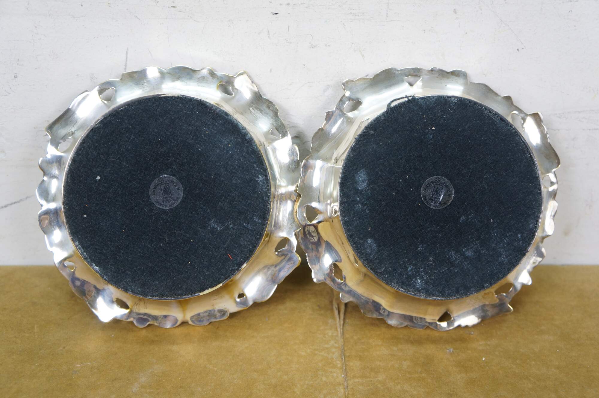 Pair of late 20th century William Adams silverplate wine bottle coasters. Pierced grapevine pattern upper edge with black interior bases. William Adams - A Towle Company - Made in India.