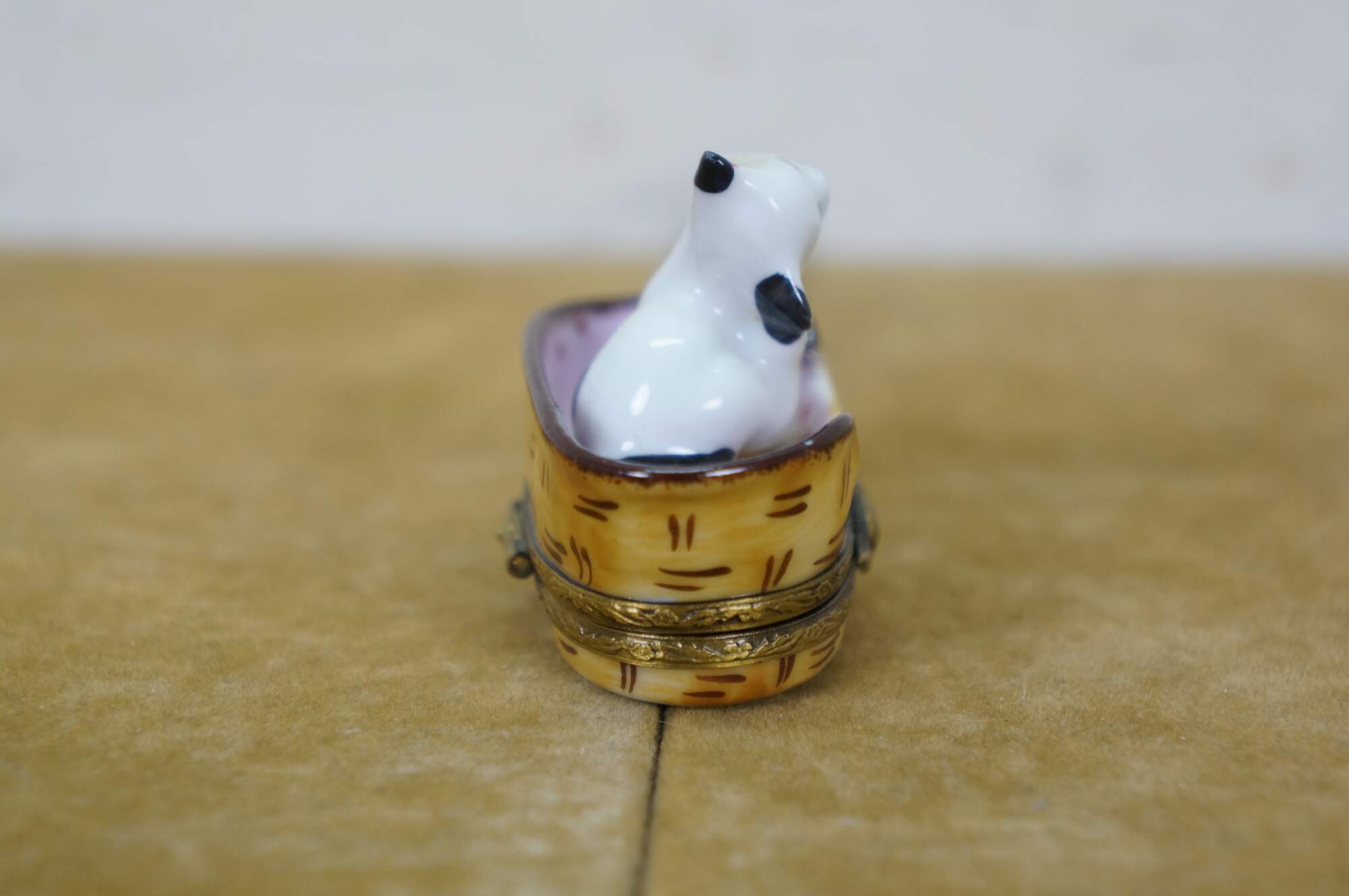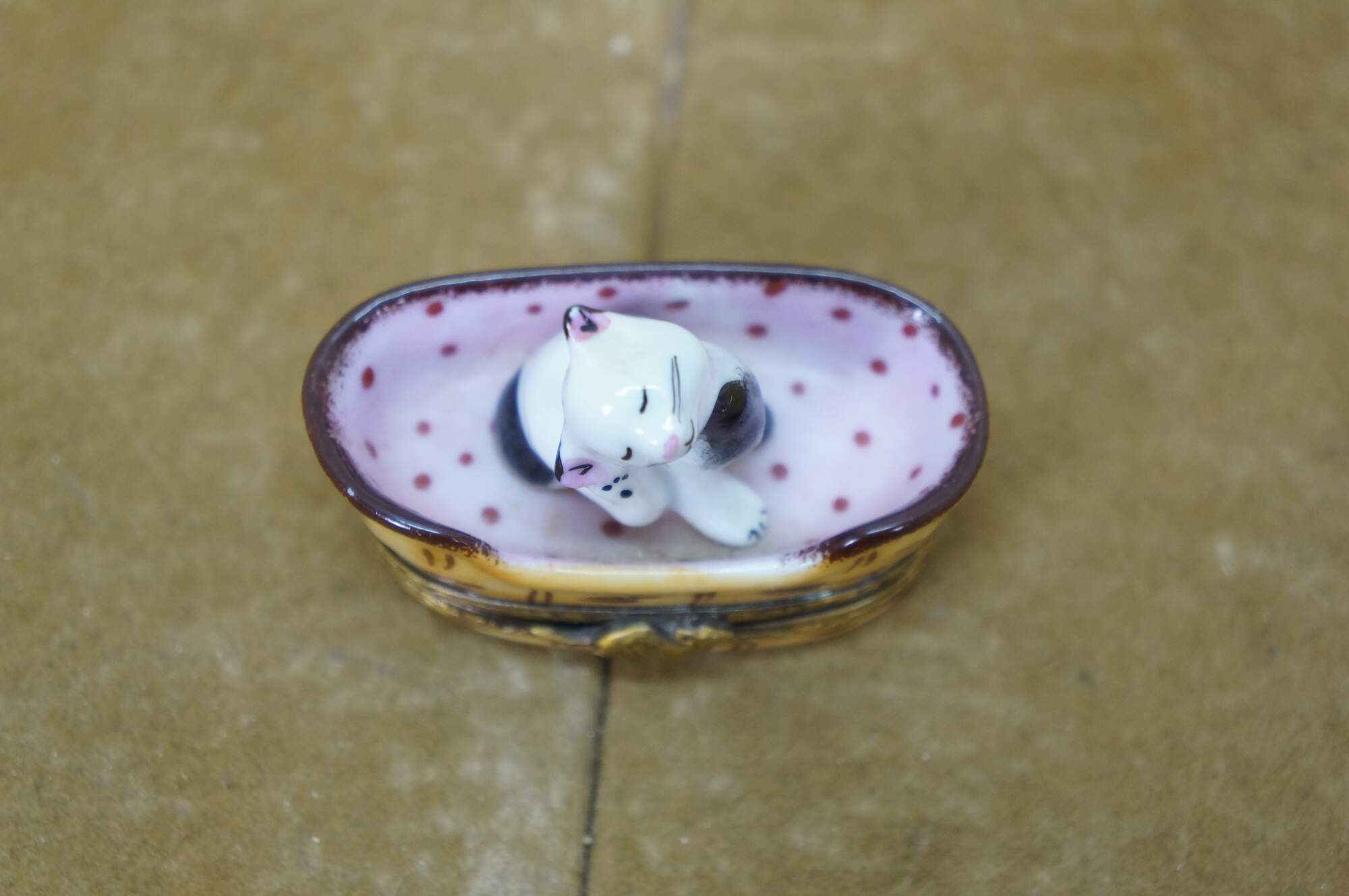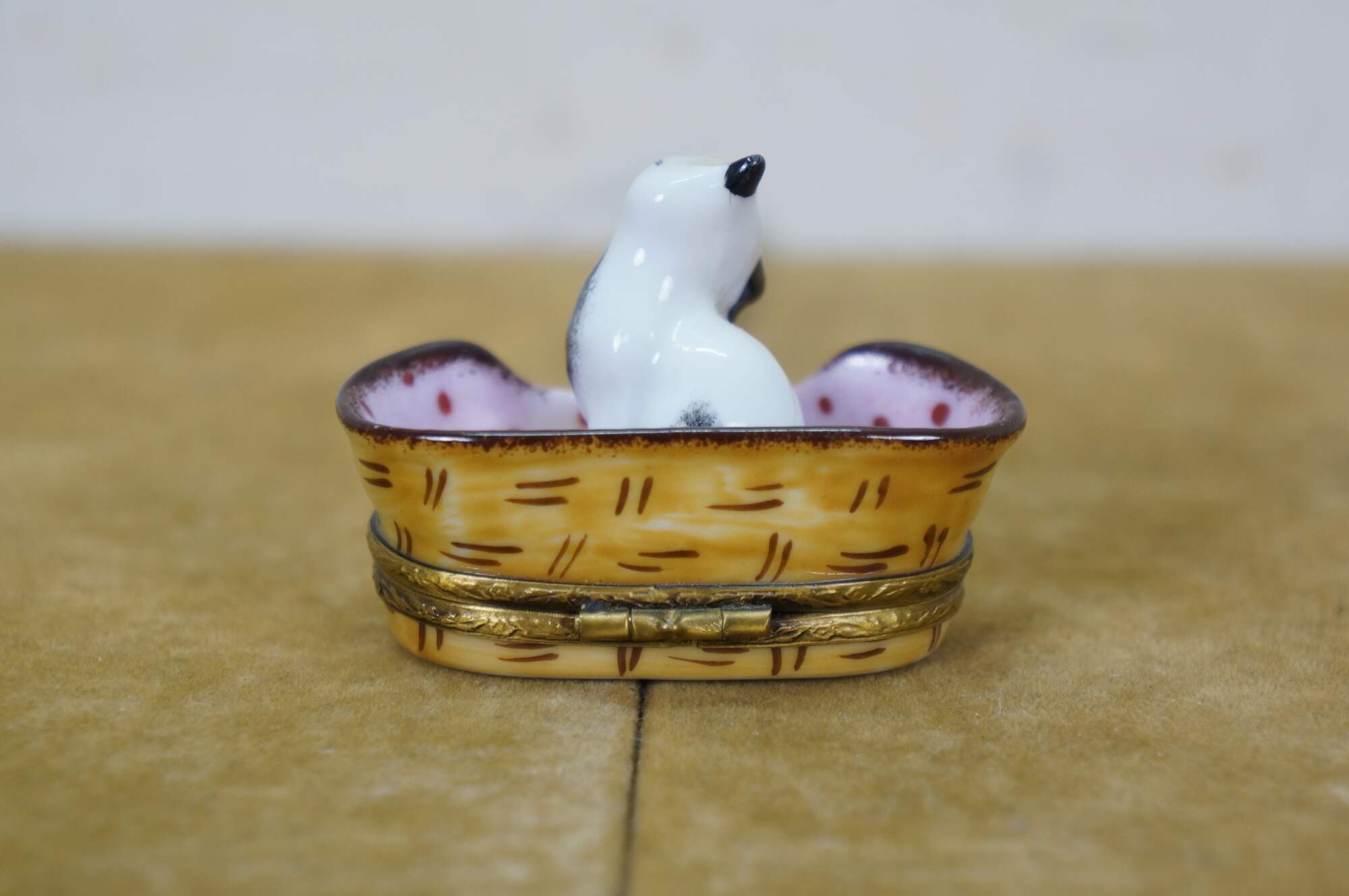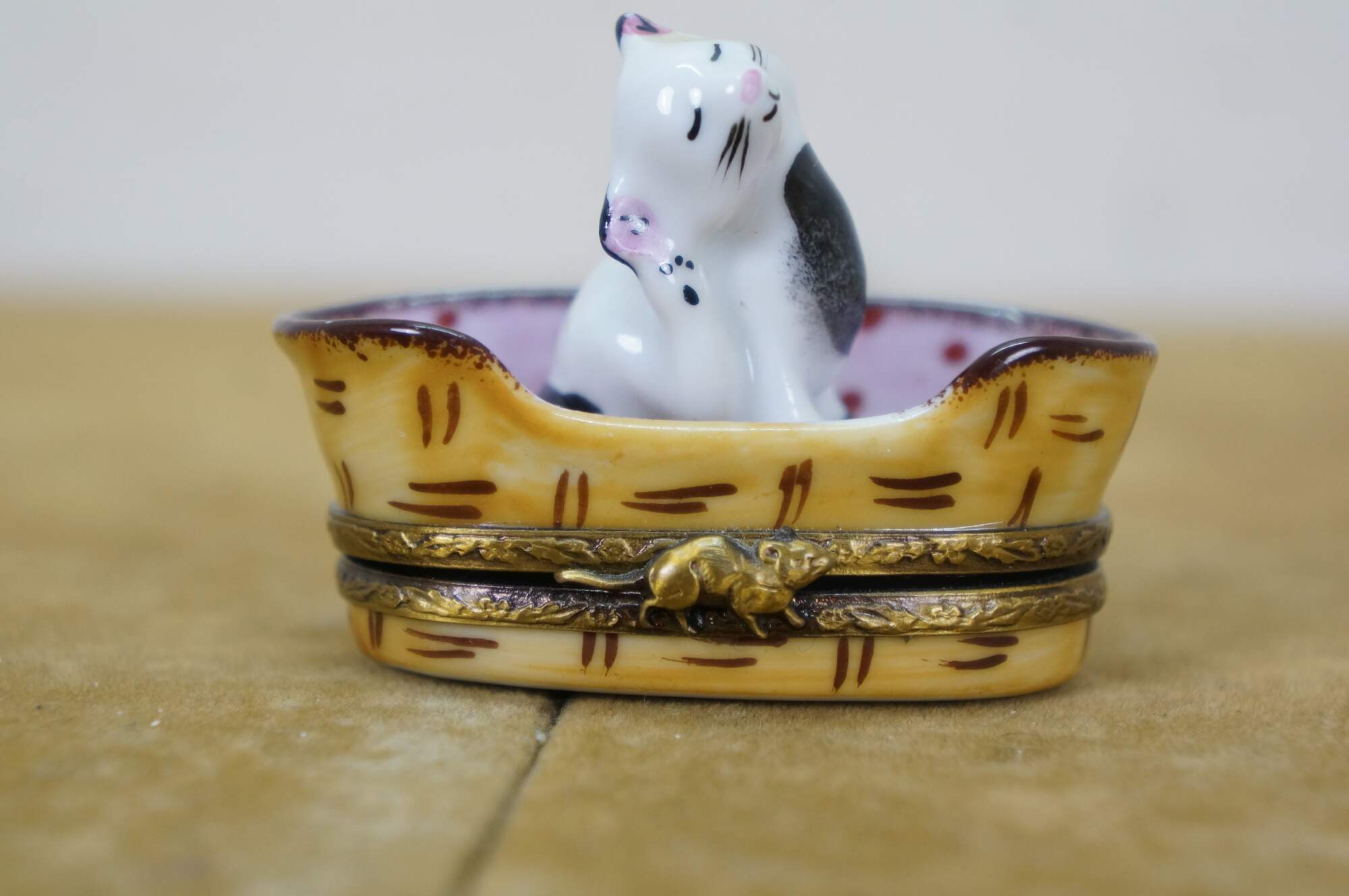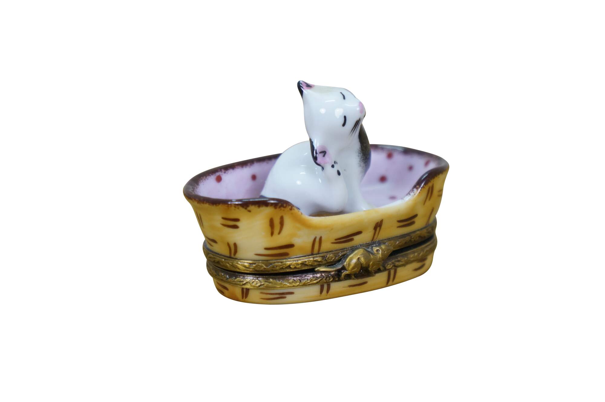 Late 20th century Limoges porcelain trinket / keepsake box in the shape of a black and white kitten scratching its ear, seated in a pink polka dot lined cat basket. Basket hinges at the base with foliate brass bands and a mouse shaped clasp. Ball of yarn painted inside. Peint main - Limoges France - GR.