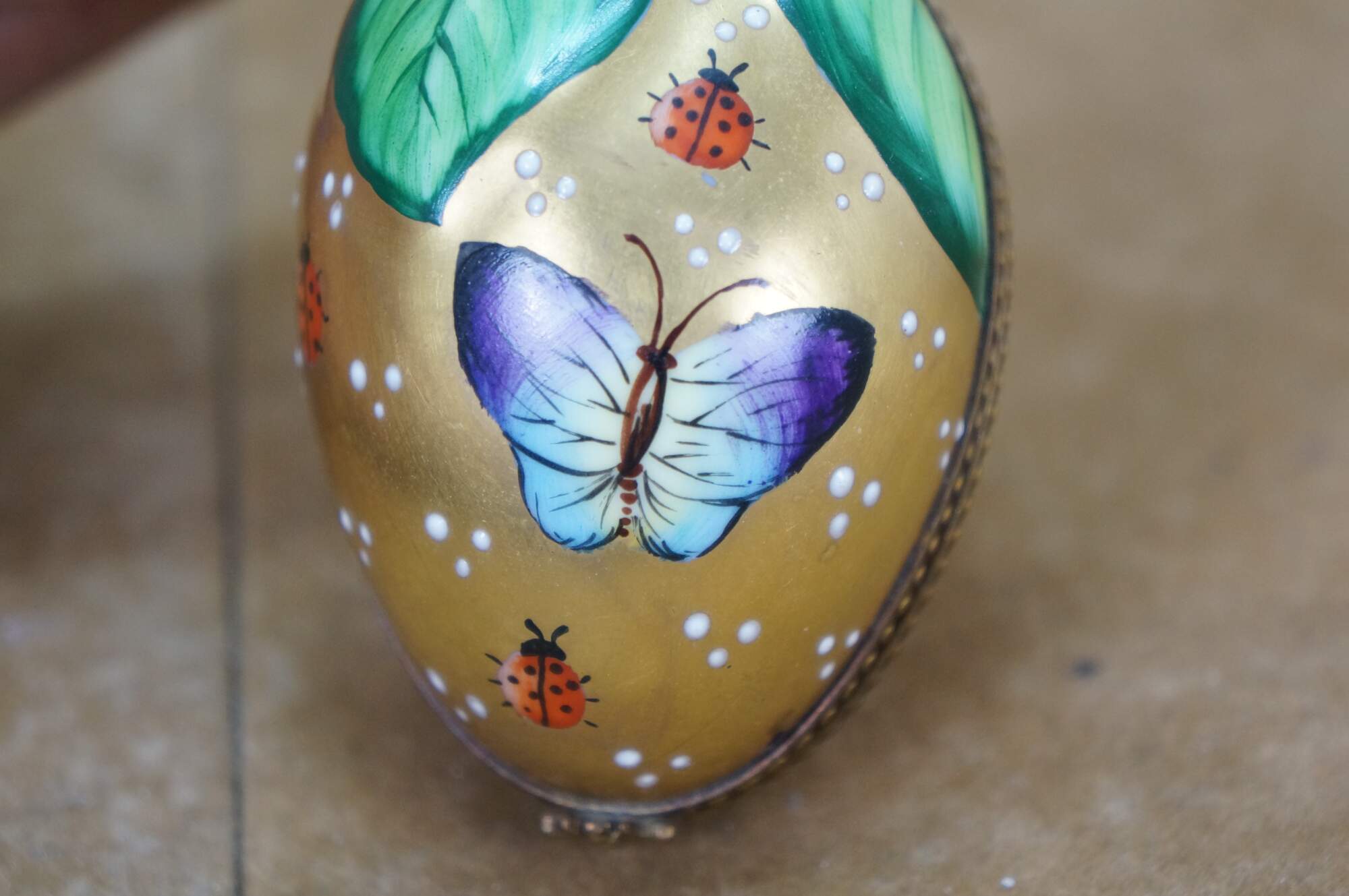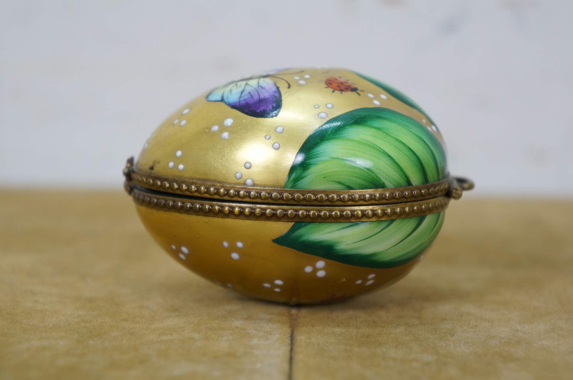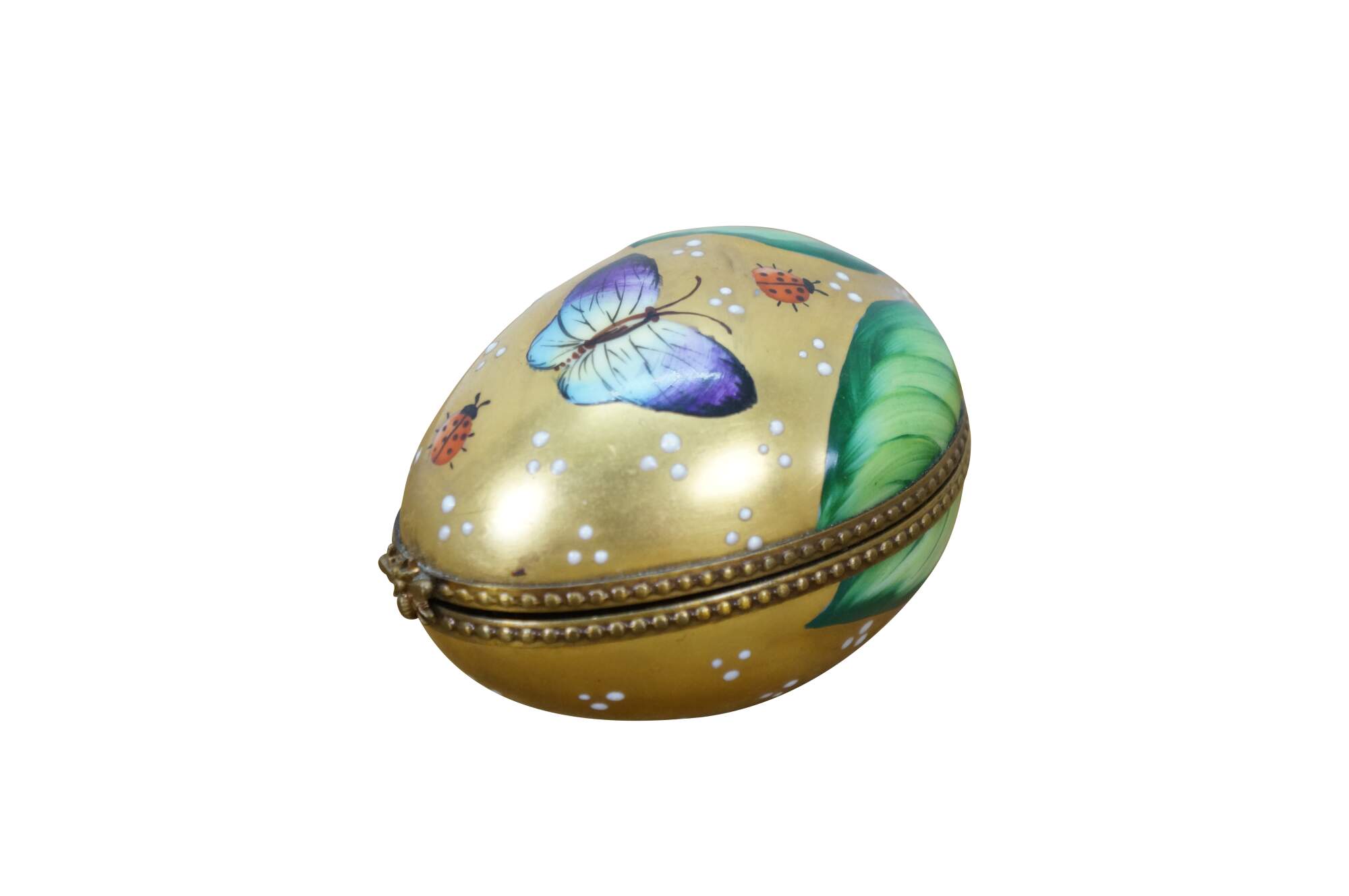 Late 20th century Limoges porcelain trinket / keepsake box in the shape of an egg, hand painted in gold with greens leaves, a purple and blue butterfly, and red ladybugs. Hinges longways at the middle with eaded brass bans and a bee shaped clasp. Limoges France - Peint Main P.V.