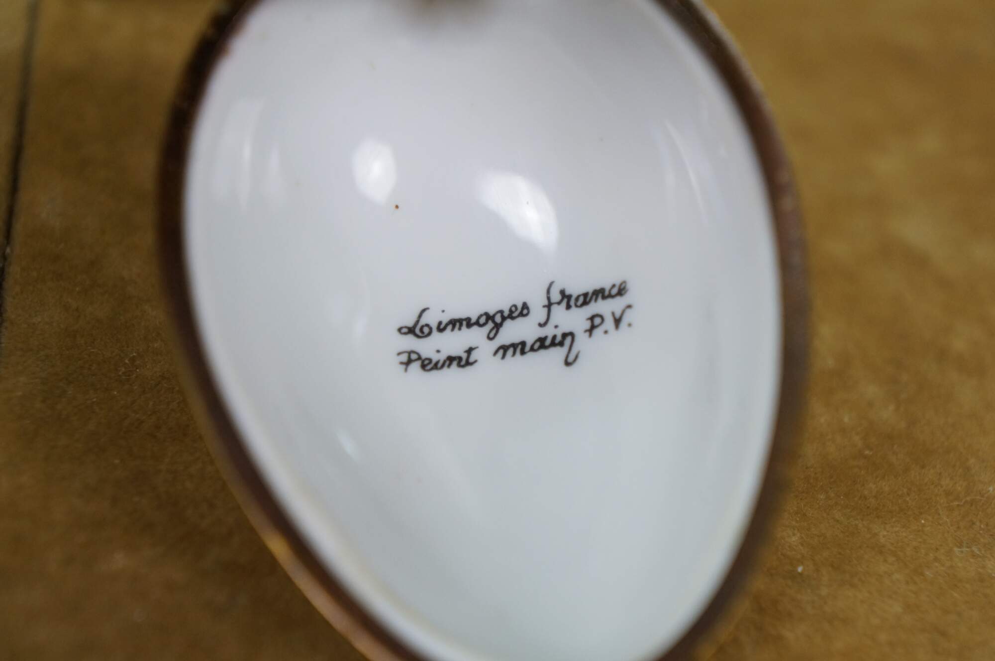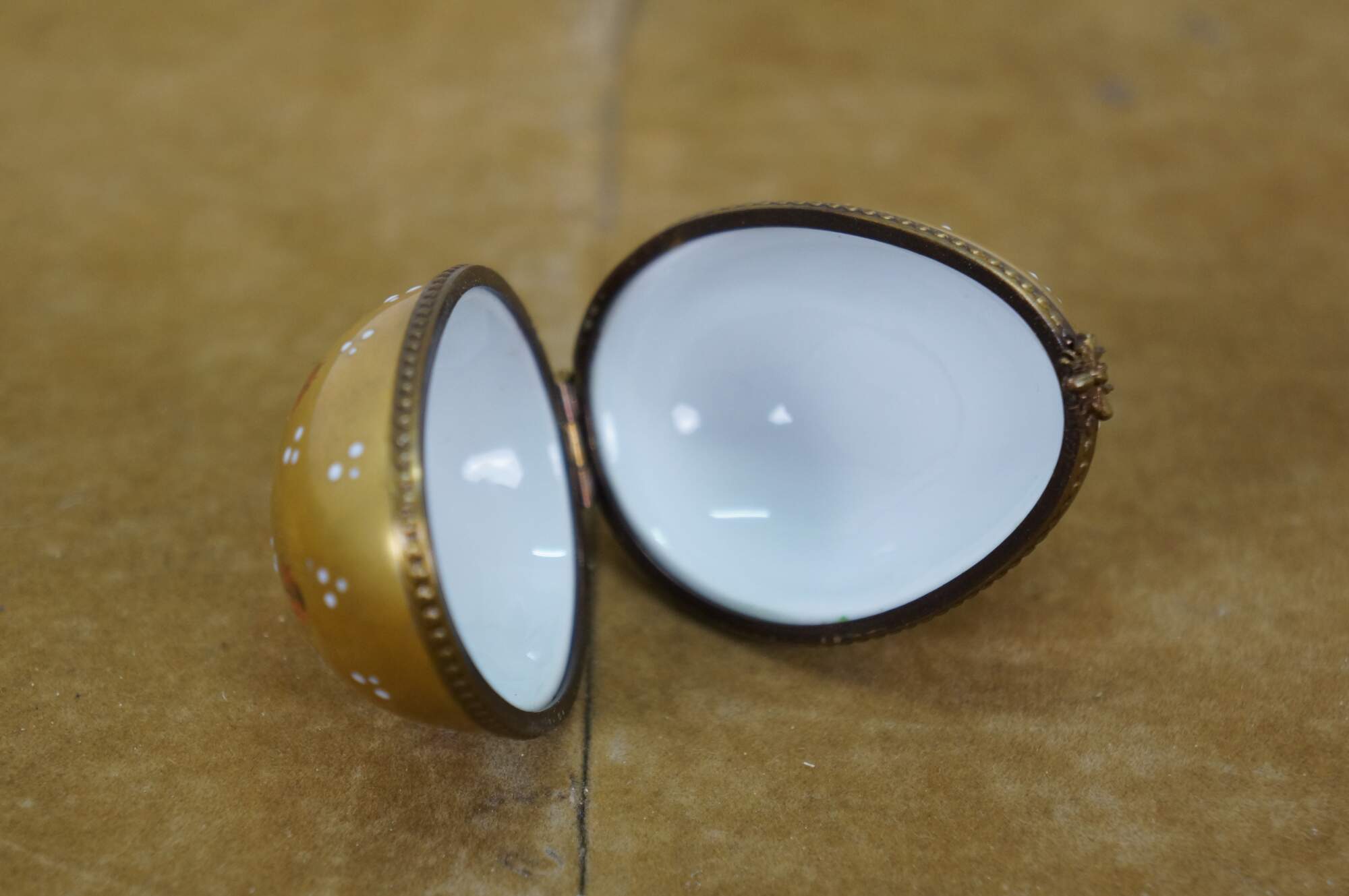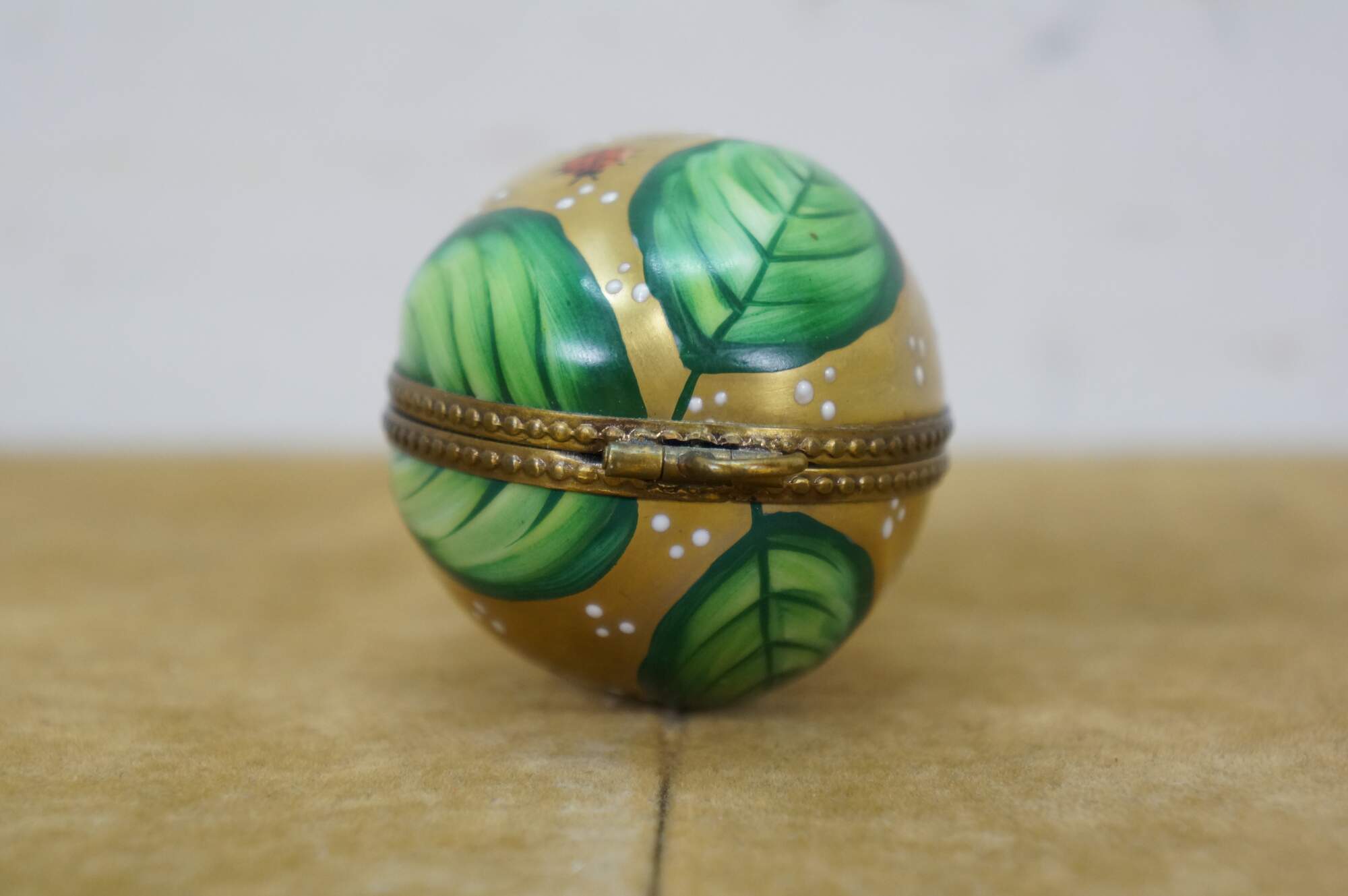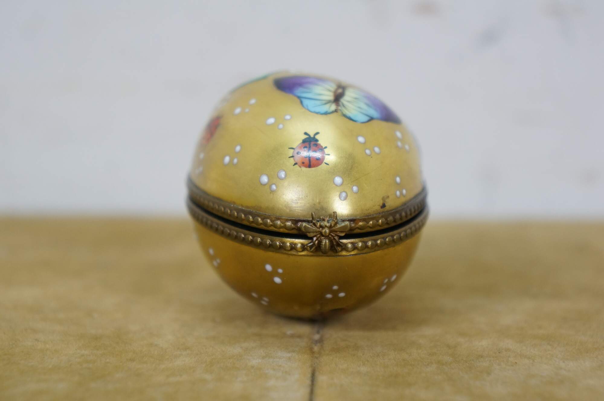 Late 20th century Limoges porcelain trinket / keepsake box in the shape of an egg, hand painted in gold with greens leaves, a purple and blue butterfly, and red ladybugs. Hinges longways at the middle with eaded brass bans and a bee shaped clasp. Limoges France - Peint Main P.V.