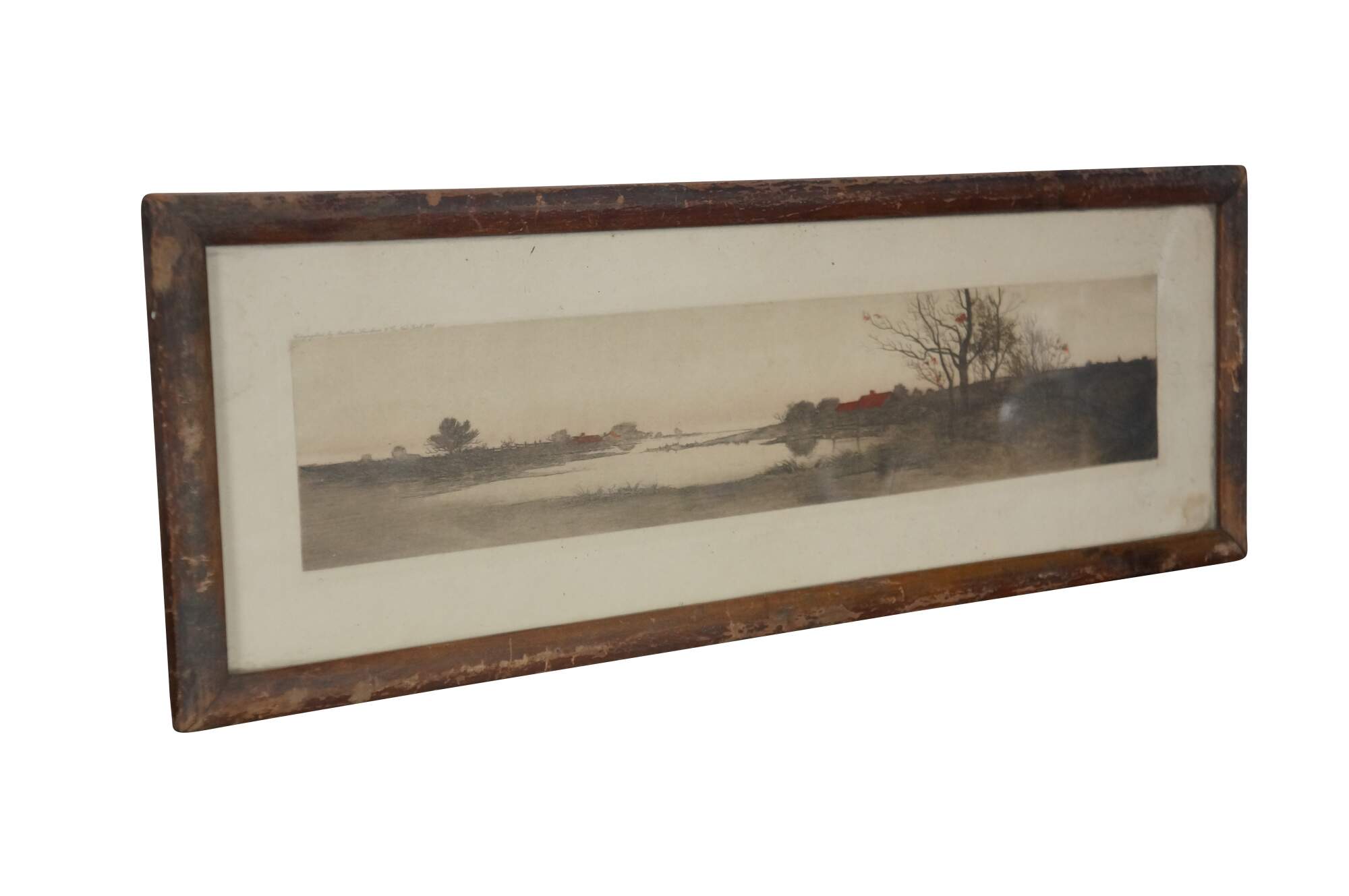 Late 19th century Ernest C Rost panormaic country landscape etching featuring red roofed barns / farmhouses around a pond / lake. Copyrighted by Radtke, Lauckner & Co, New York, 1890. Wood Frame; no mat.