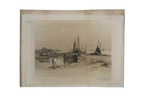 Late 19th century black and white etching on silk by Charles Frederick William Mielatz. View of docks and boats in harbor. Copyright 1889, Fishel, Adler & Schwartz, New York. Signed in plate Chas. FW Mielatz 89. Pencil signed, lower right. Silk on cardstock; un-framed.