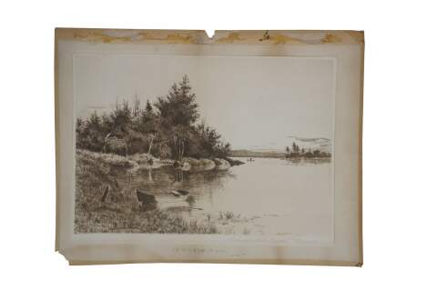 Late 19th century black and white etching titled "Evening on Lake Oneida" by Rominer Lovewell. Landscape featuring row boats on the tree lined edge of Lake Oneida. Copyright 1891 by Fishel, Adler & Schwartz, New York. Signed in plate R. lovewell, lower left. Title and "Etched by R. Lovewell" printed, lower right. Paper on cardstock; un-framed.