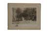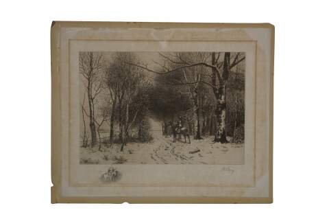 Late 19th century black and white etching titled "the Bugle Call by French artist A Leunig. Landscape of a military soldier on horseback on a forest road, about to bugle at a distance army camp. Signed in plate A. Leunig. Remarke of soldiers on horseback, lower left. Pencil signed, lower right. Paper on cardstock; un-framed.