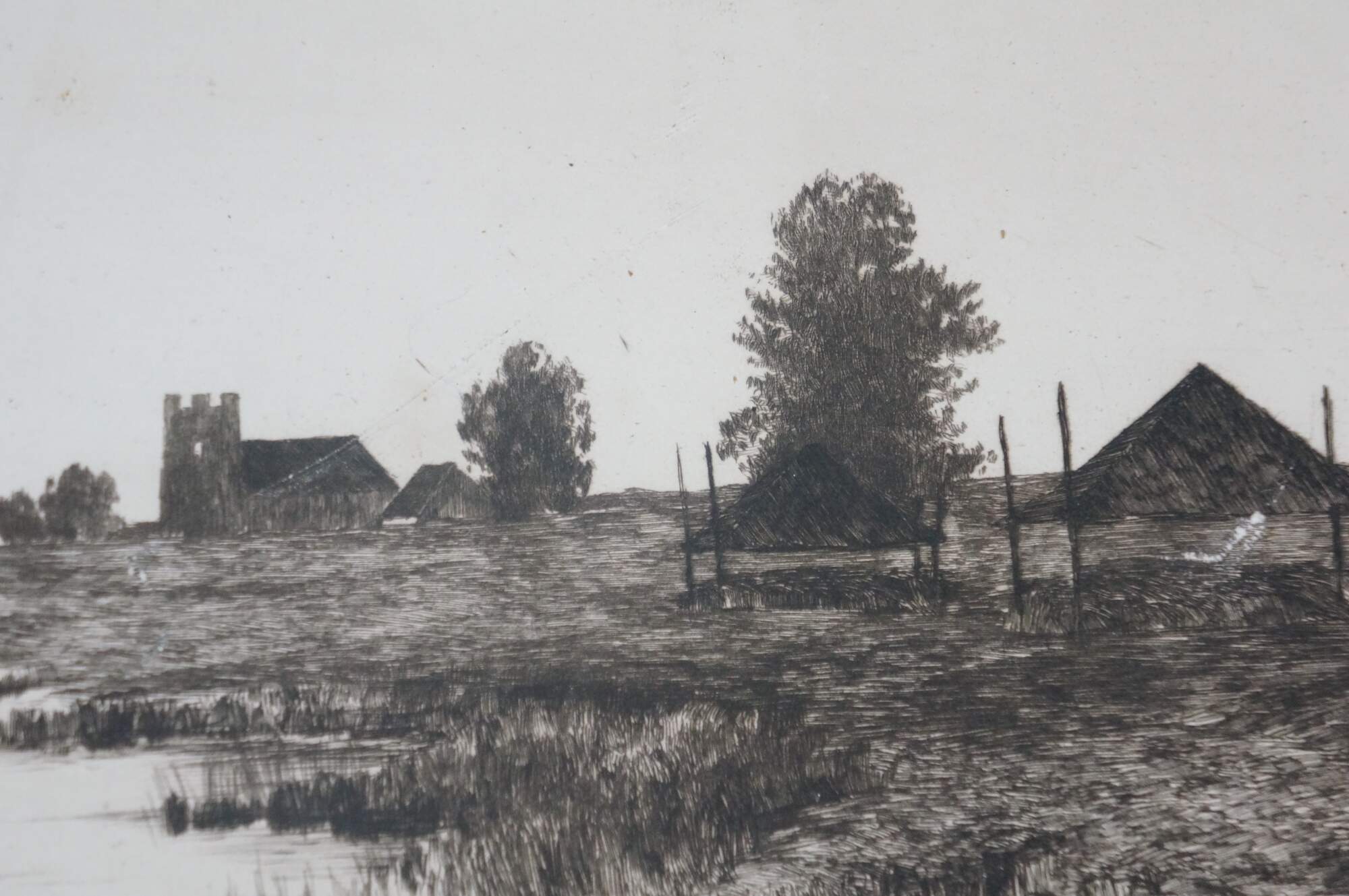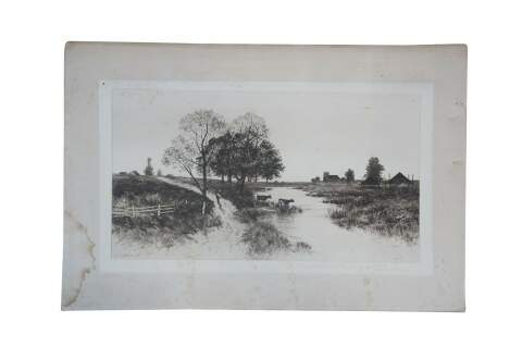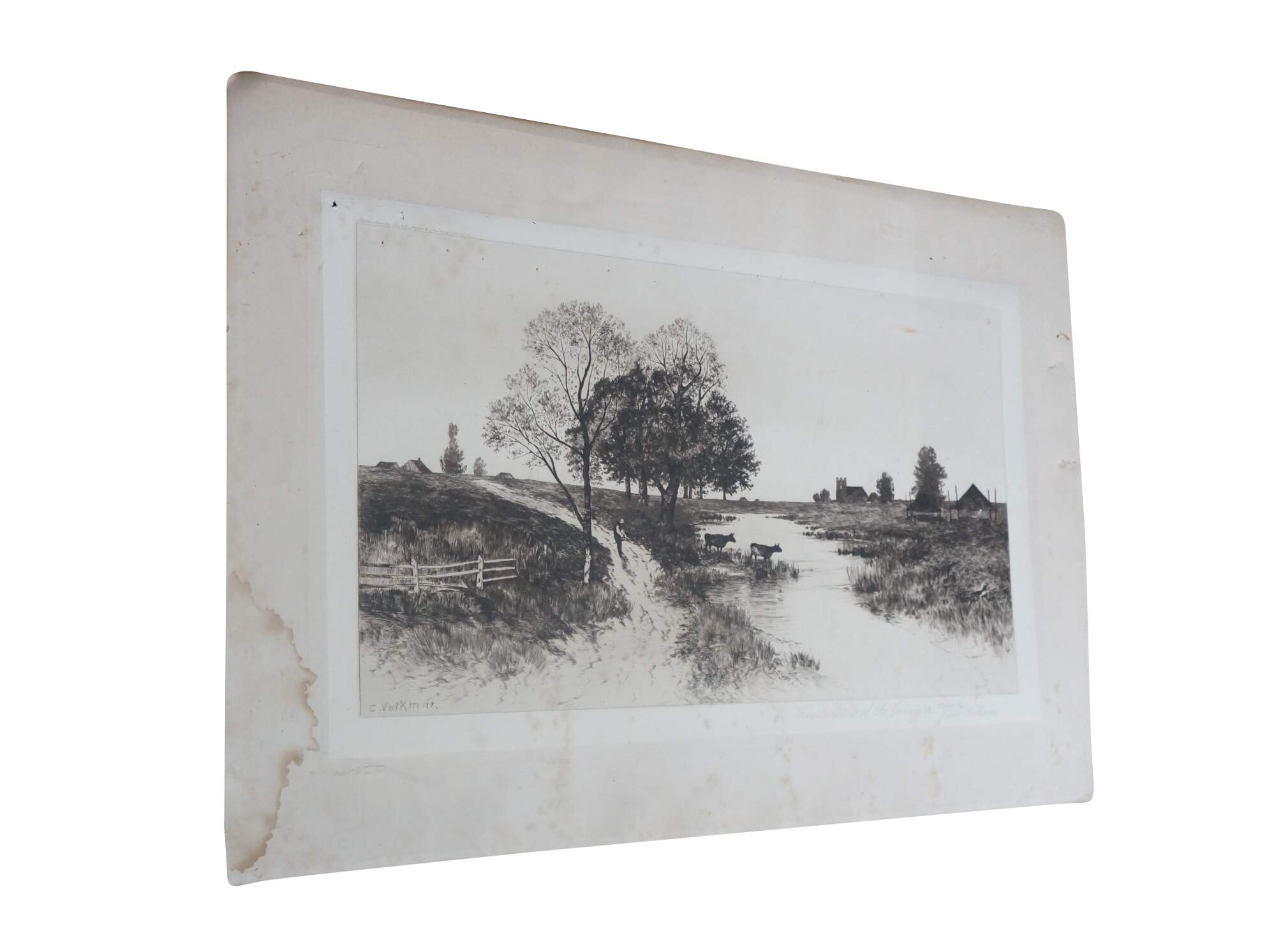 Late 19th century black and white etching titled "Headwaters of the Juniata" by Charles Volkmar. Country landscape with cottages and a pair of cows in a river. Signed in plate C. Volkmar, lower left. Published by Fishel, Adler & Schwartz, New York. Title and "Etched by Chas. Volkmar" printed, lower right. Paper on cardstock; un-framed.
