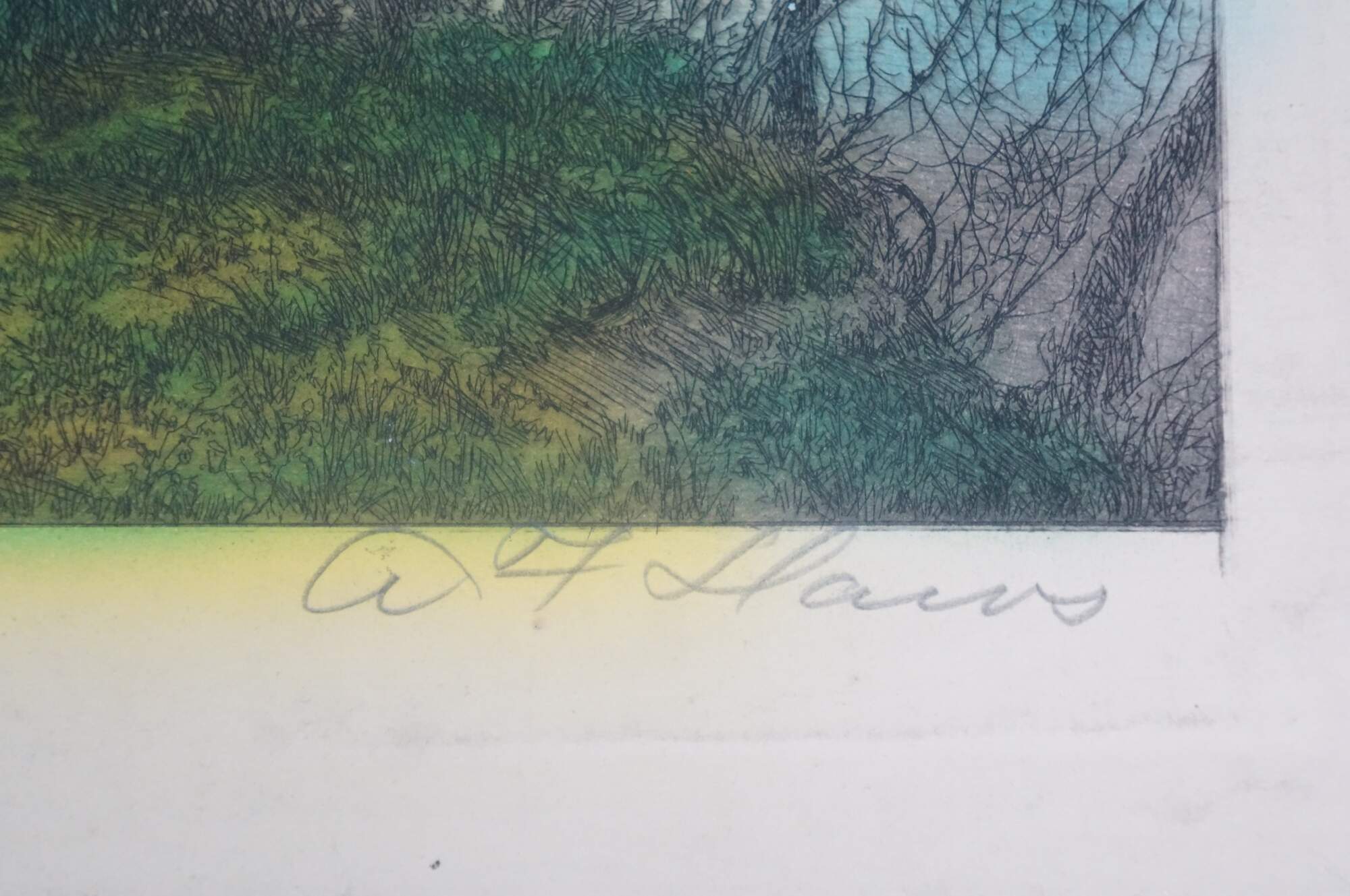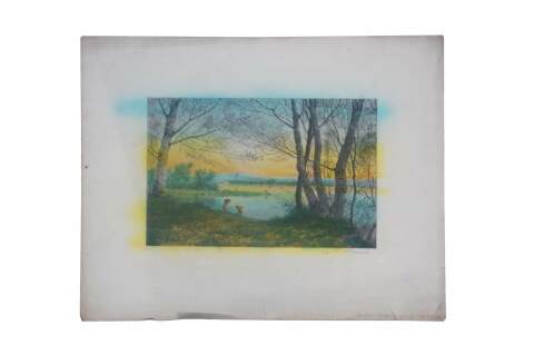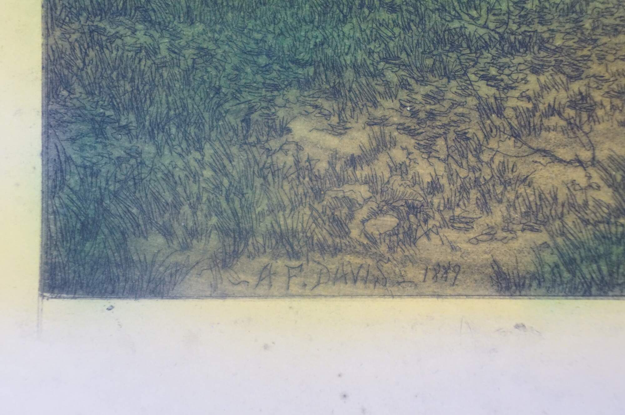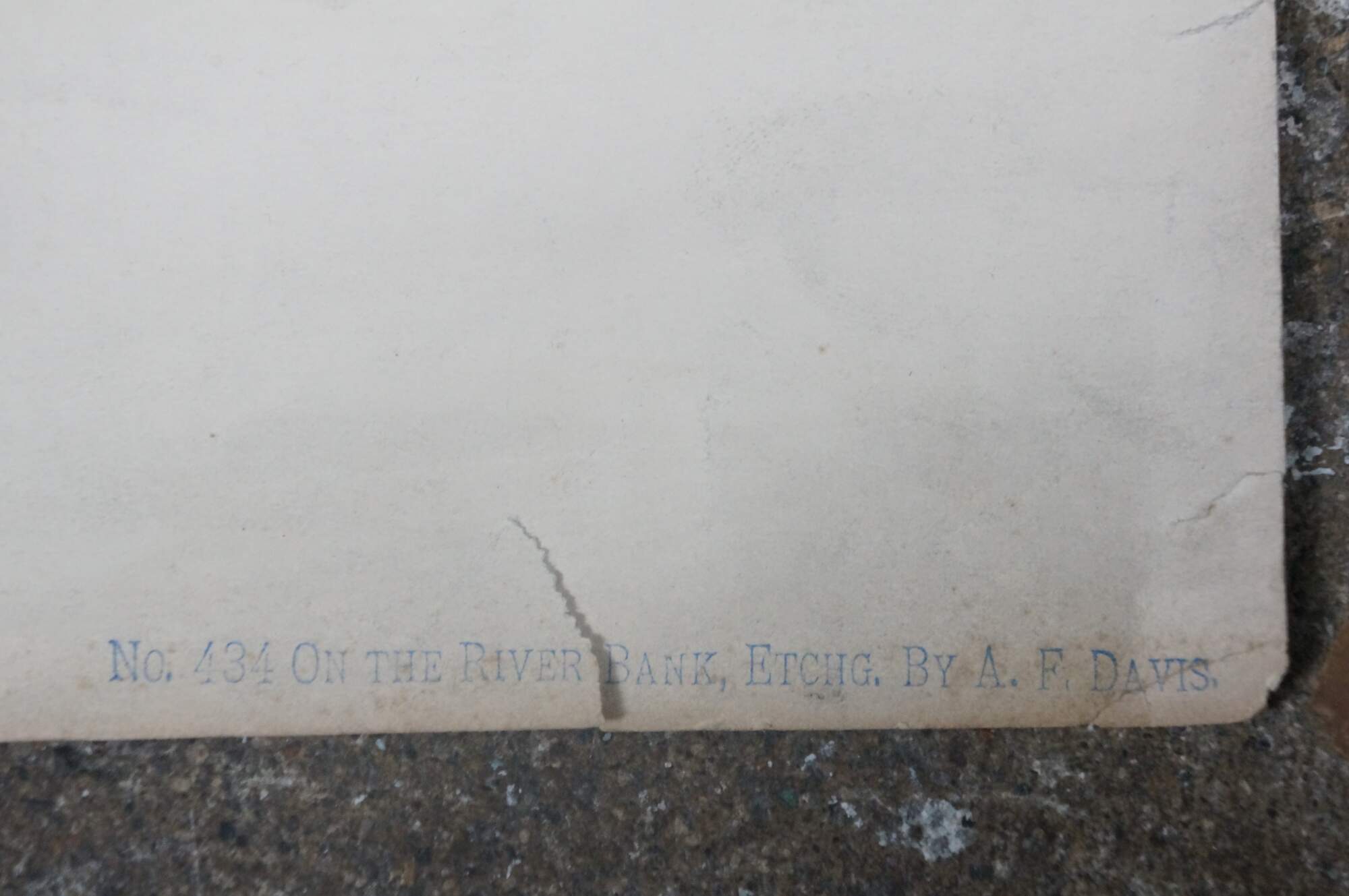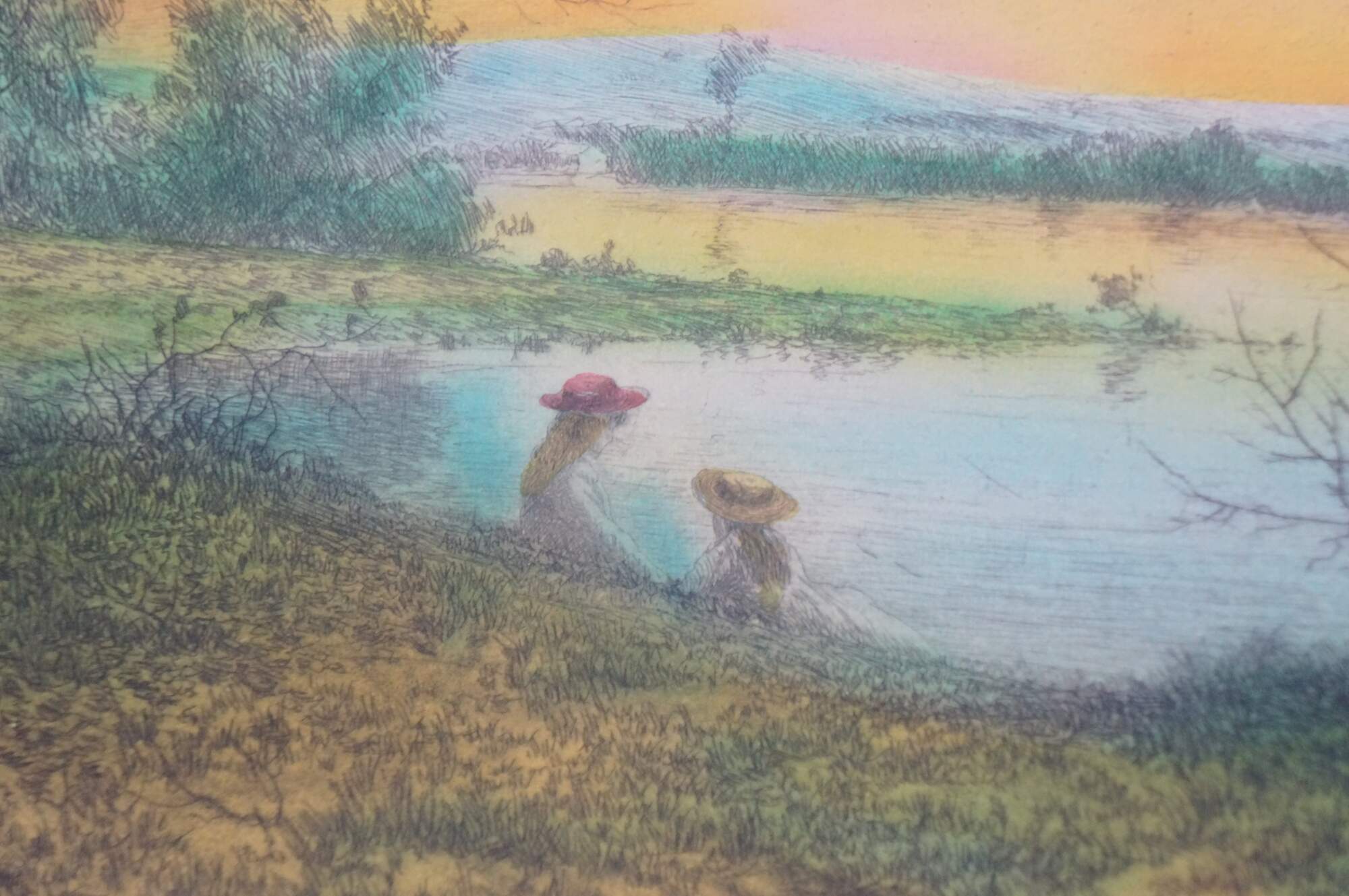Late 19th century hand colored etching titled "On the River Bank" by Arthur Fuller Davis. Landscape showing a pair of young girls seated on a hill above a lake / river. Signed in plate A.F. Davis 1889, lower left. Pencil signed, lower right. "No. 434 On the River Bank, Etchg. by A.F. Davis" printed, lower right edge. Paper; un-framed.