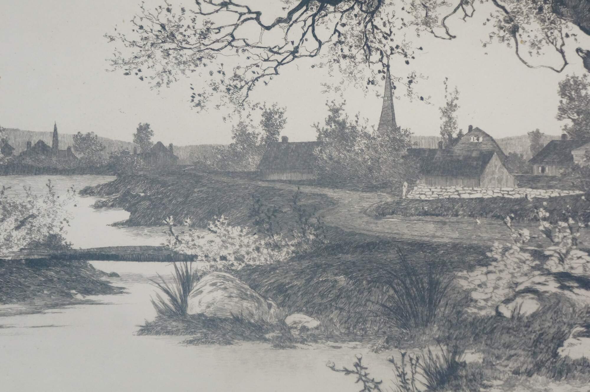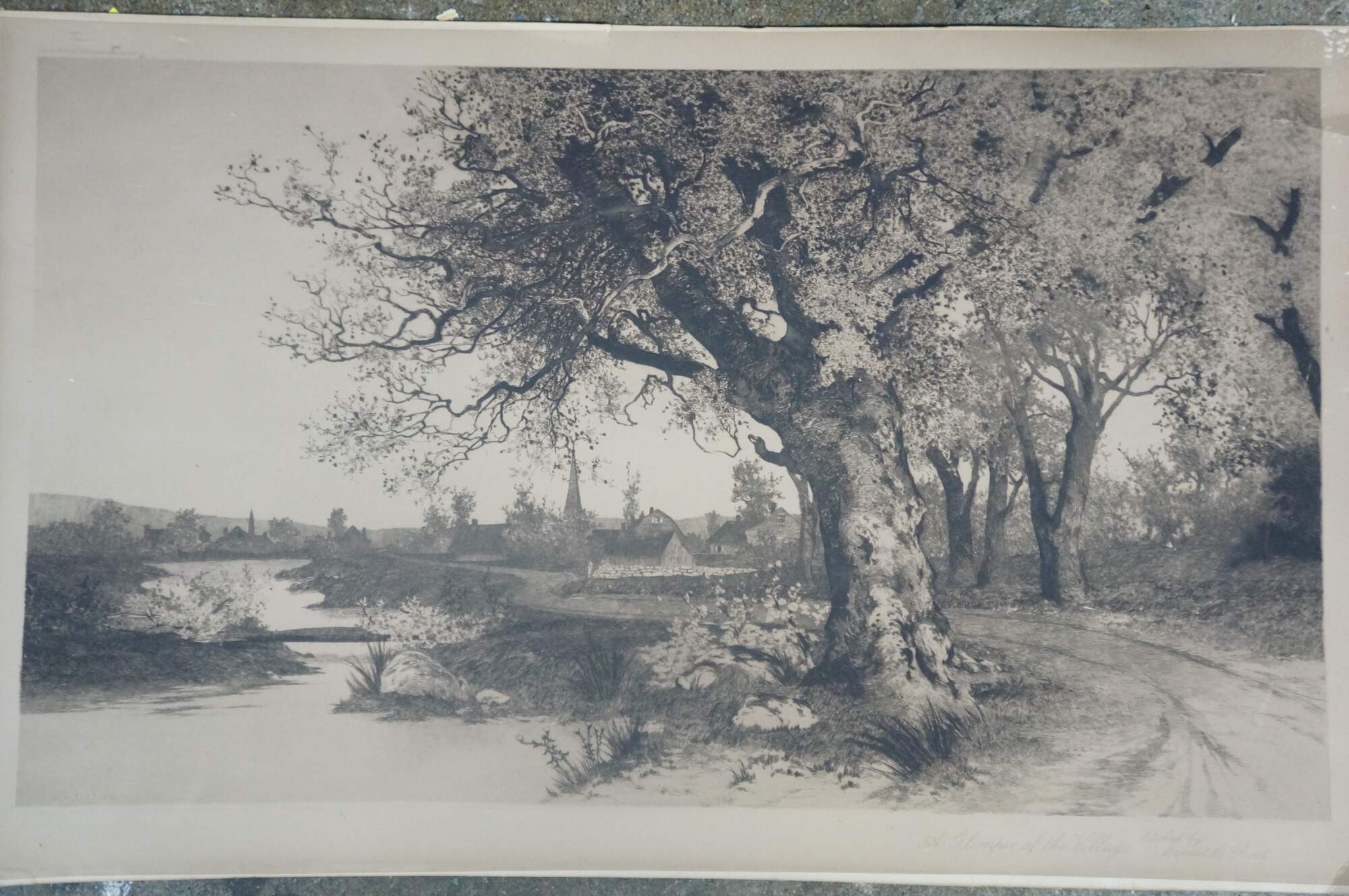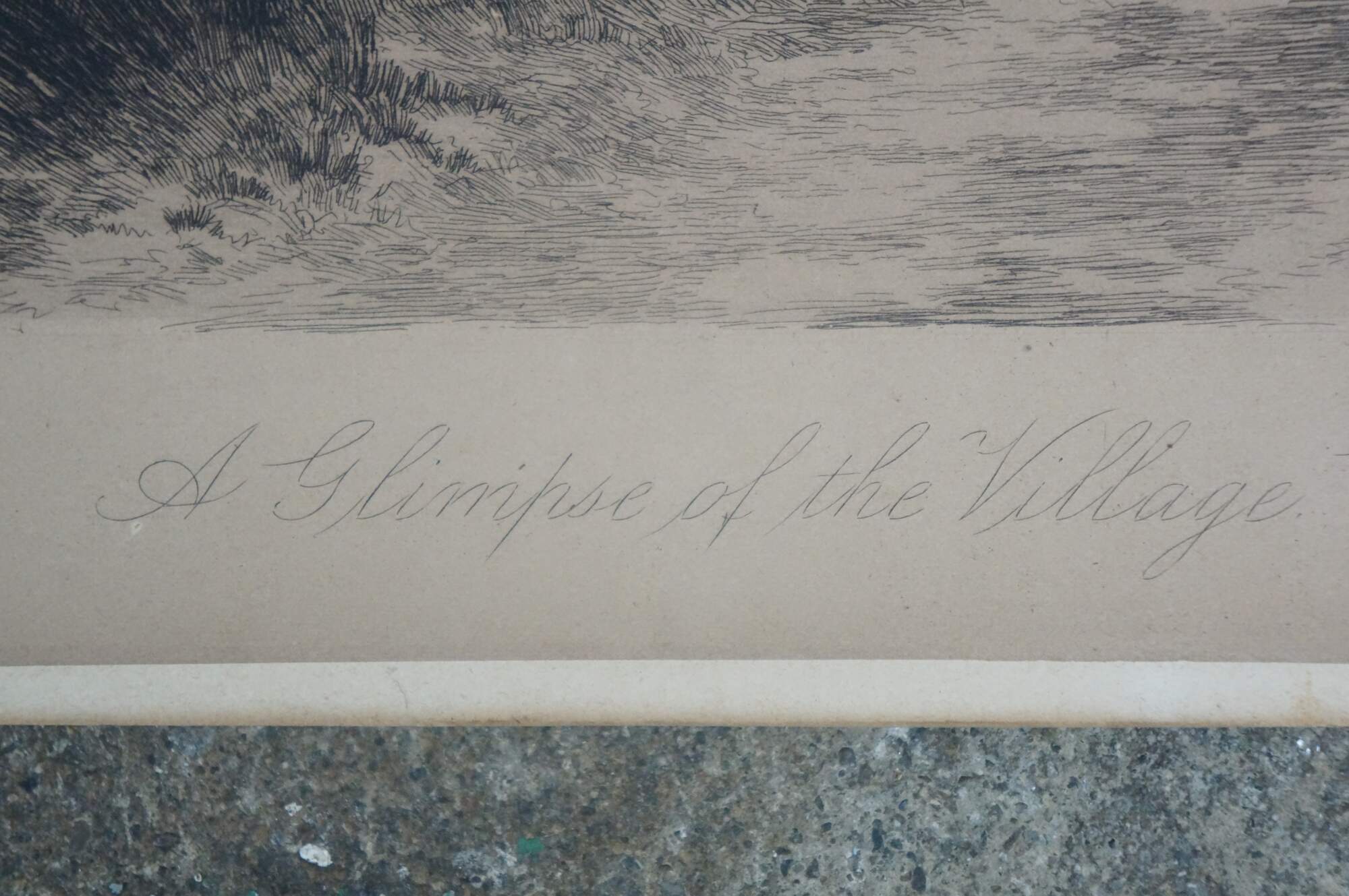 Late 19th century black and white etching titled "A Glimpse of the Village" by Ernest C Rost. Landscape of a road along a river, leading into a country village, dominated by a large, gnarled old tree. Copyright 1890 by Fishel, Adler & Scwartz, New York. Signed in plate E.C. Rost 1890. Title and "Etched by Ernest C Rost" printed, lower right. Paper on cardstock; un-framed.