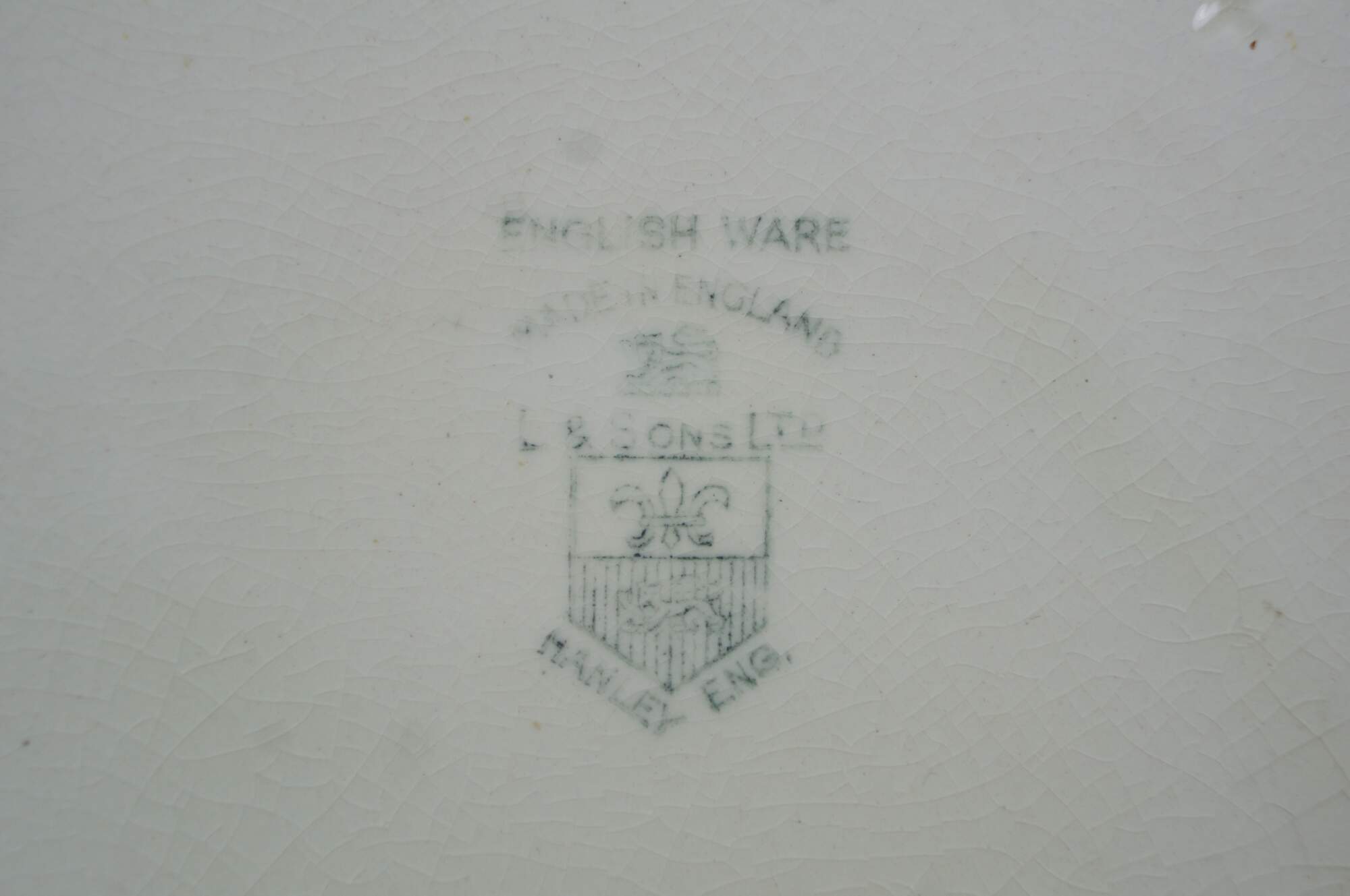 "Lancaster & Sons (Ltd) - Hanley - July 1899-1944 - Manufacture of earthenware at the Dresden works, Tinkersclough, in the Shelton area of Hanley, Stoke-on-Trent, England. Formerly Lancaster & Barker - the partners were Frederick John Lancaster, Emily Lancaster and Edward John Barker. When the partnership of Lancaster & Barker was dissolved in July 1899 the business was continued by Frederick John Lancaster. In 1906 the business was renamed to Lancaster & Sons (Hanley) Ltd. In 1921 the directors were listed as E. Lancaster and T H Lancaster. In 1941 Lancaster & Sons (Hanley) Ltd were designated as a 'Nucleus Firm' under the Wartime Concentration Scheme and were permitted to continue production of designated utility ware. At sometime Mr. T. H. Sandland joined the business as a co-director with Edwin Lancaster. In 1944 the business was renamed to Lancaster & Sandland Ltd." (The Potteries)