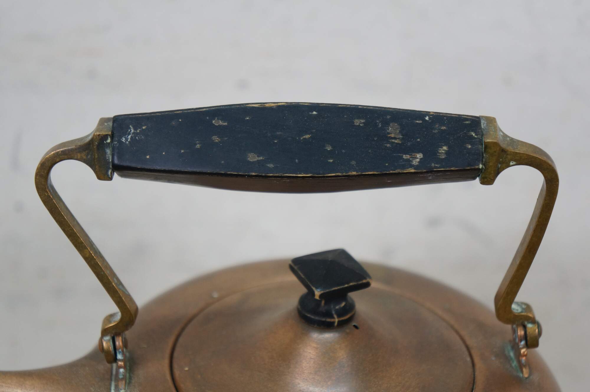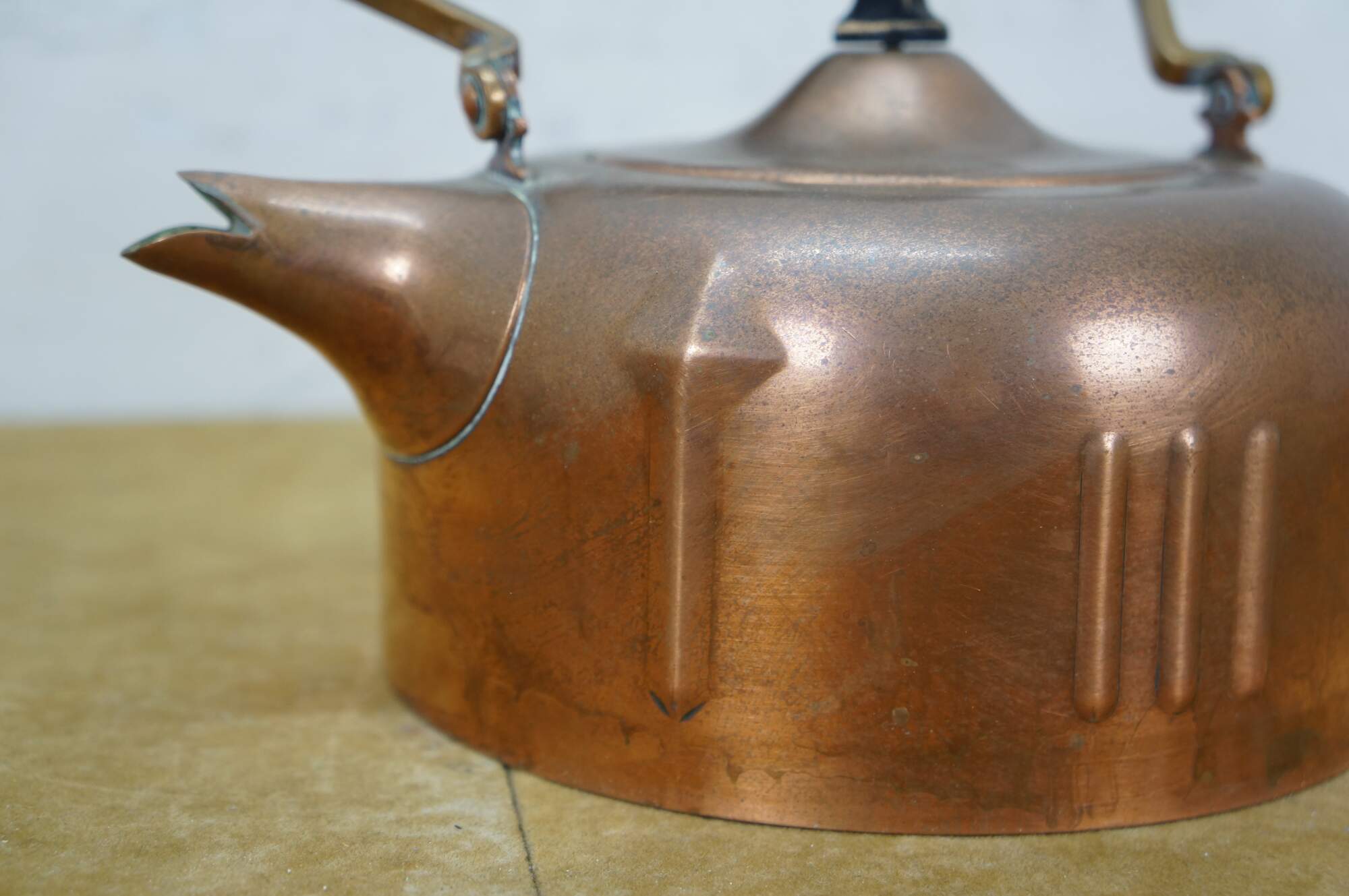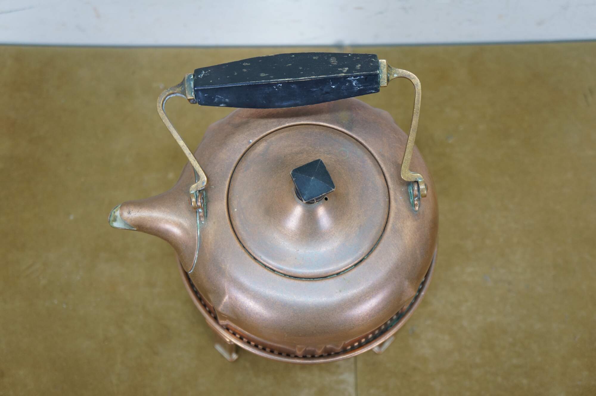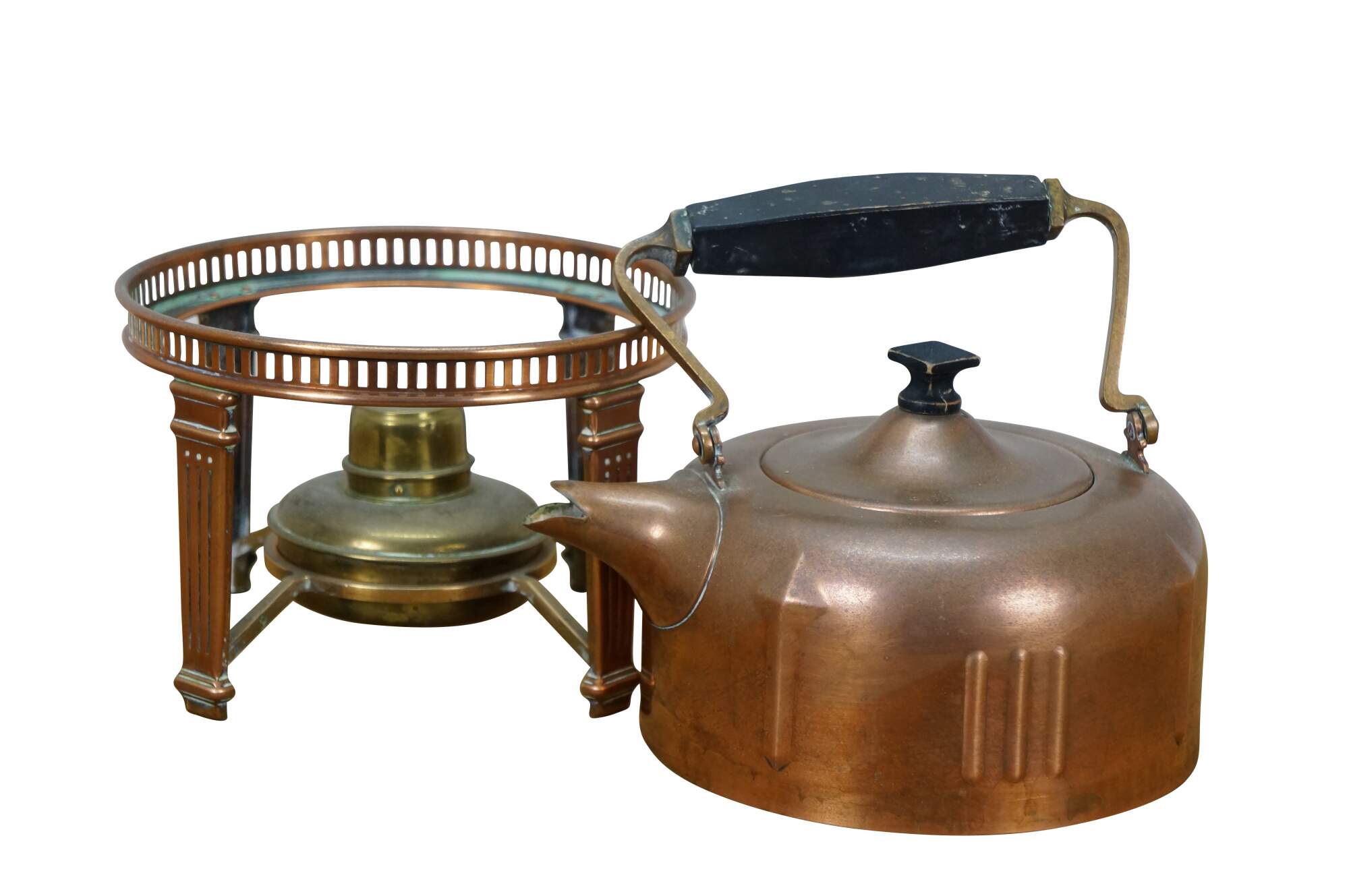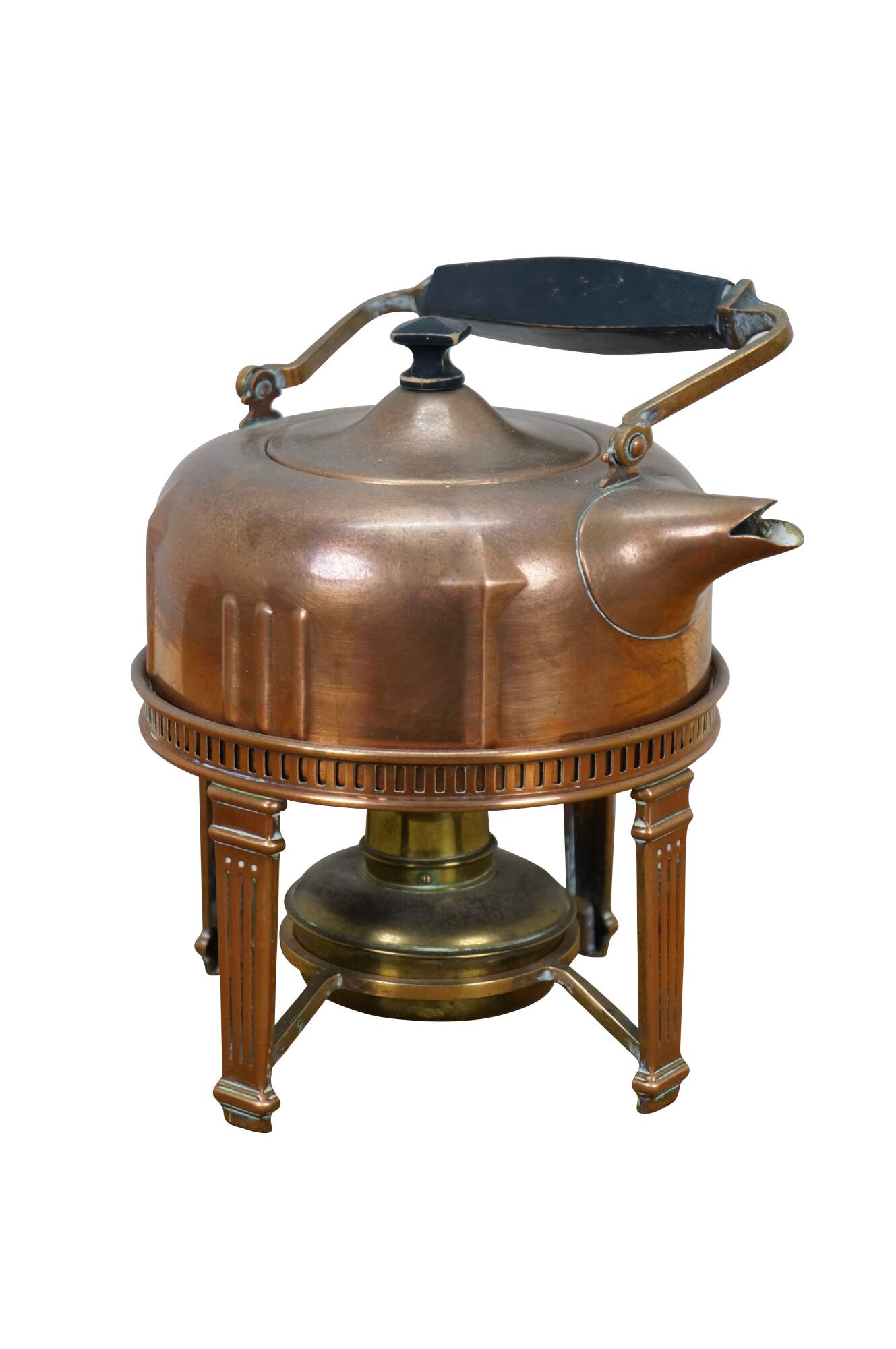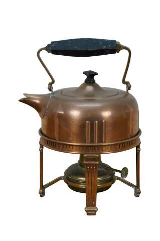 Antique Art Deco S. Sternau & Company copper tea kettle with bird spout and black wood grip and finial, set on a four legged chafing stand with burner. Burner marked with a different logo.