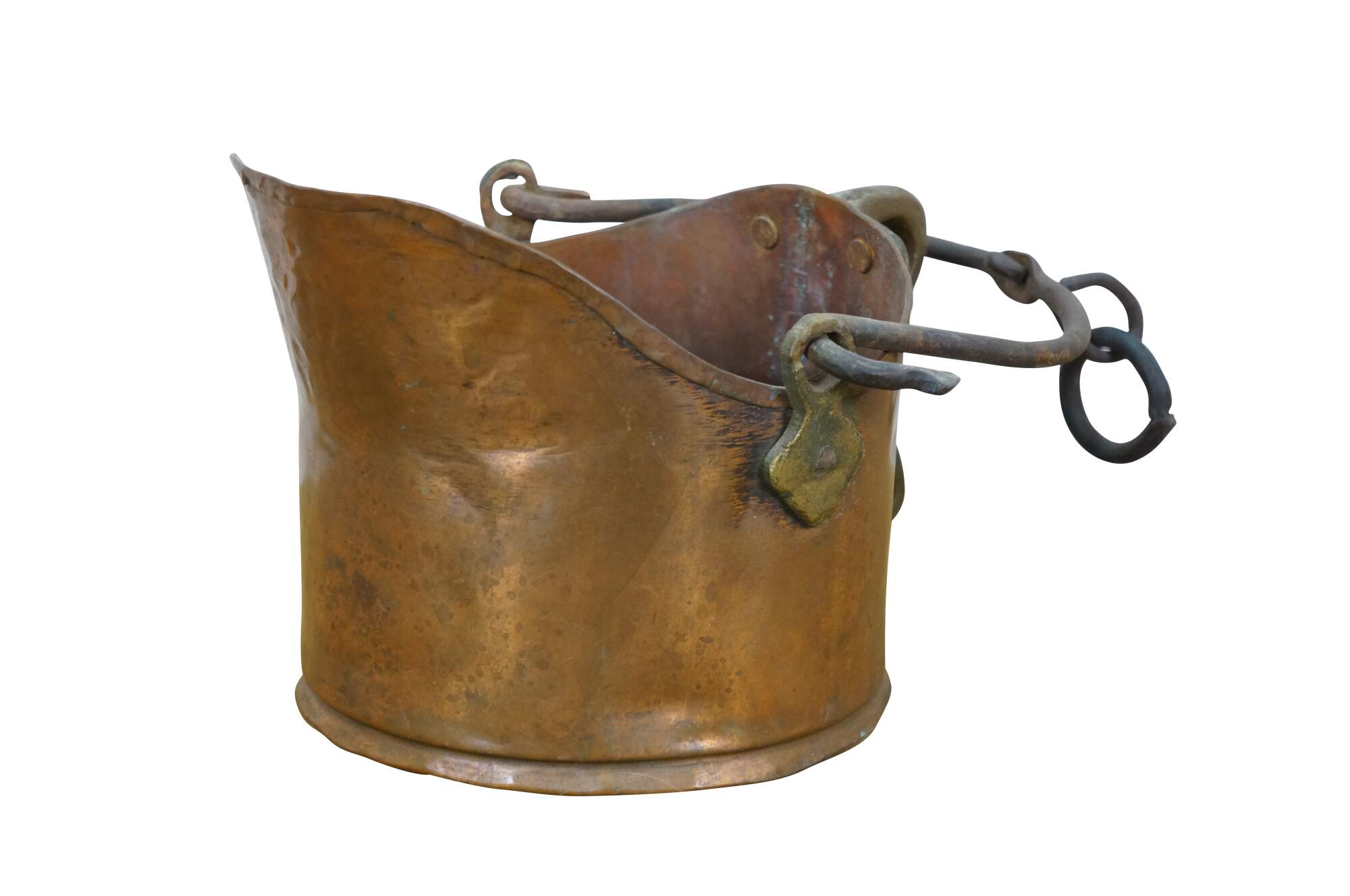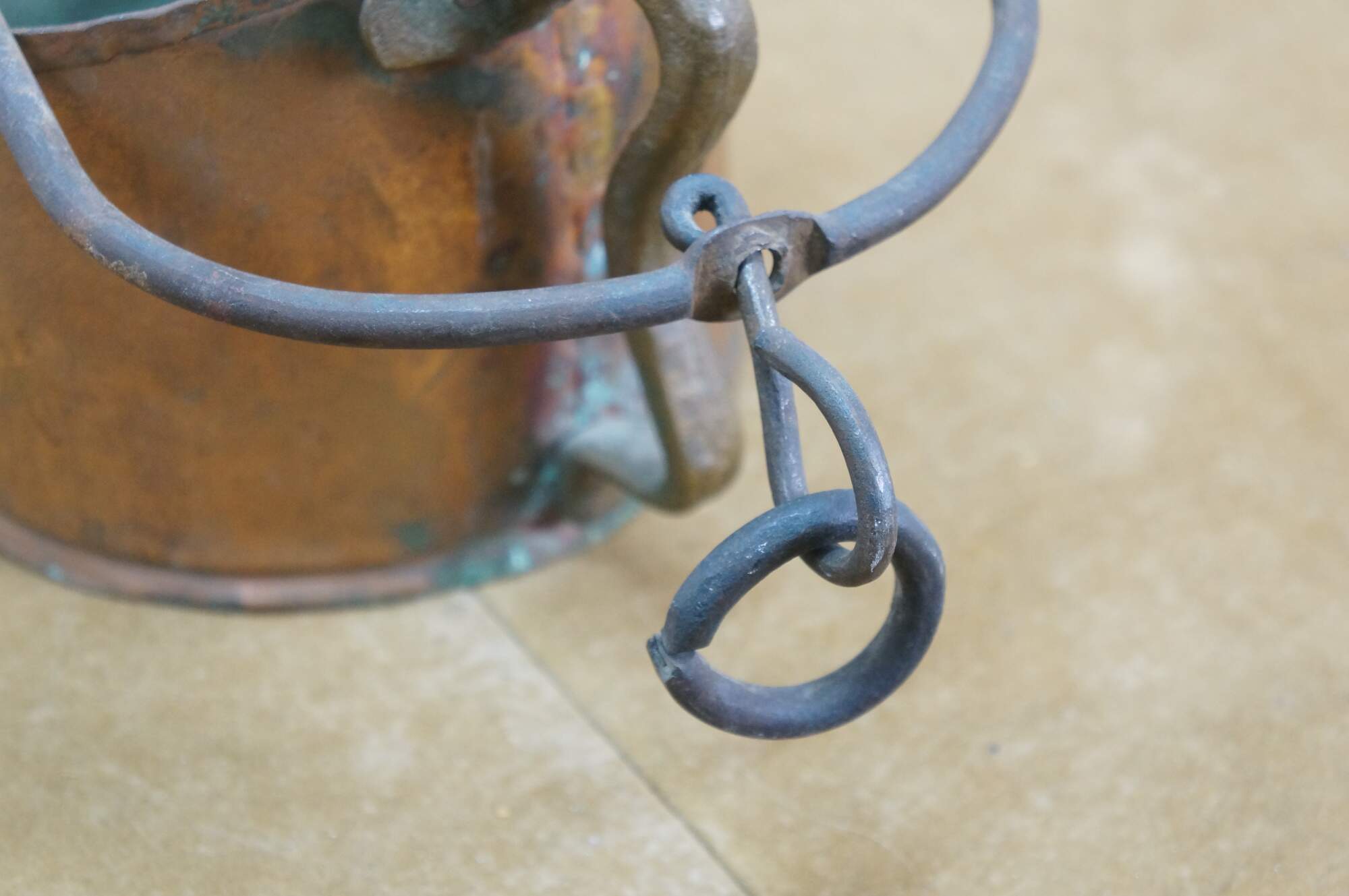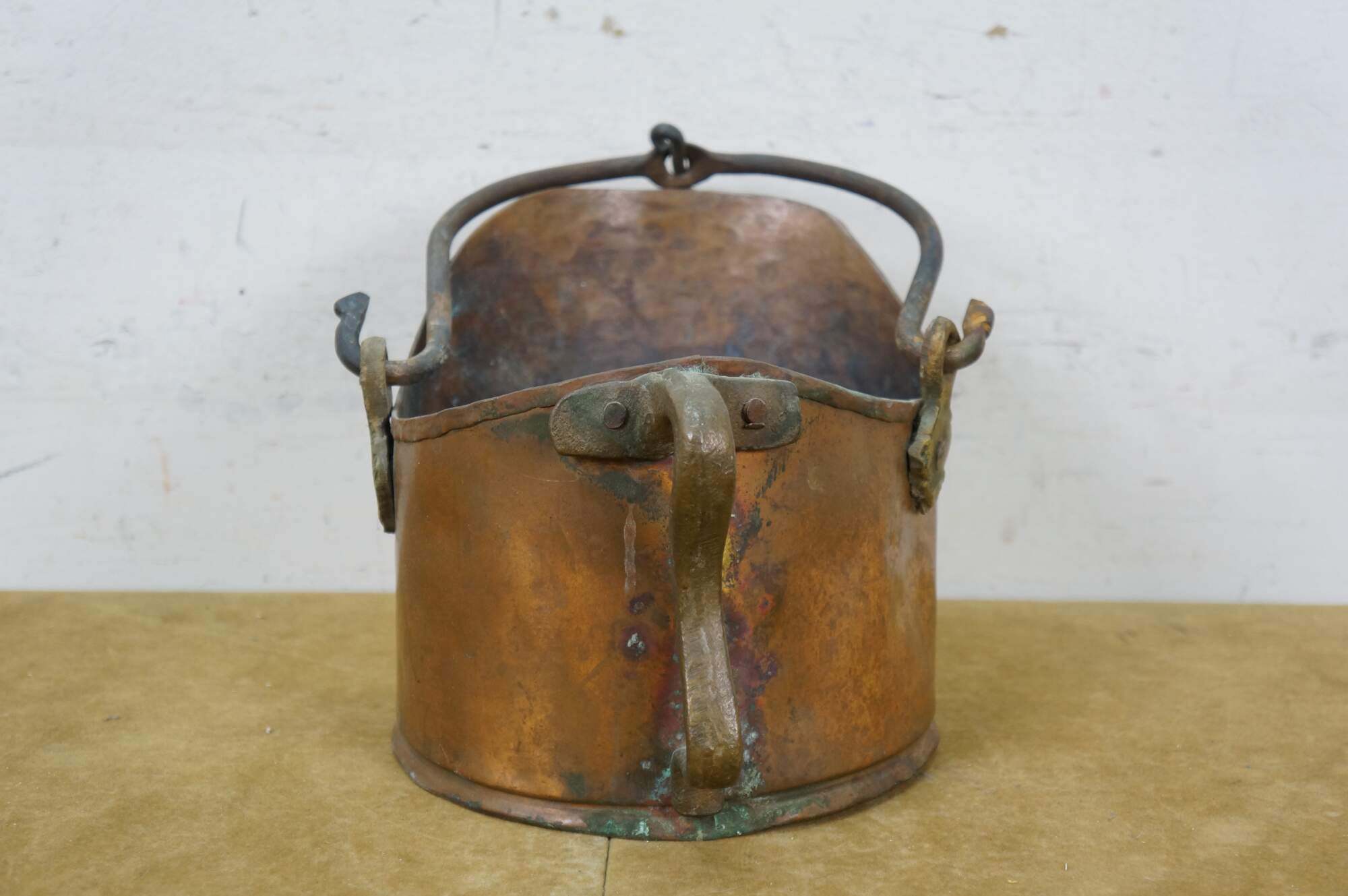 Antique dovetailed copper hanging coal scuttle / bucket with broad pour spout shaped lip, iron rattail bail handle and oxbow shaped brass handle on the back.