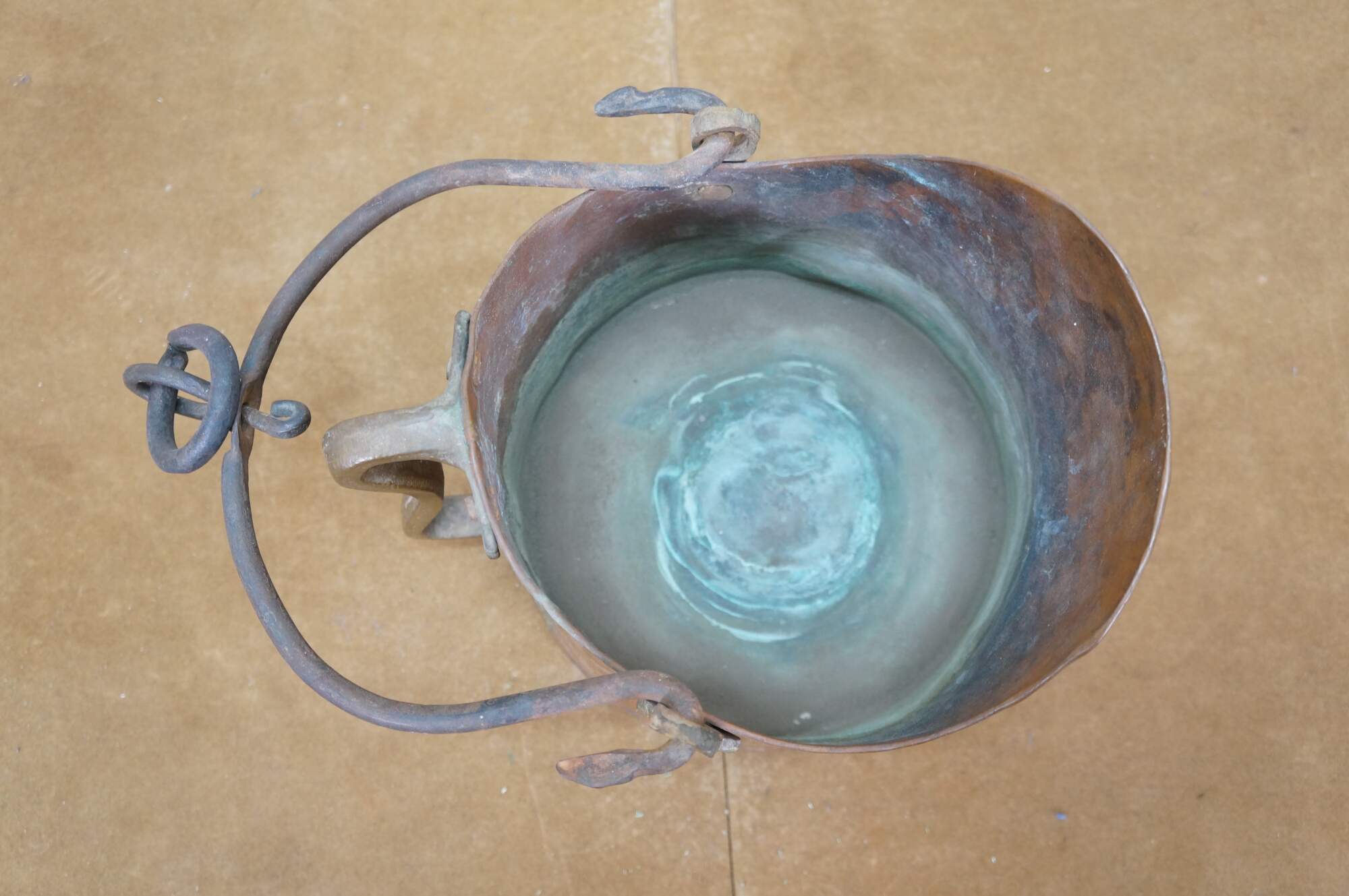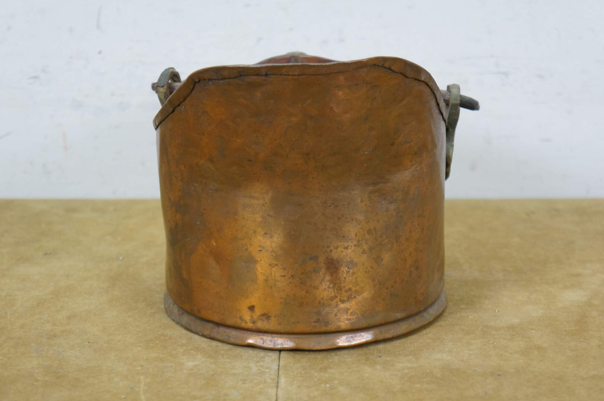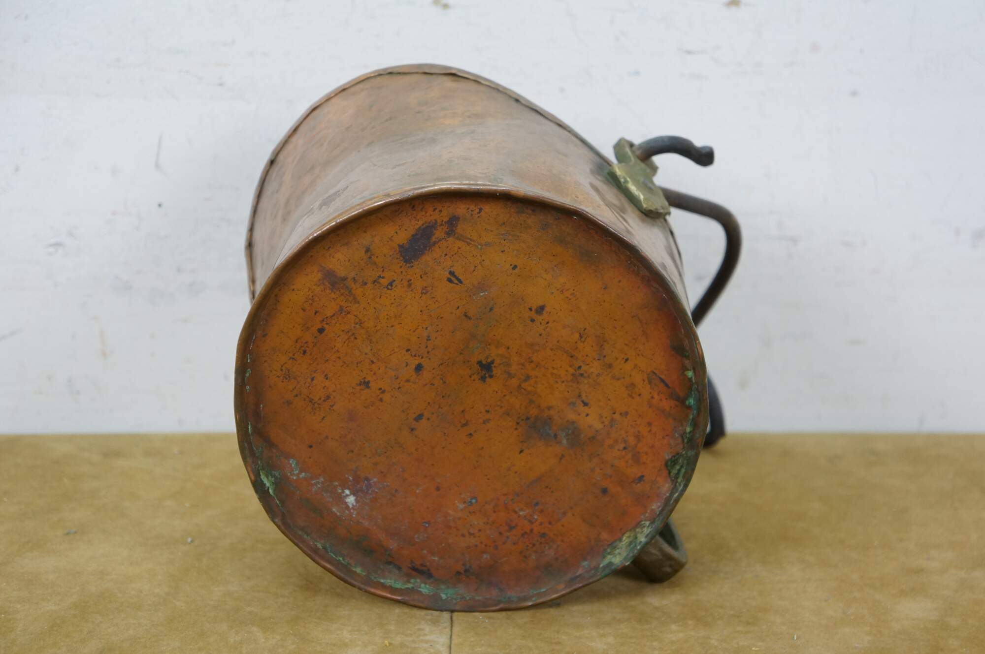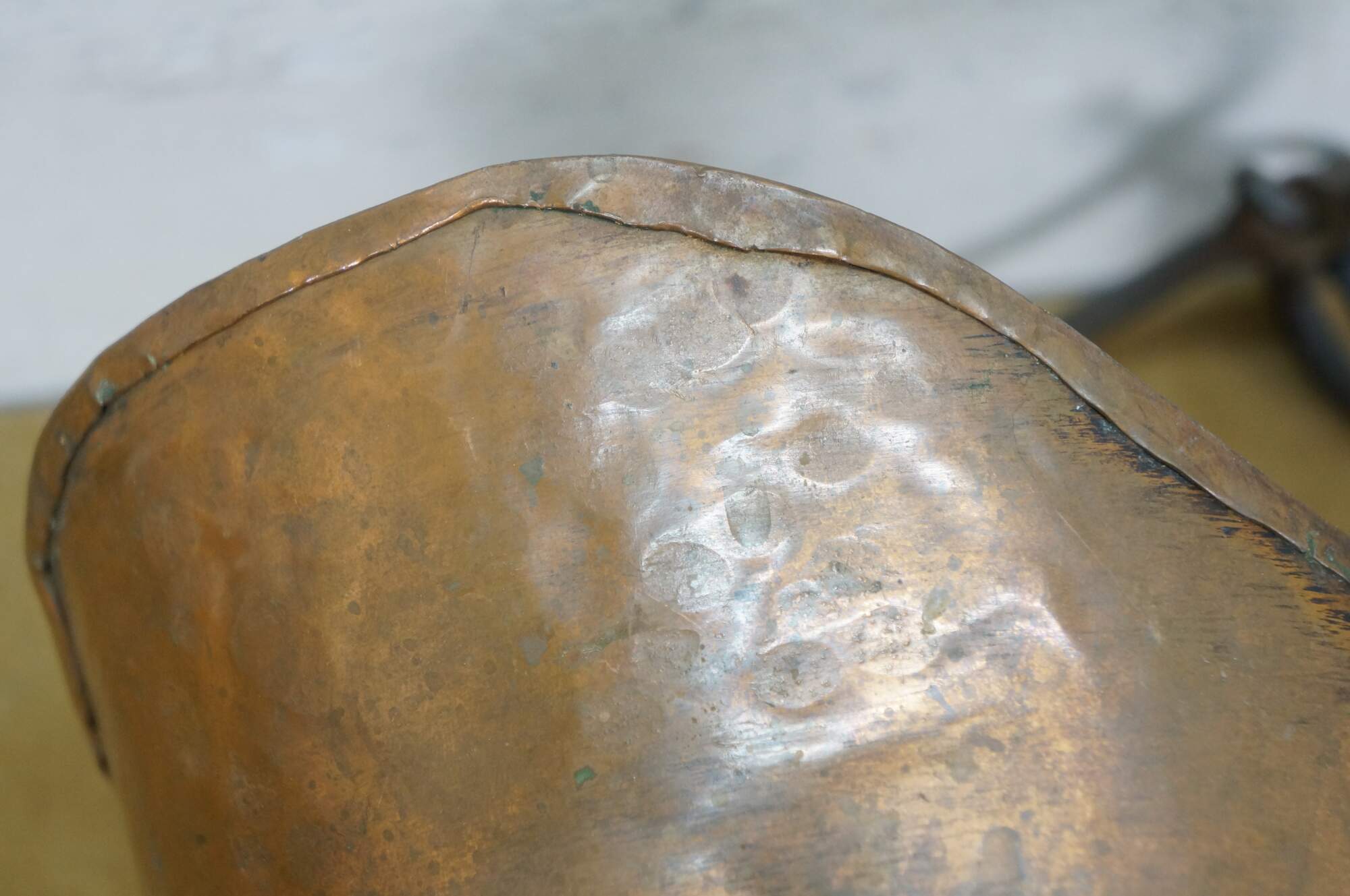 Antique dovetailed copper hanging coal scuttle / bucket with broad pour spout shaped lip, iron rattail bail handle and oxbow shaped brass handle on the back.