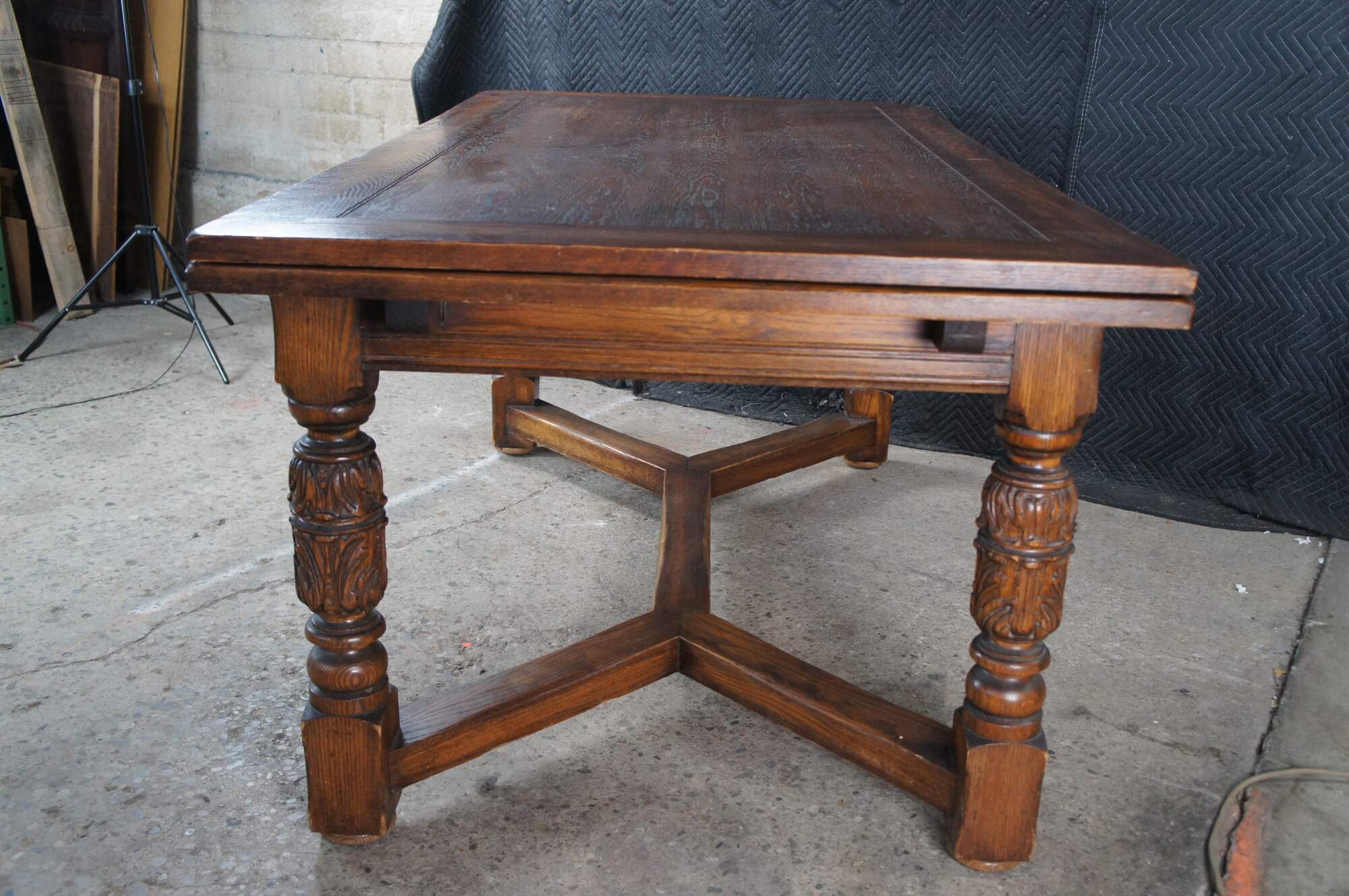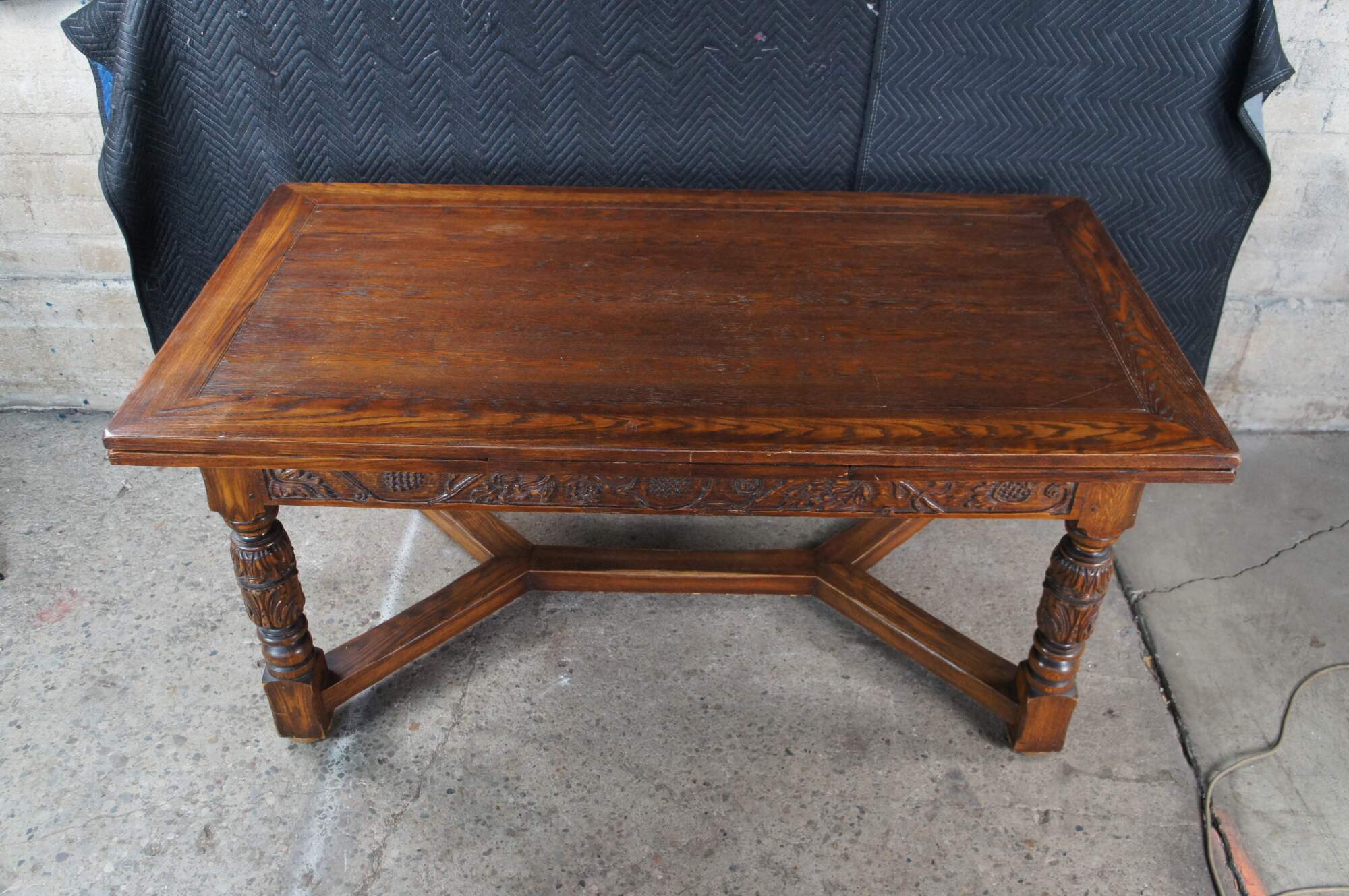 Antique Jamestown Lounge Company Feudal Oak refectory dining table. Made of oak featuring Jacobean styling with ornate carved foliate / fruit / berries / grapes / grapevine and acanthus designs with chunky turned baluster legs connected by a trestle base. The long rectangular top showcases built in extendable draw leaves on each end.