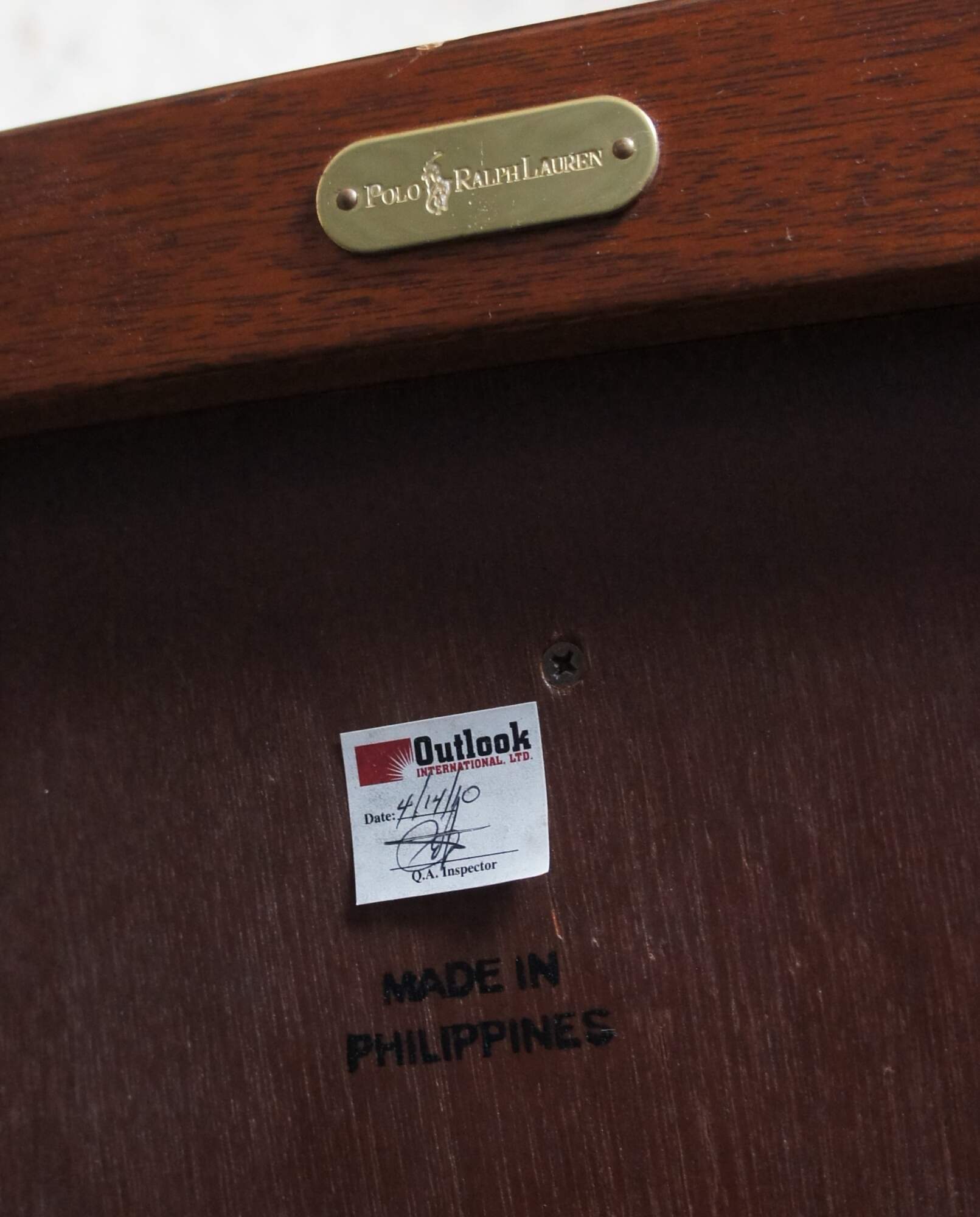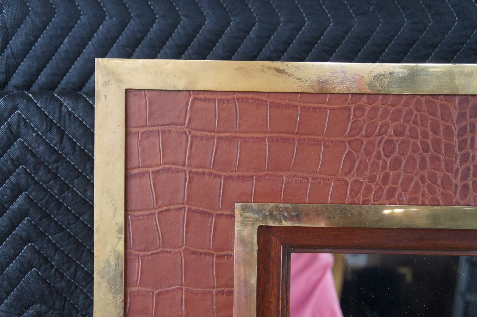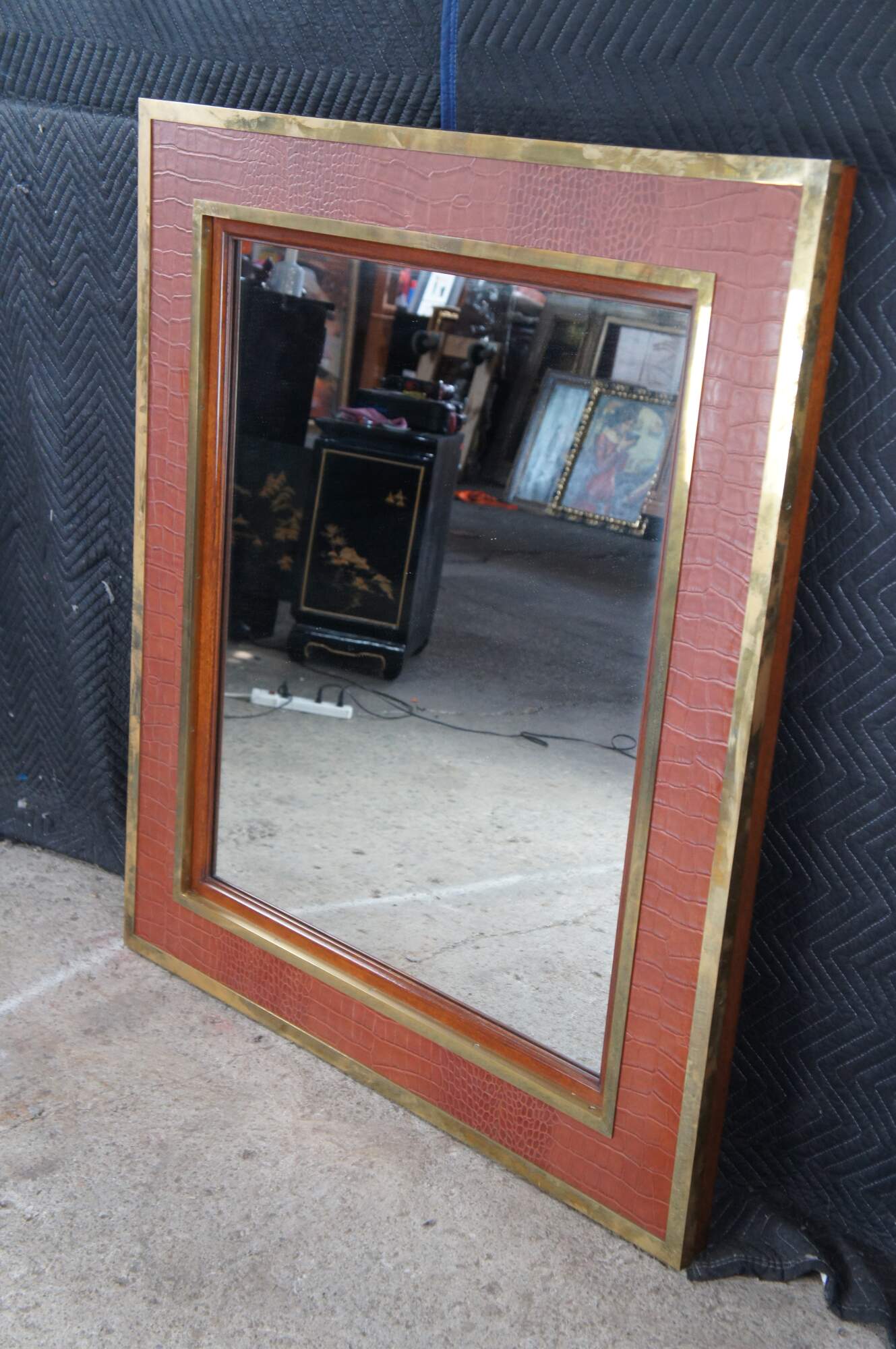 A very large and impressive Ralph Lauren / Polo mirror. Made of mahogany featuring equestrian inspired design with faux alligator / crocodile embossed leather framed in heavy brass banding. Made in the Philippines.