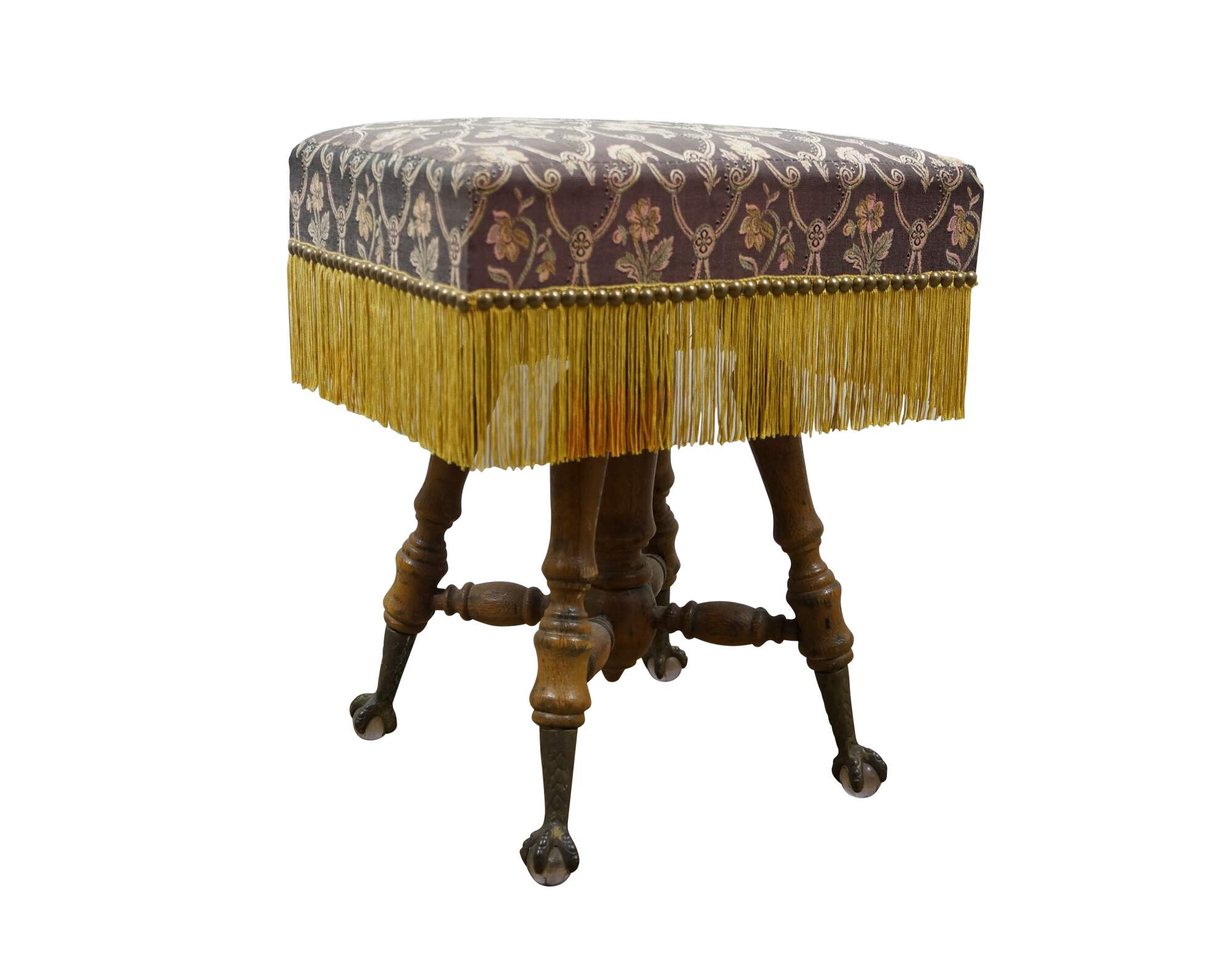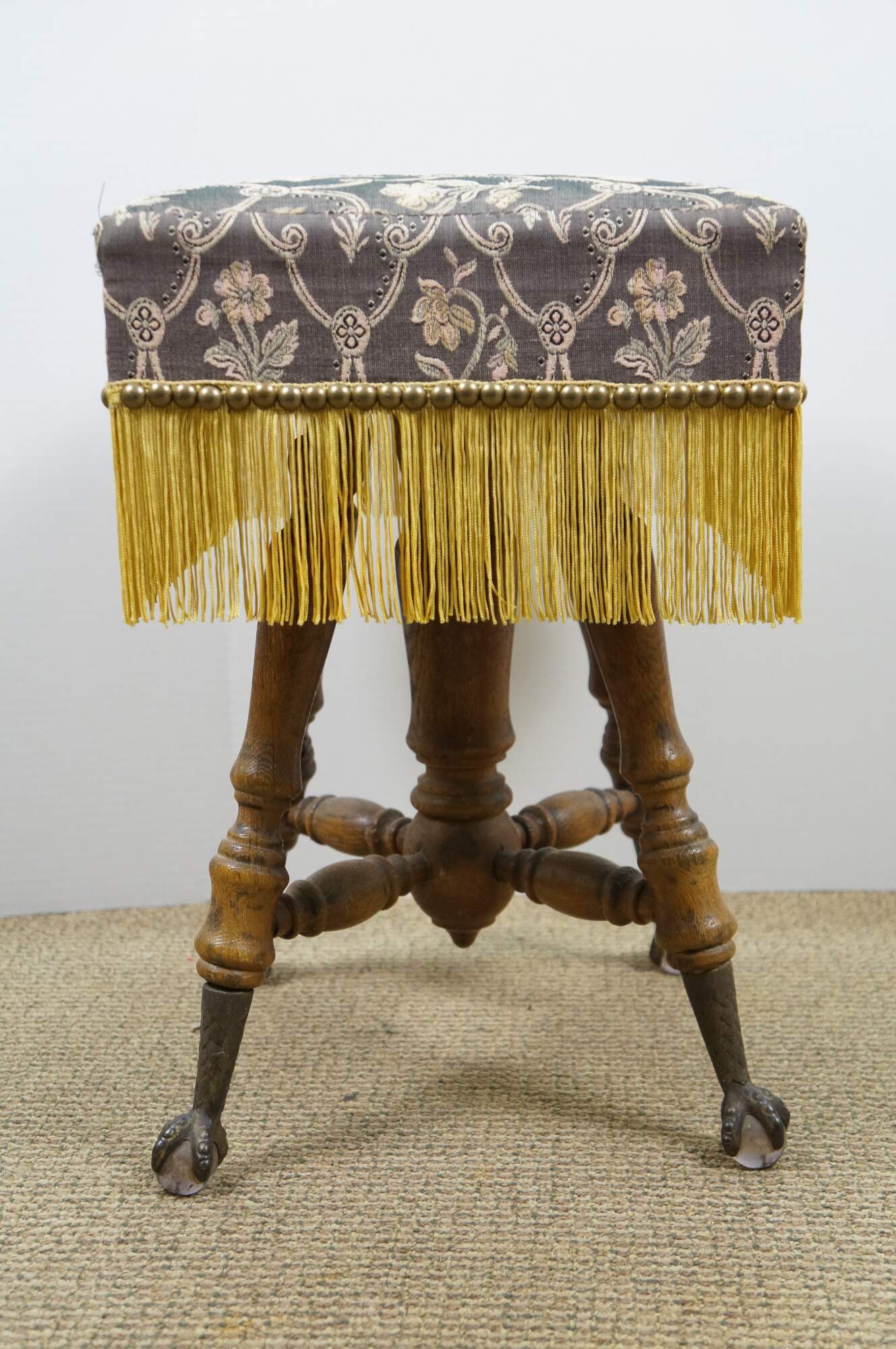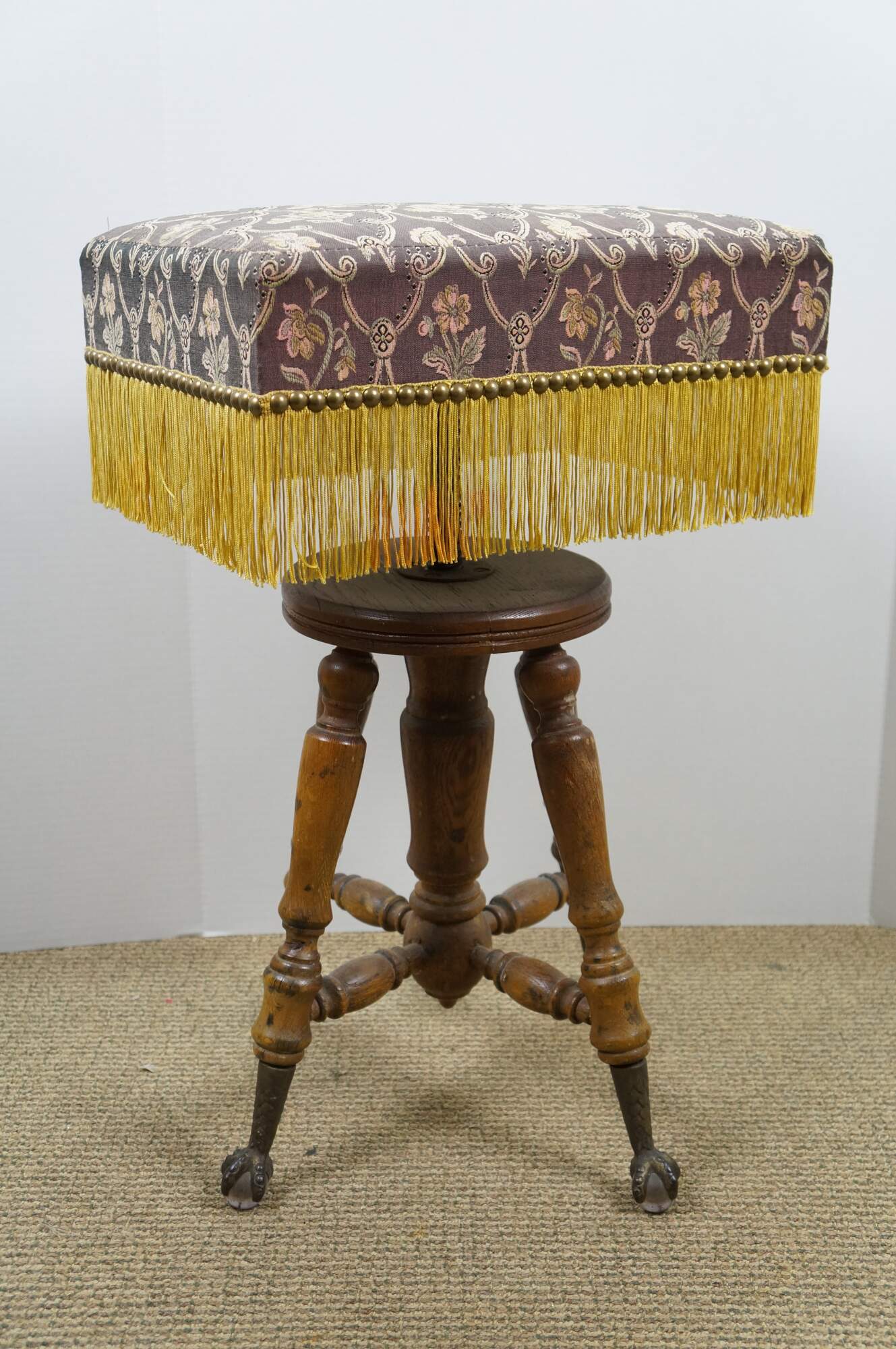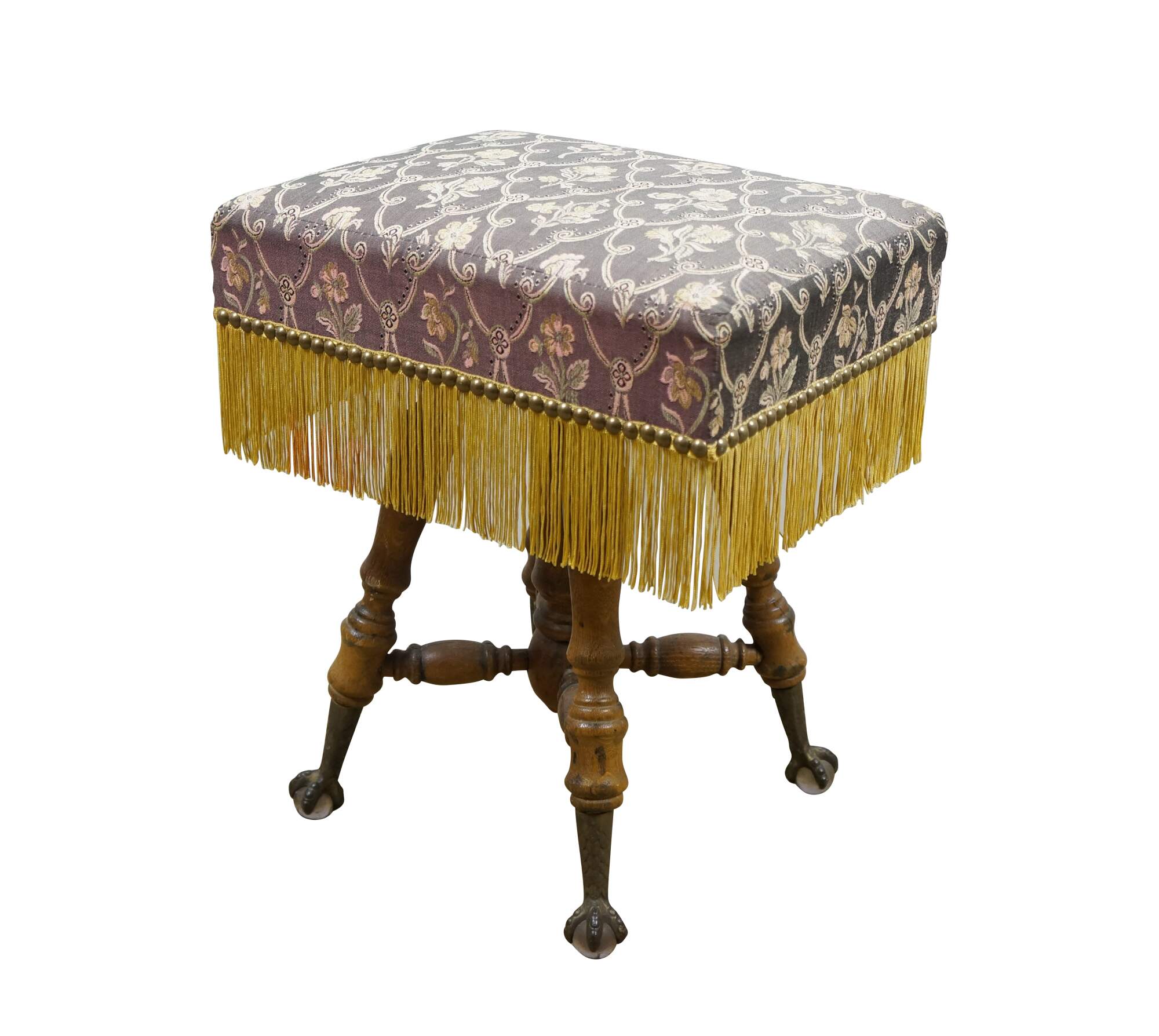 Circa late 19th century piano stool / foot rest / ottoman featuring four turned legs with glass ball and claw feet and rectangular seat upholstered in purple and gold floral brocade with golden fringe and nailhead trim. Seat unscrews from center post to adjust height.