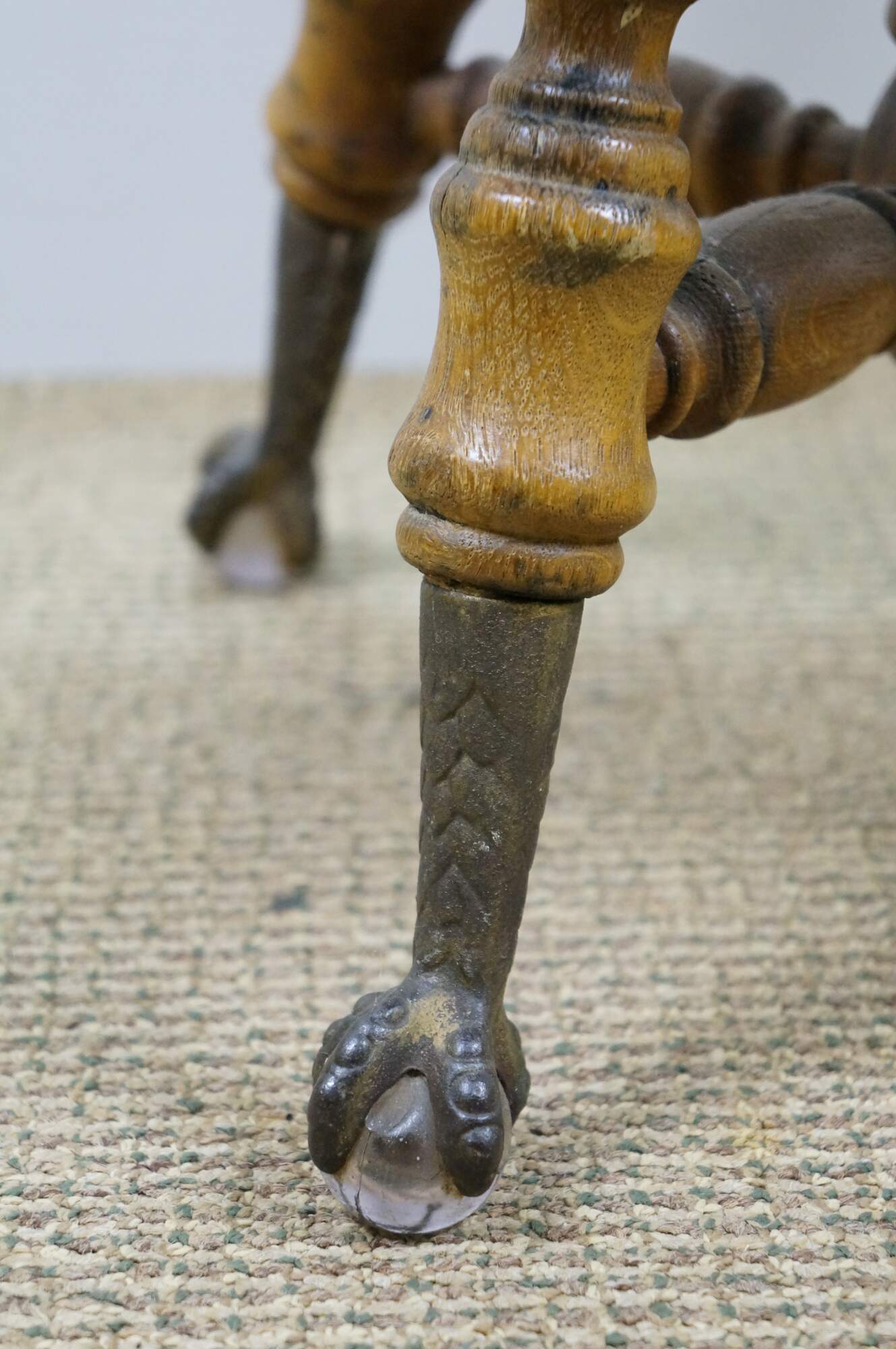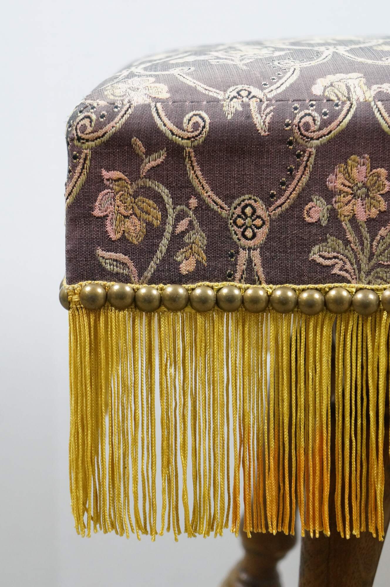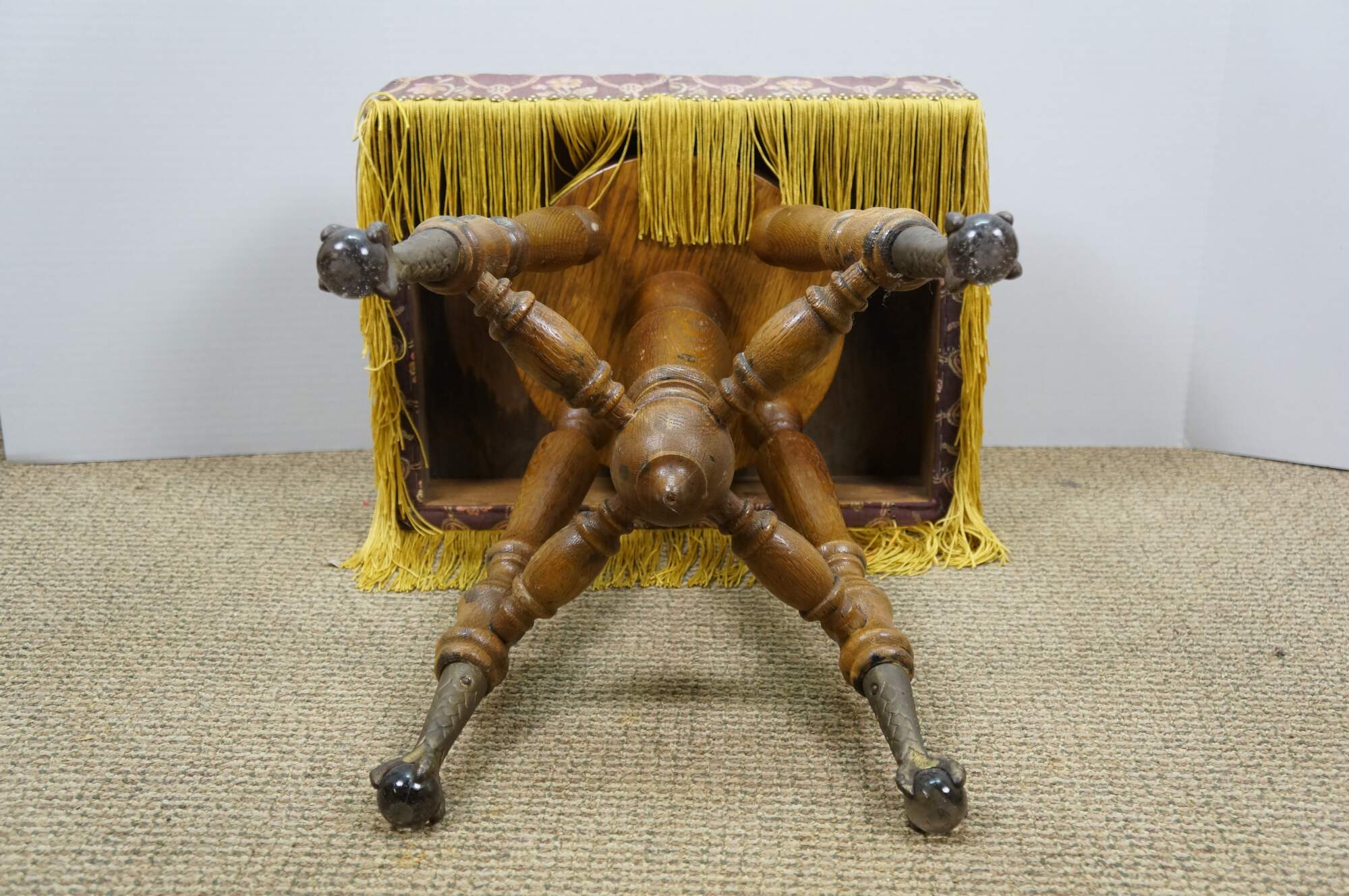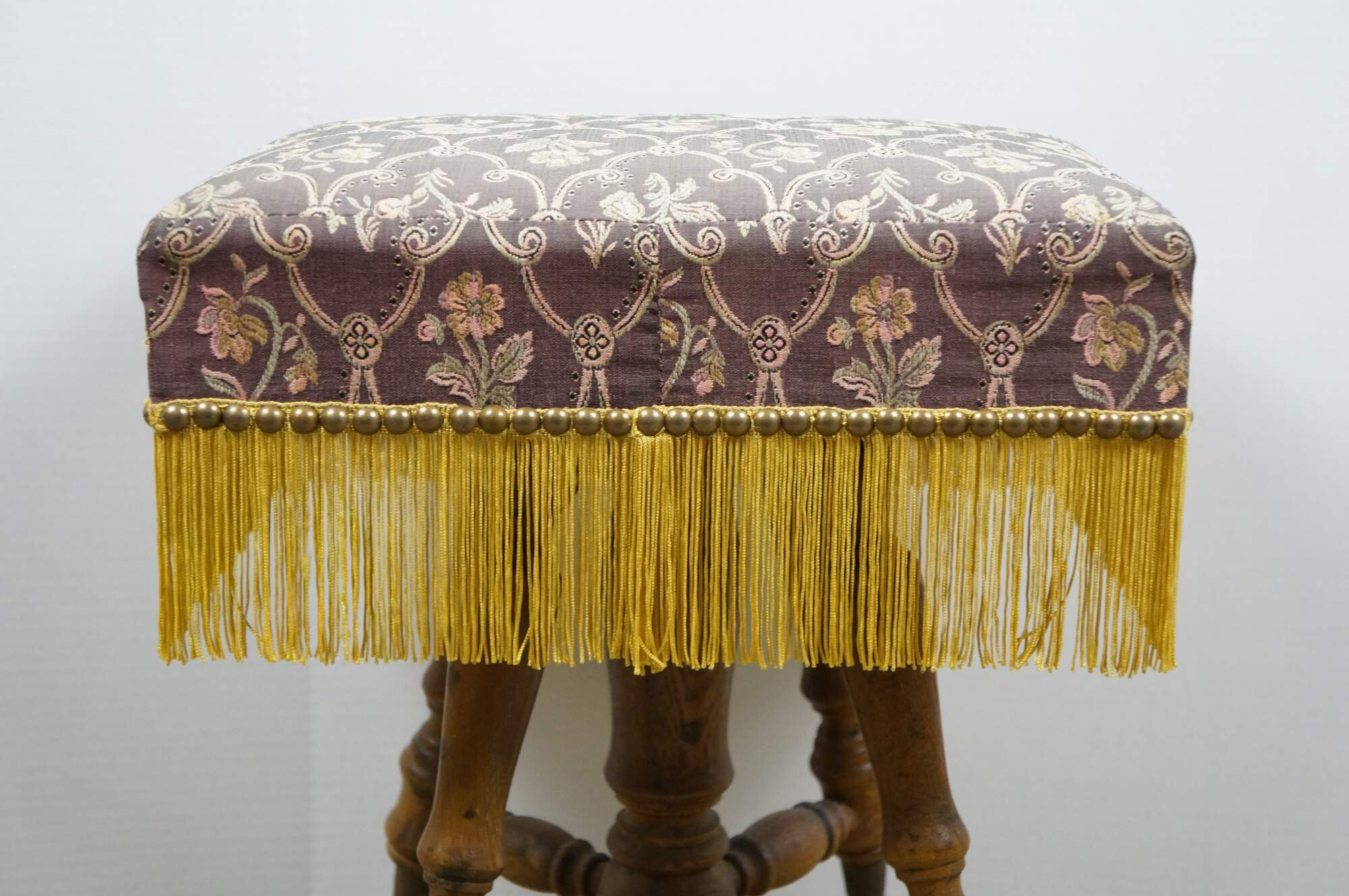 Circa late 19th century piano stool / foot rest / ottoman featuring four turned legs with glass ball and claw feet and rectangular seat upholstered in purple and gold floral brocade with golden fringe and nailhead trim. Seat unscrews from center post to adjust height.