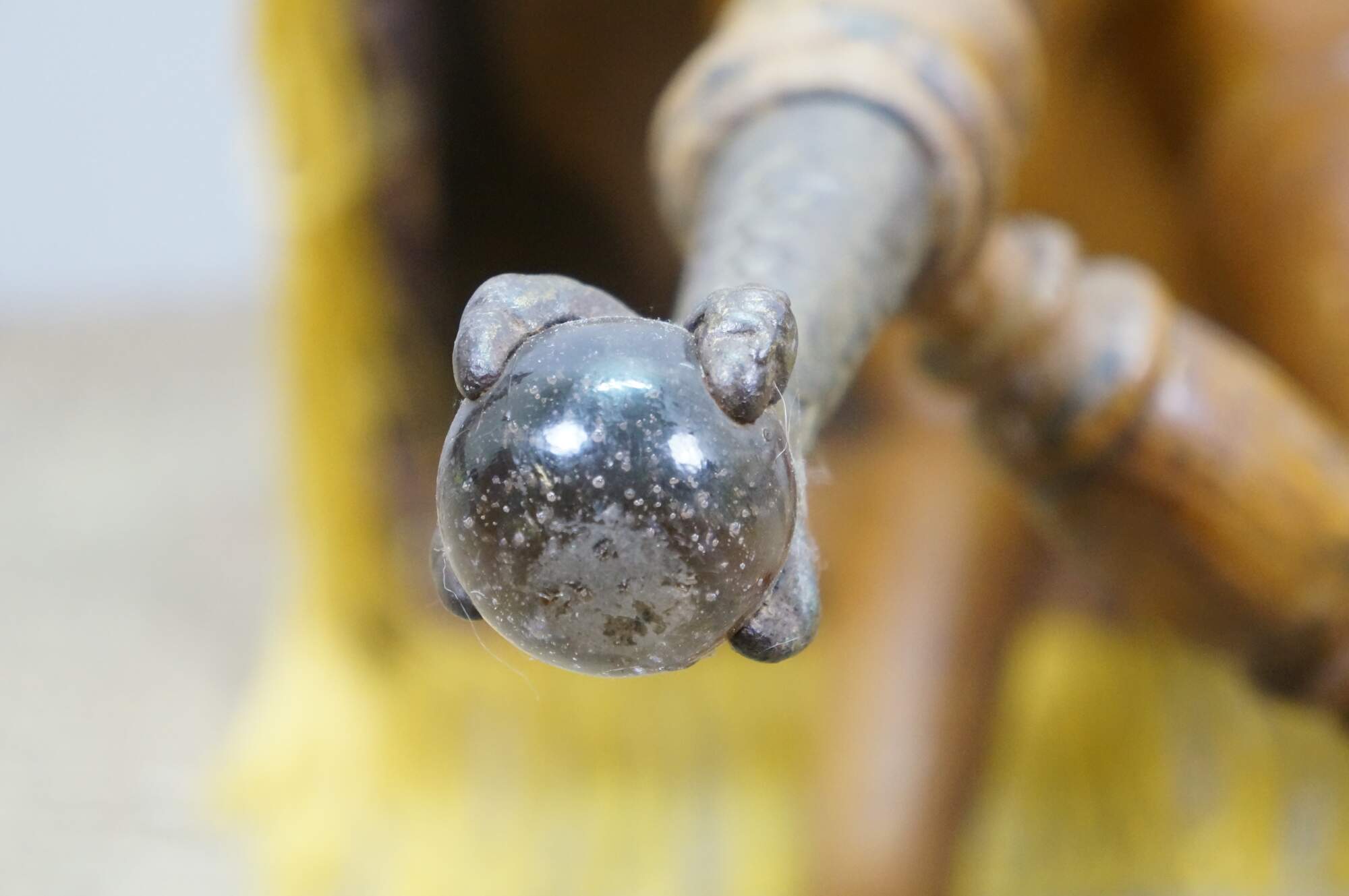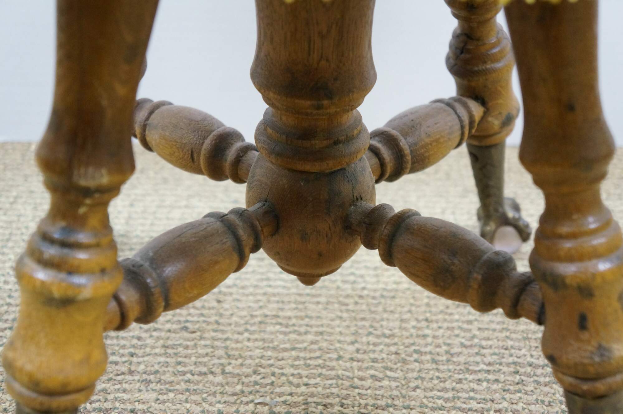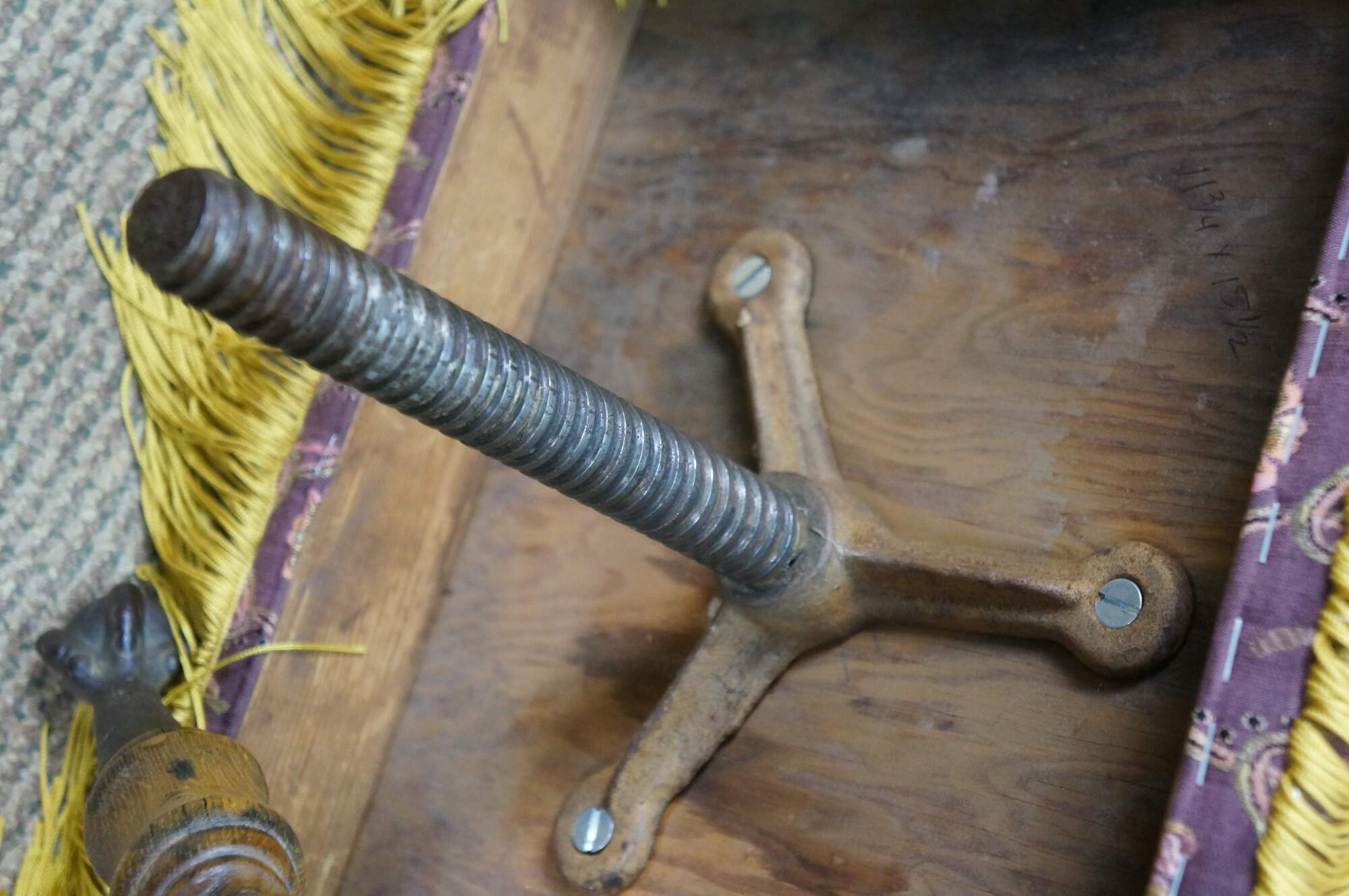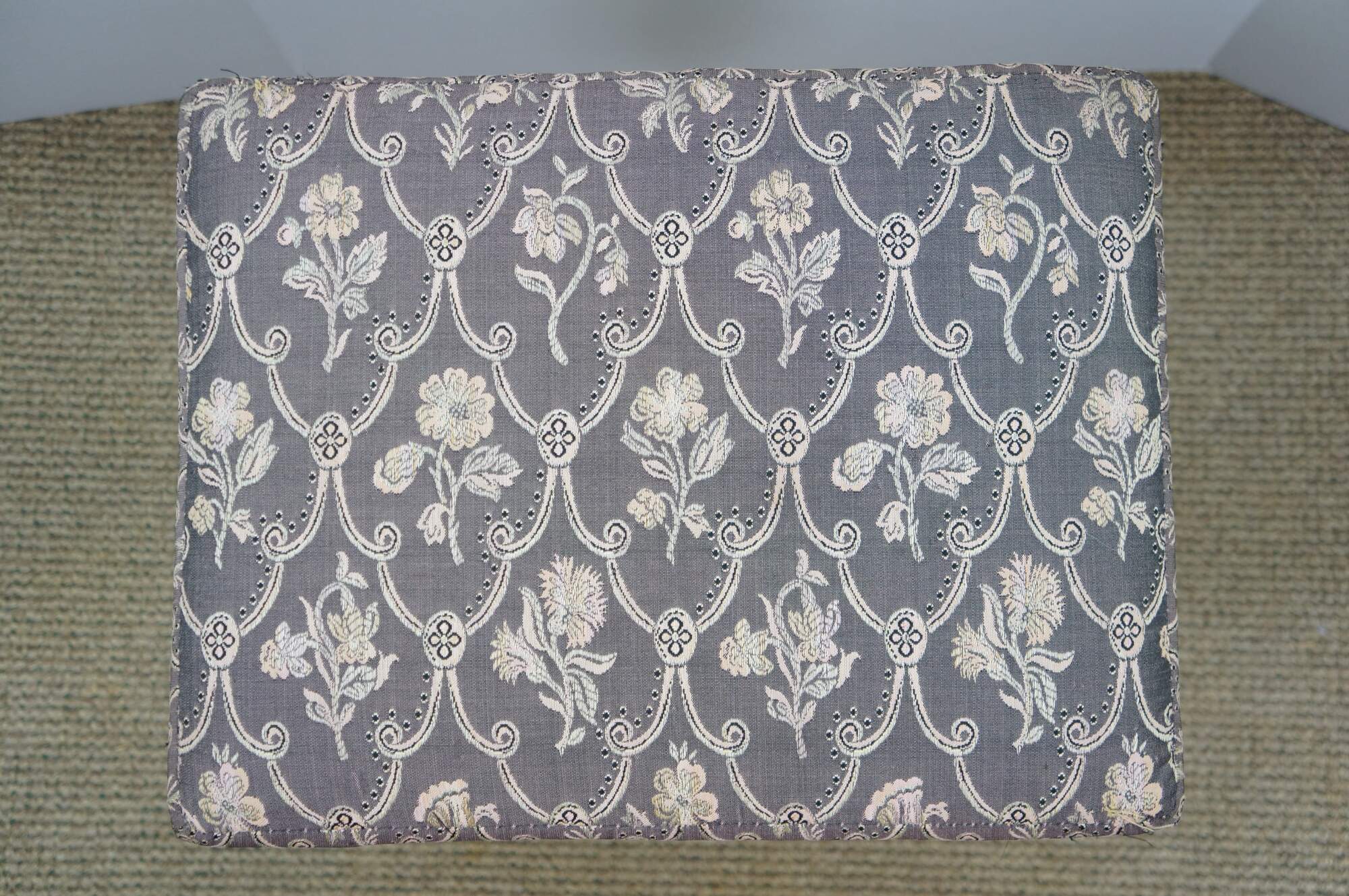 Circa late 19th century piano stool / foot rest / ottoman featuring four turned legs with glass ball and claw feet and rectangular seat upholstered in purple and gold floral brocade with golden fringe and nailhead trim. Seat unscrews from center post to adjust height.