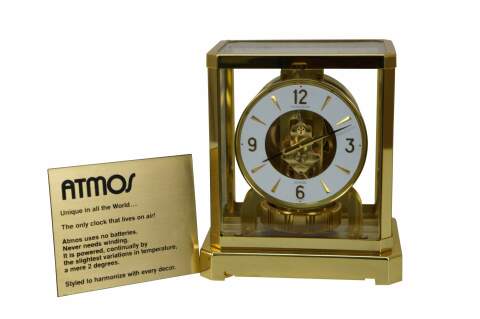 Circa 1960s Jaeger-Le Coultre Atmos perpetual motion mantel clock. Bright polished brass frame with glass sides. White face with gold tone Arabic numerals, pips and hands. Le Coultre & Cie - Metal - Caliber 528-8 - Swiss - C. Falt & Co. Serial Number: 404140. Fifteen 15 Jewels VXN - Switzerland Unadjusted - 528/1. Includes brass shop display plaque.