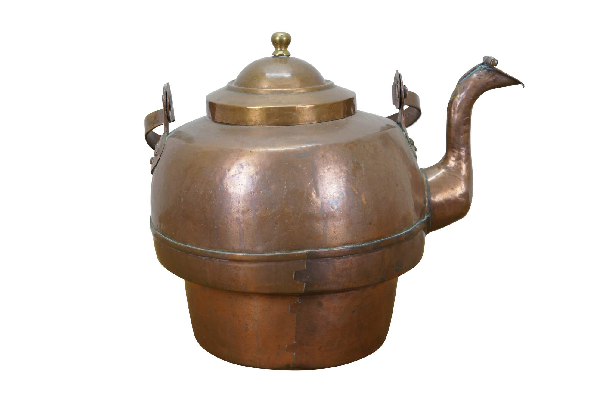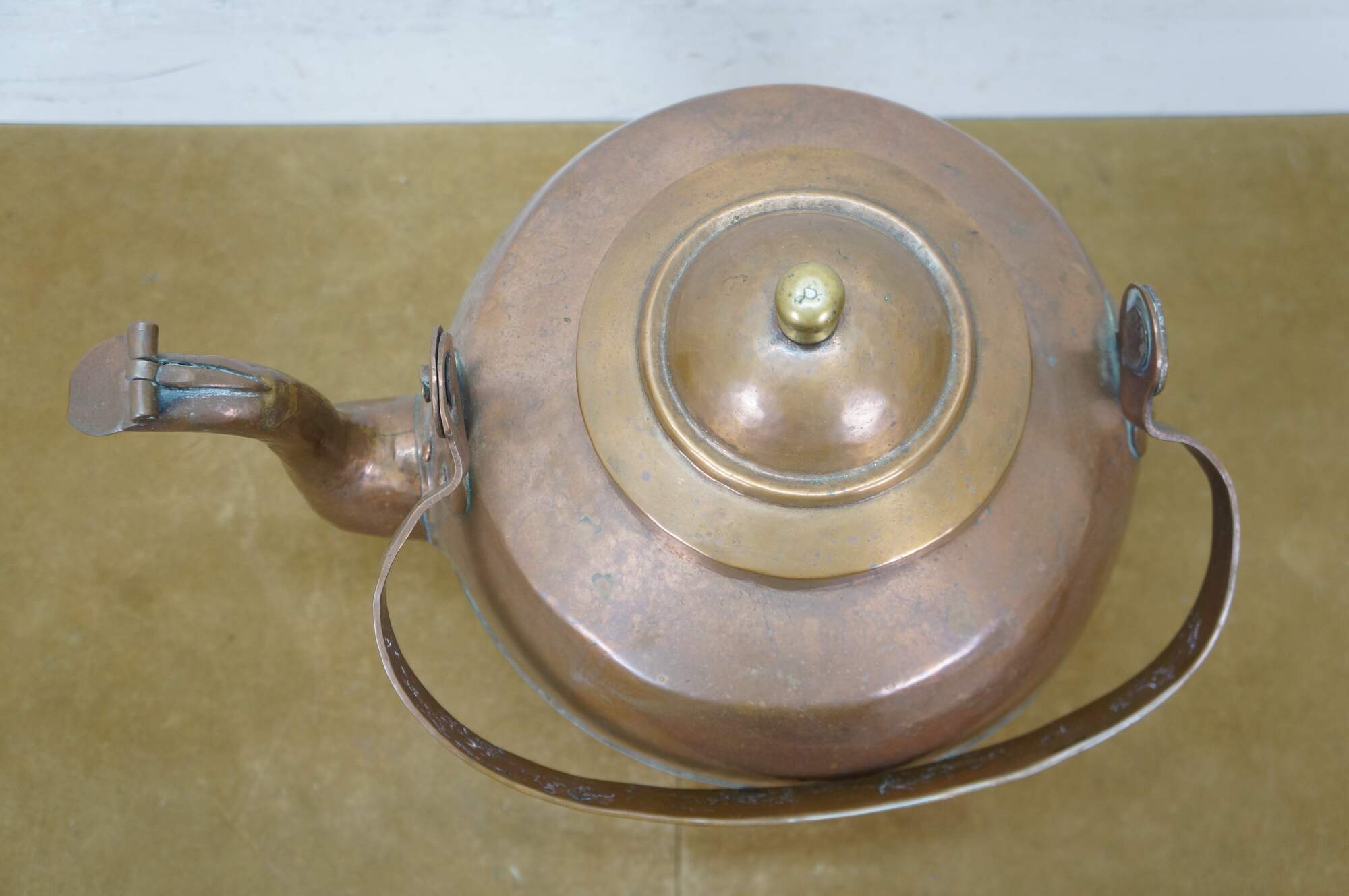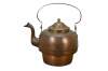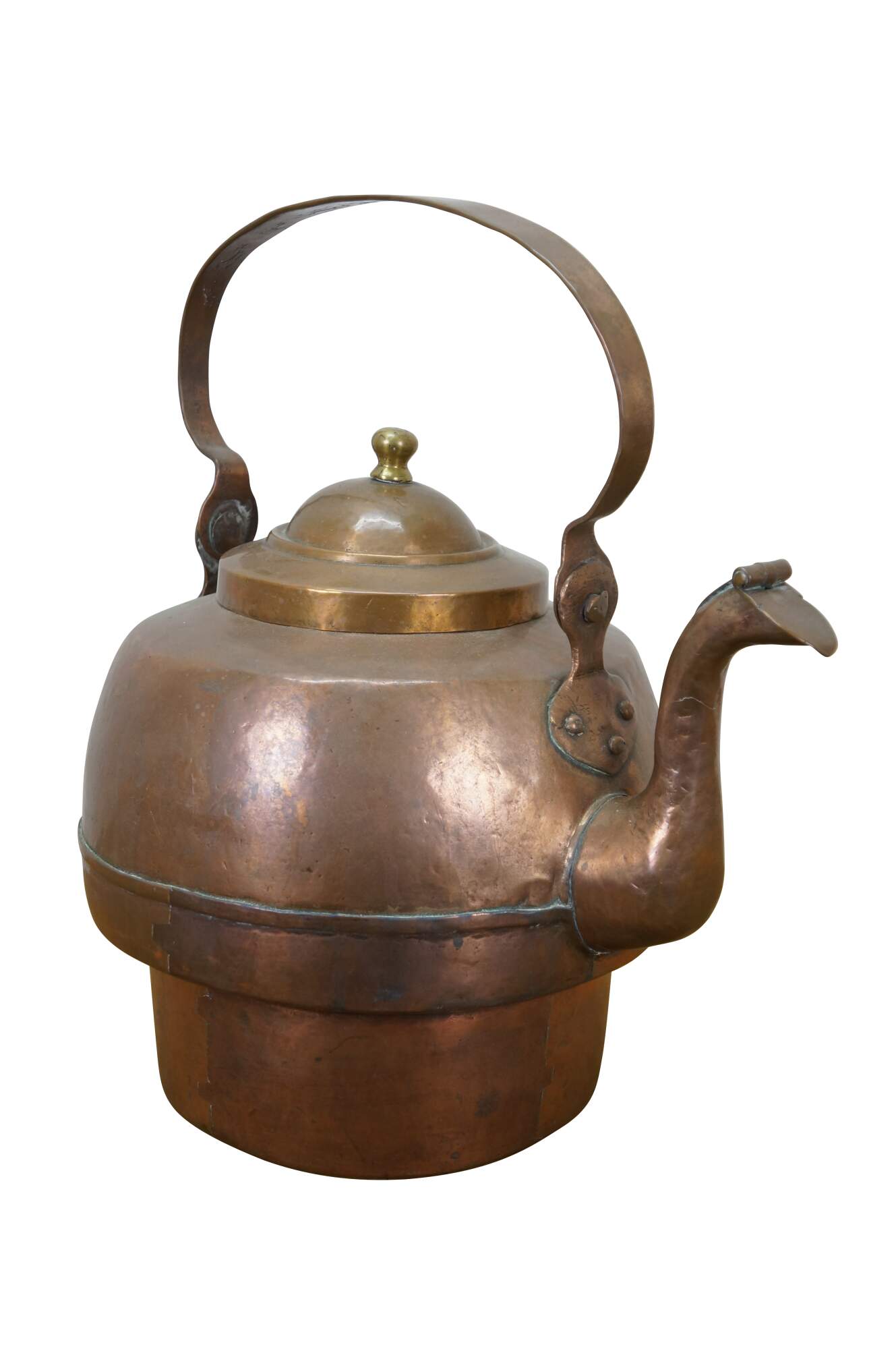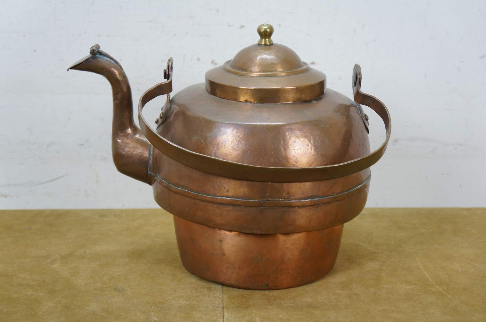 Antique extra large copper tea / water kettle with a smaller diameter base than top, gooseneck spout with flap at end, rotating bail handle, and brass finial on the lid.