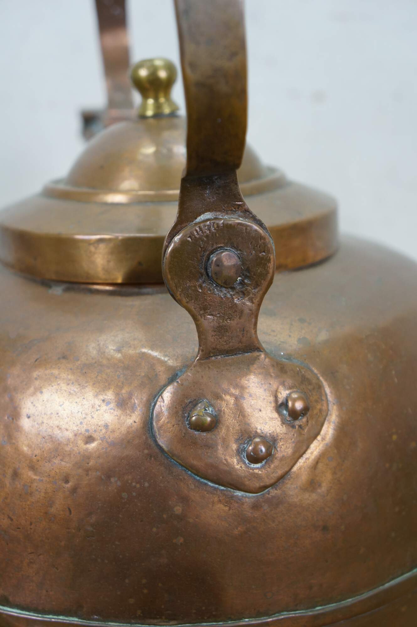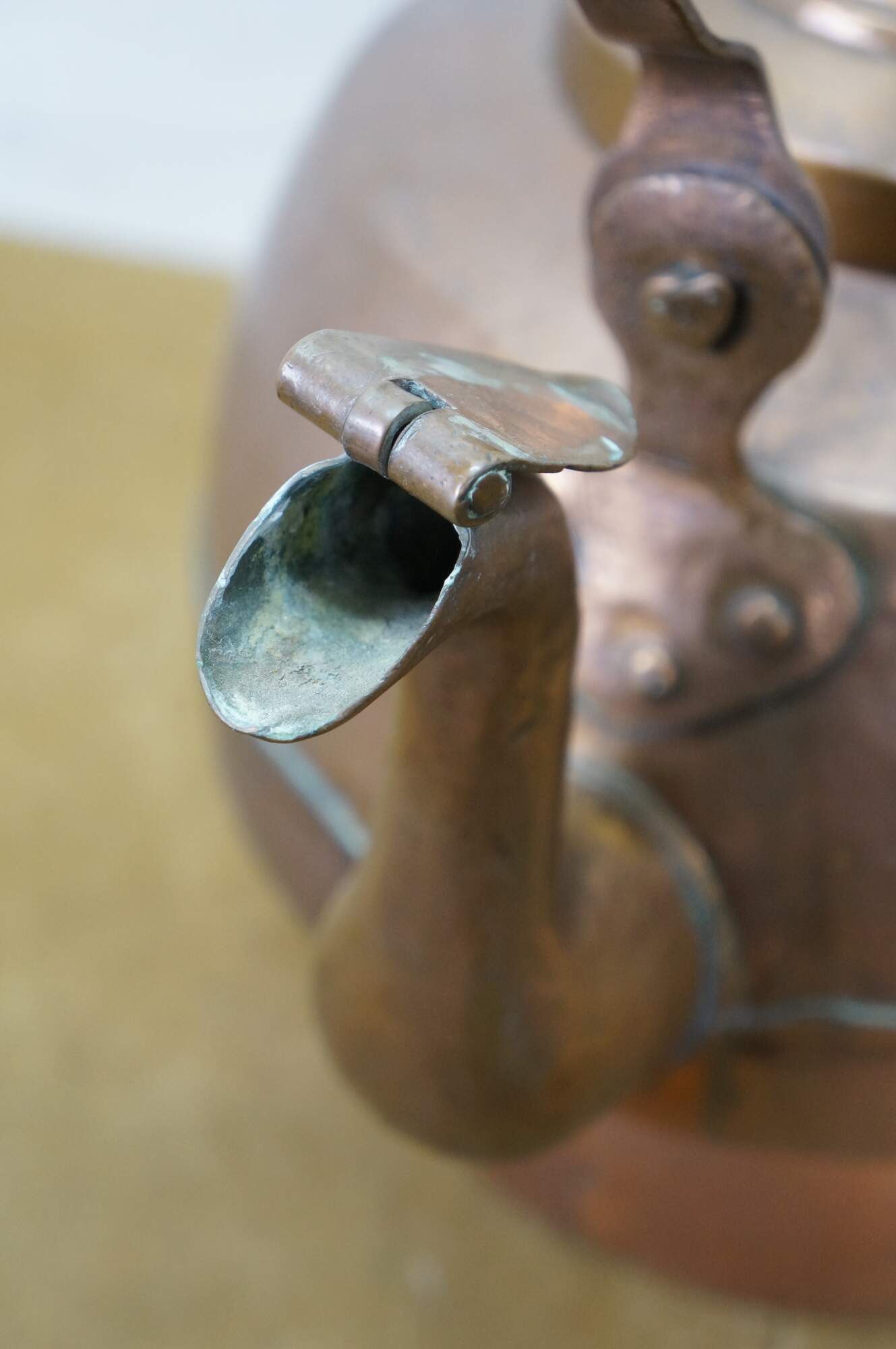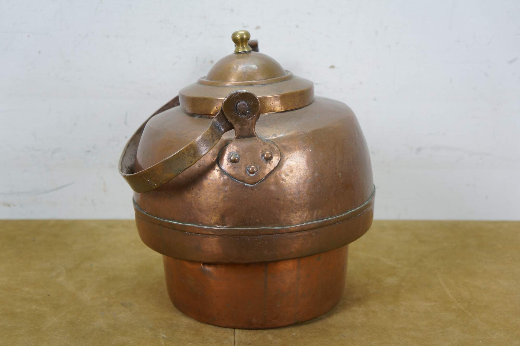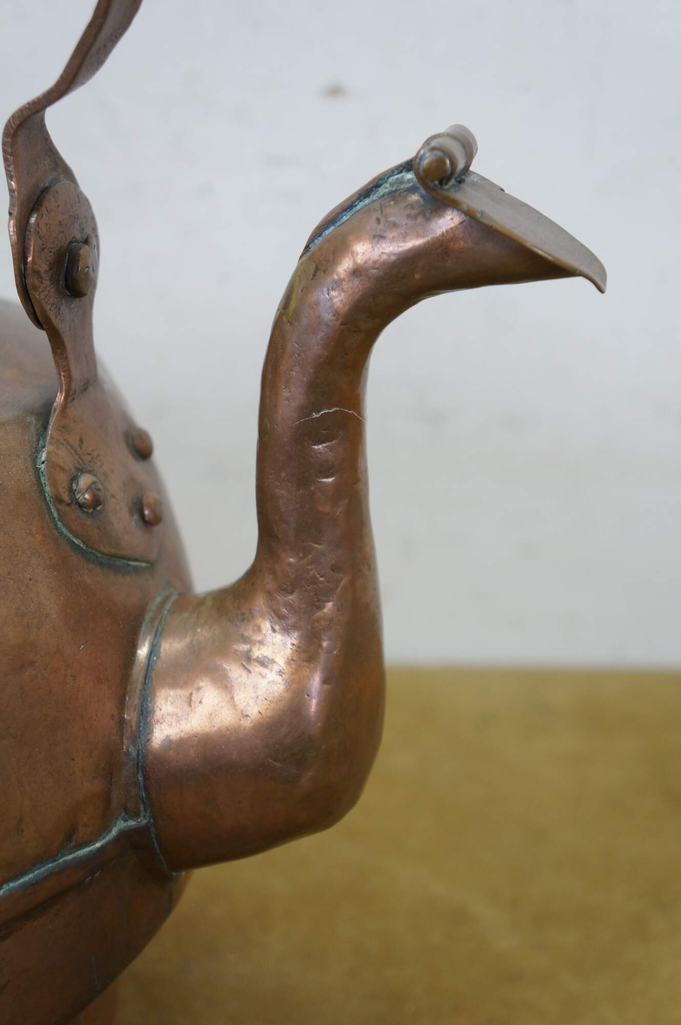 Antique extra large copper tea / water kettle with a smaller diameter base than top, gooseneck spout with flap at end, rotating bail handle, and brass finial on the lid.