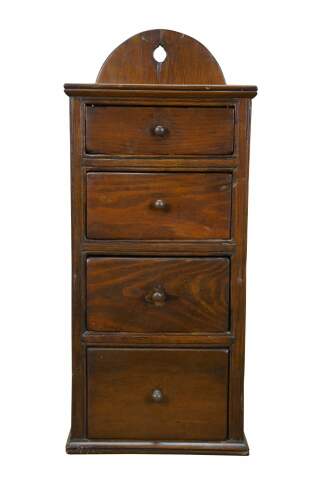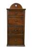 Antique wall hanging oak spice rack / apothecary cabinet - rectangular shape with four different sized drawers and arch shaped crest.