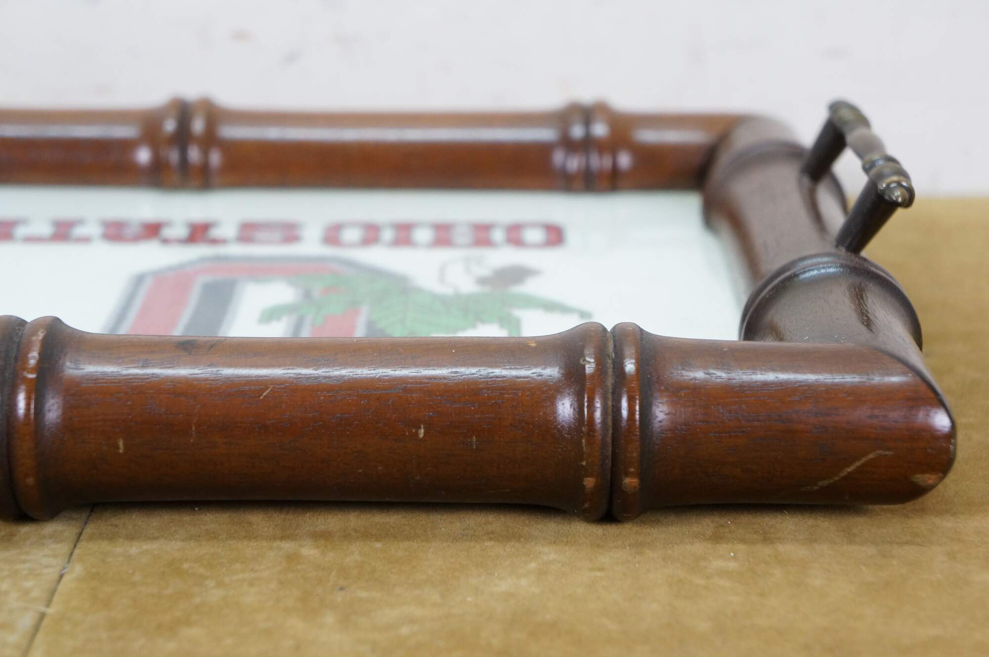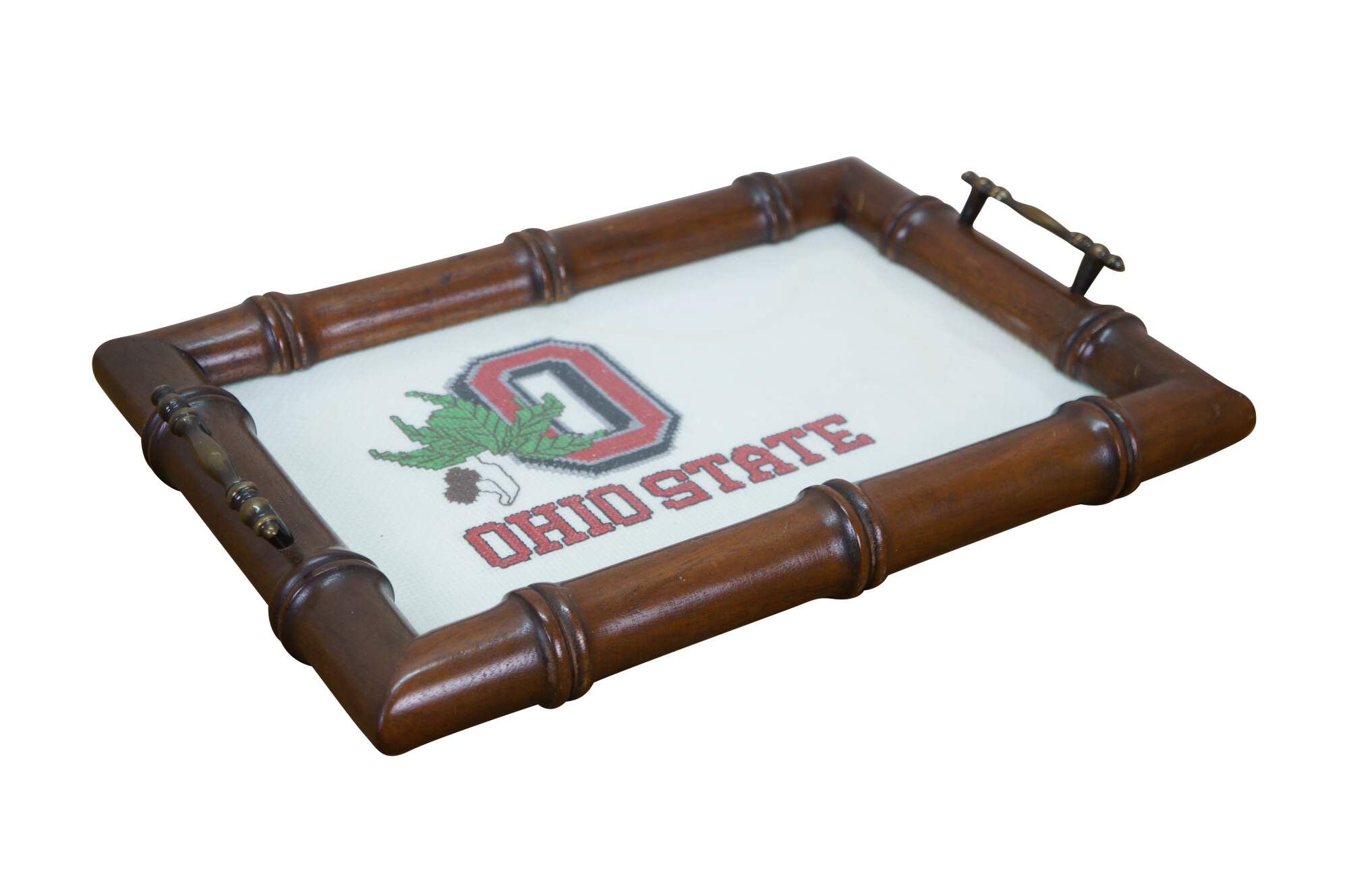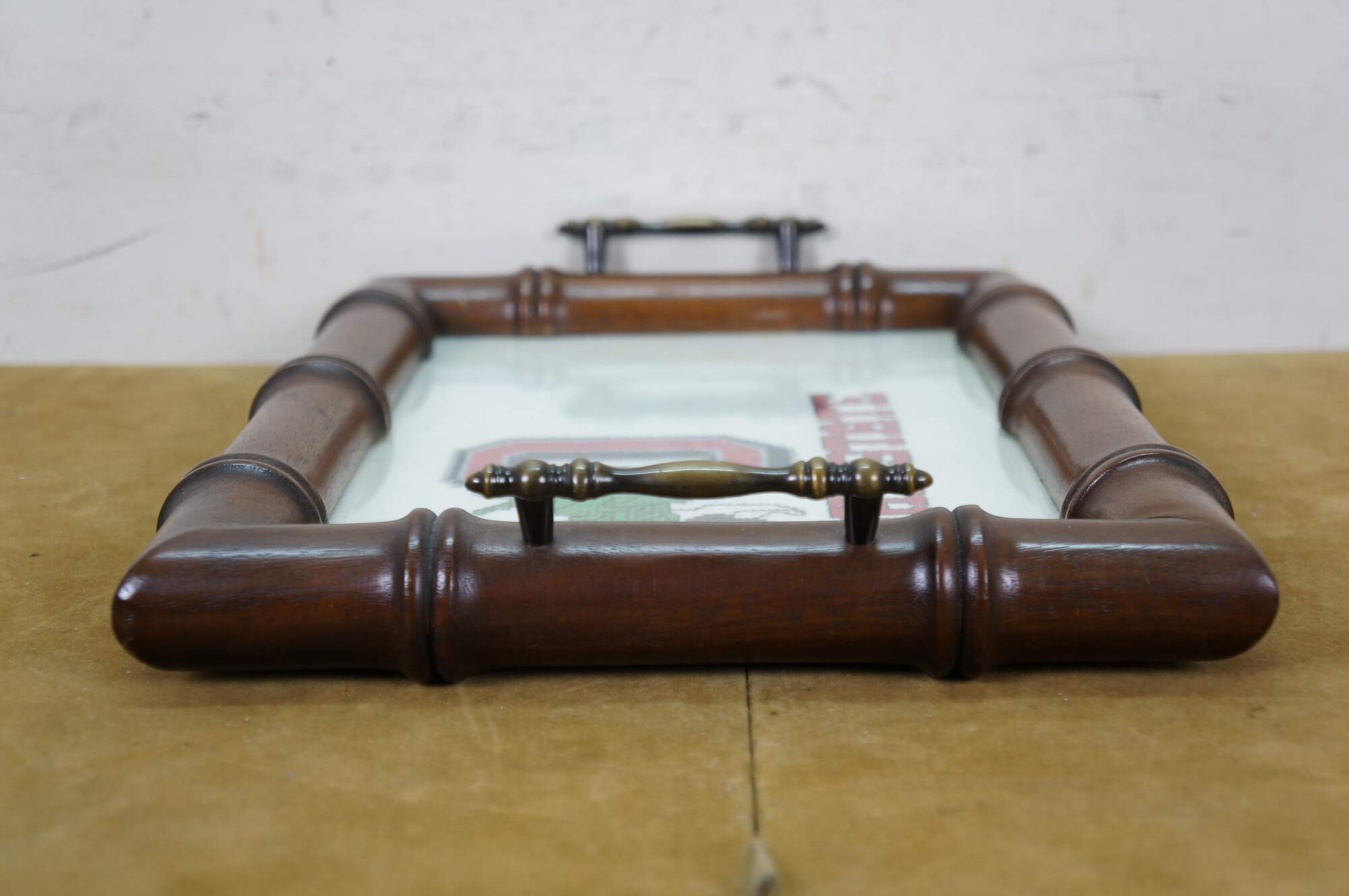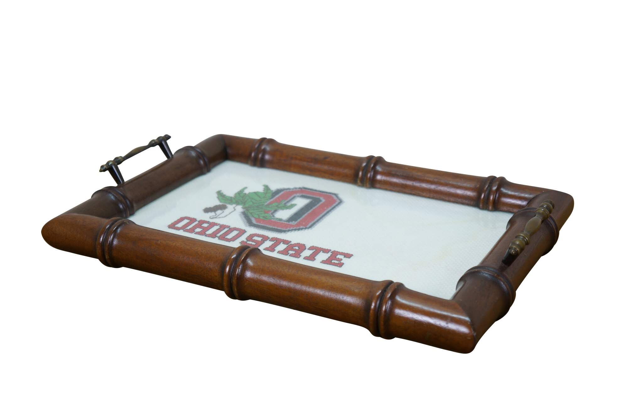 Late 20th century wooden vanity / bar tray featuring a carved faux bamboo wood frame and pair of turned brass handles. Glass topped center has an insert showing a cross stitch design of The Ohio State University logo and buckeye leaves.