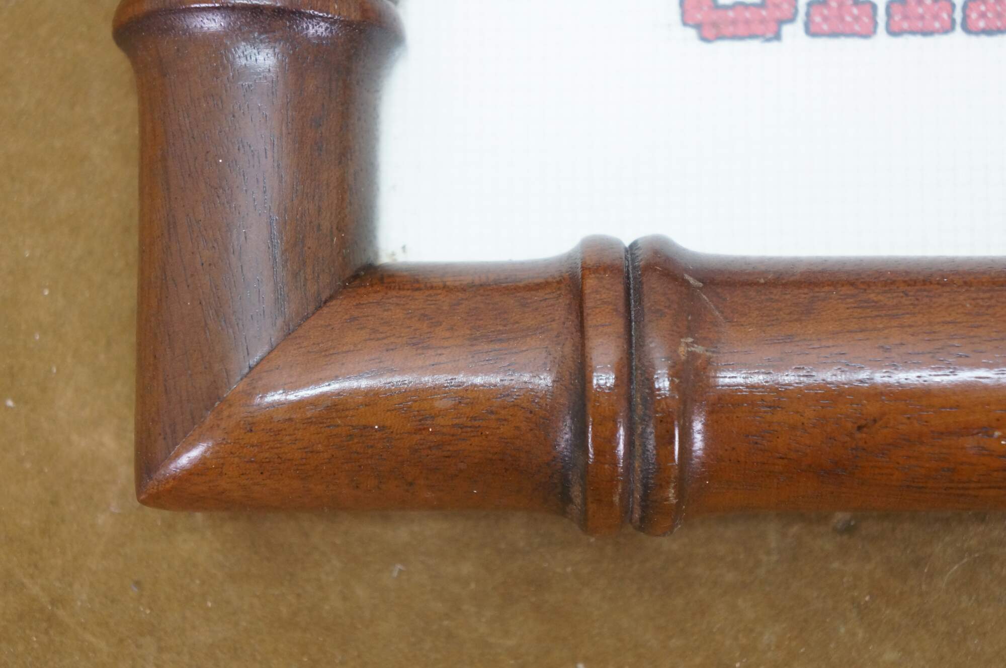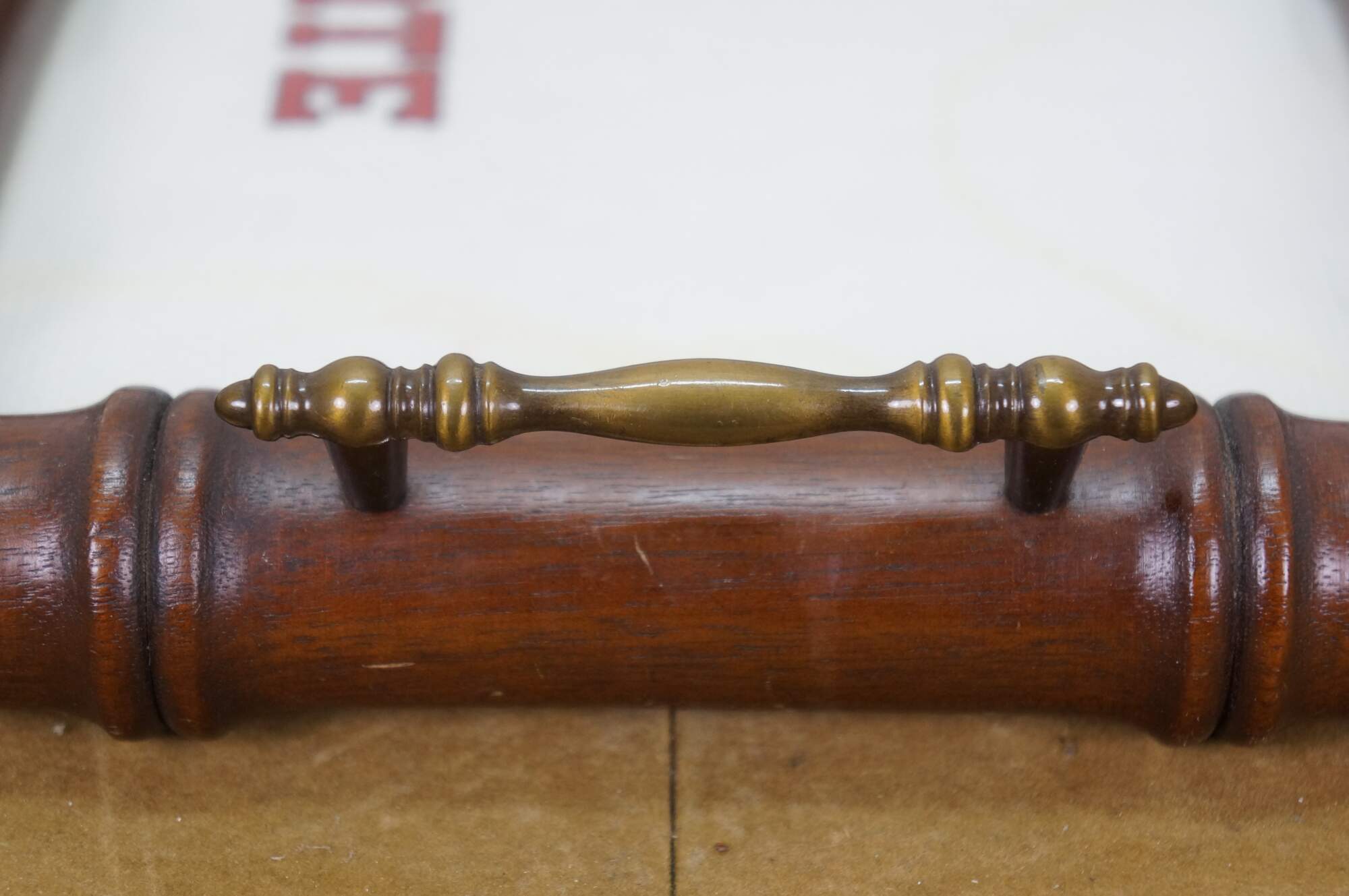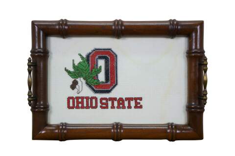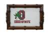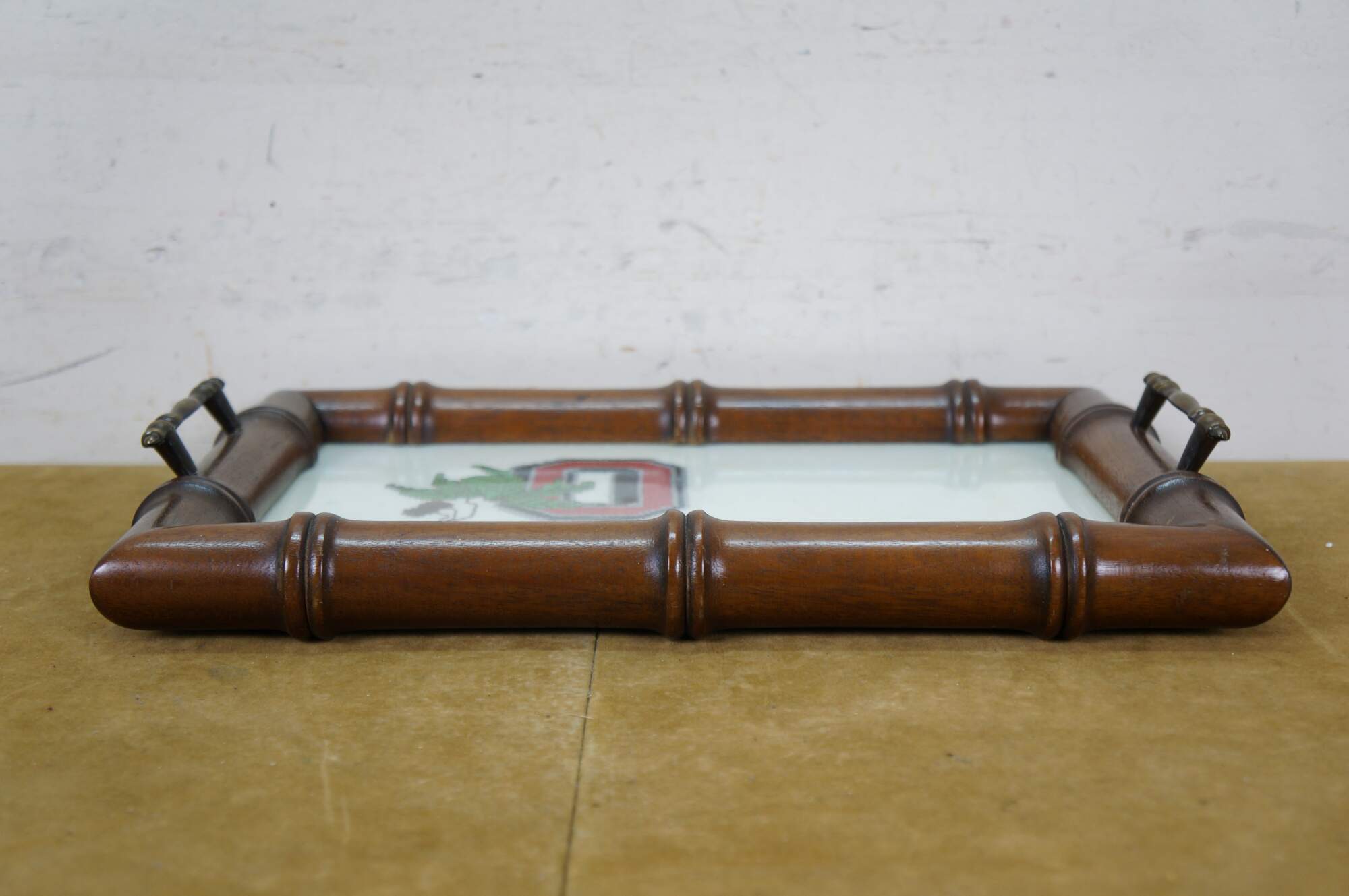 Late 20th century wooden vanity / bar tray featuring a carved faux bamboo wood frame and pair of turned brass handles. Glass topped center has an insert showing a cross stitch design of The Ohio State University logo and buckeye leaves.
