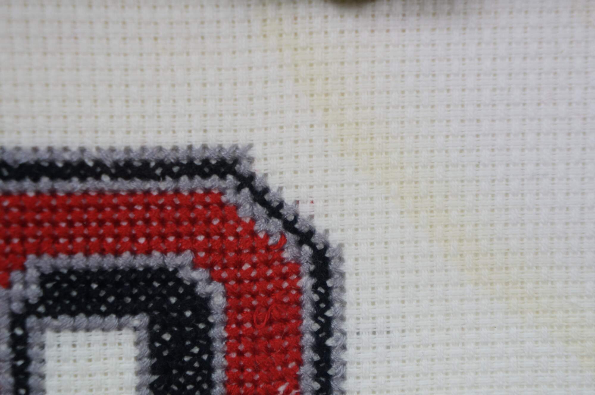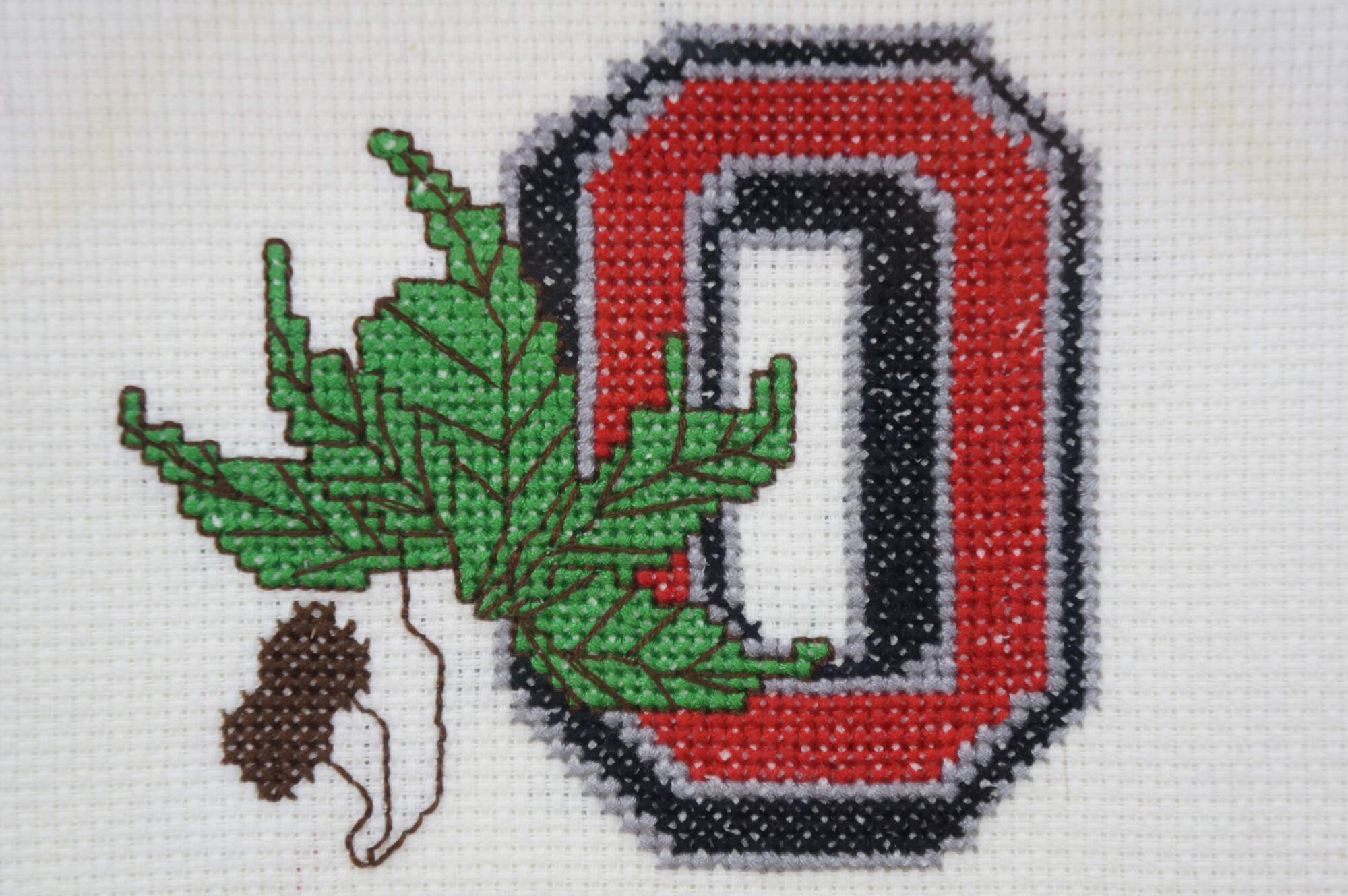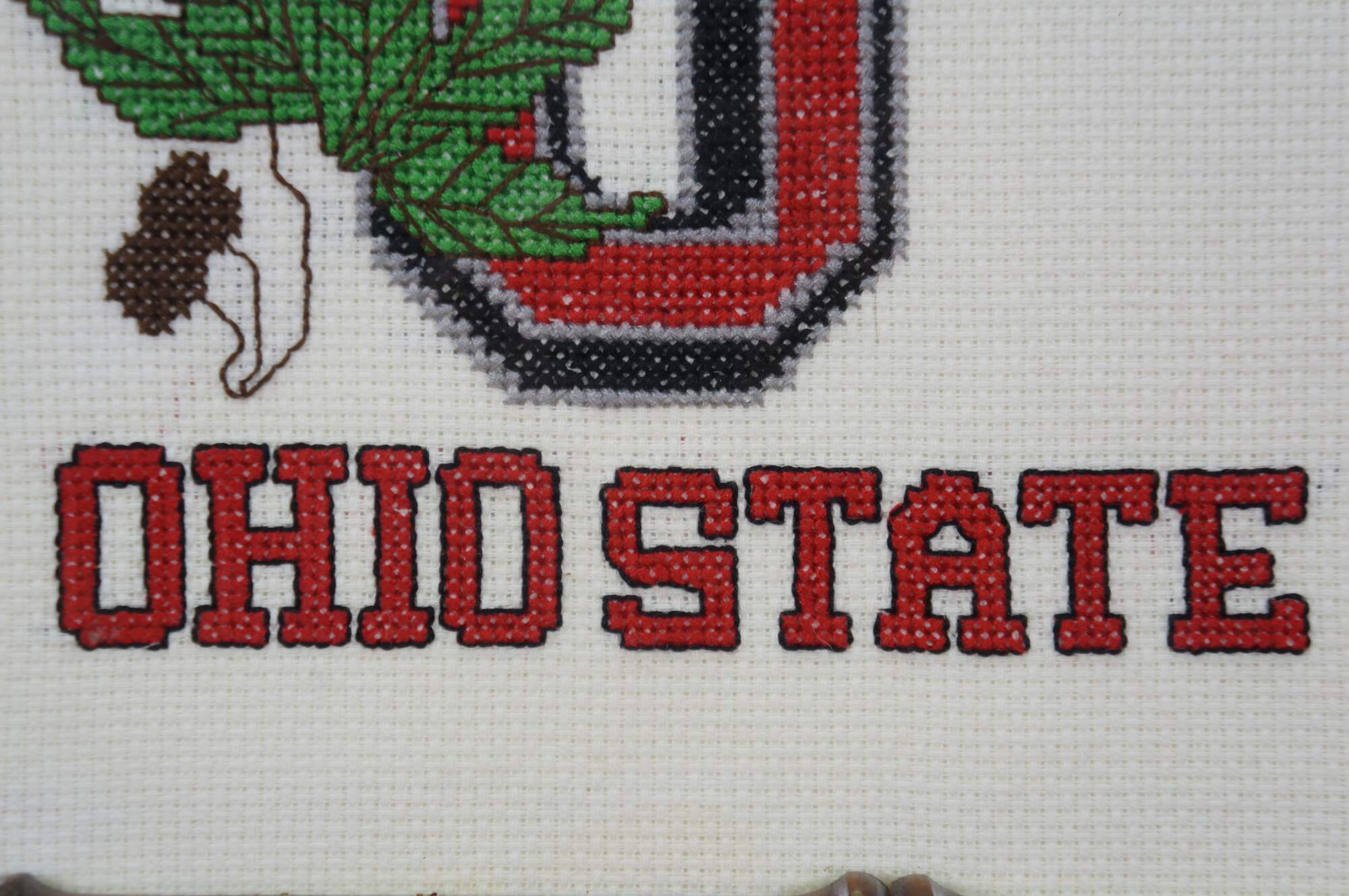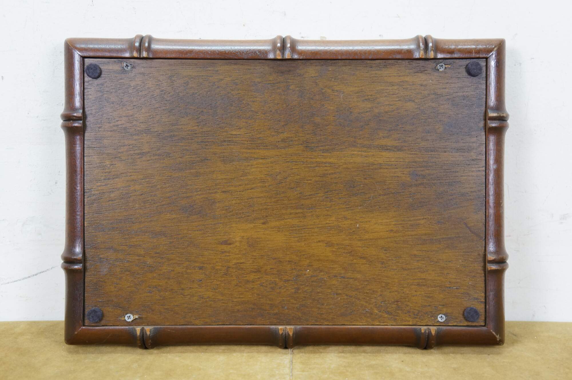 Late 20th century wooden vanity / bar tray featuring a carved faux bamboo wood frame and pair of turned brass handles. Glass topped center has an insert showing a cross stitch design of The Ohio State University logo and buckeye leaves.