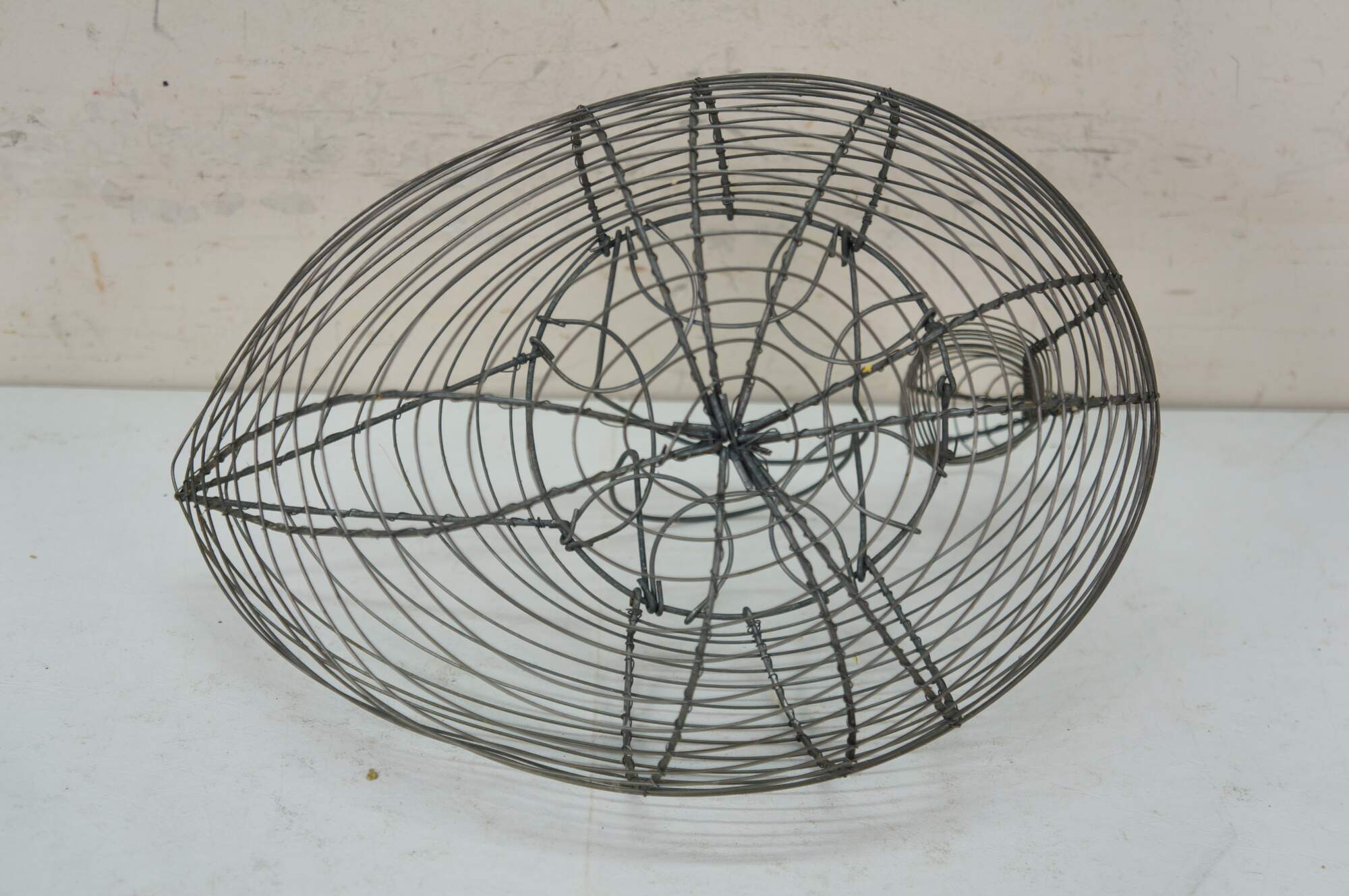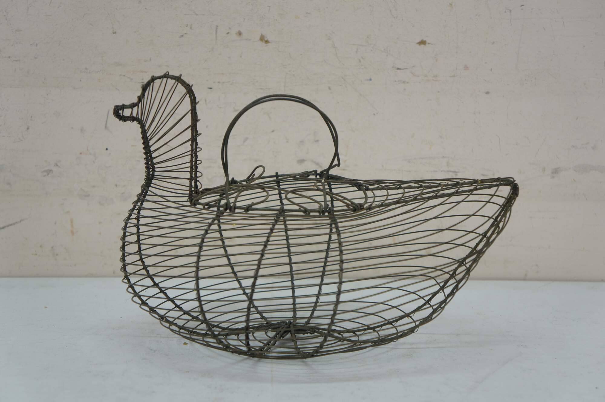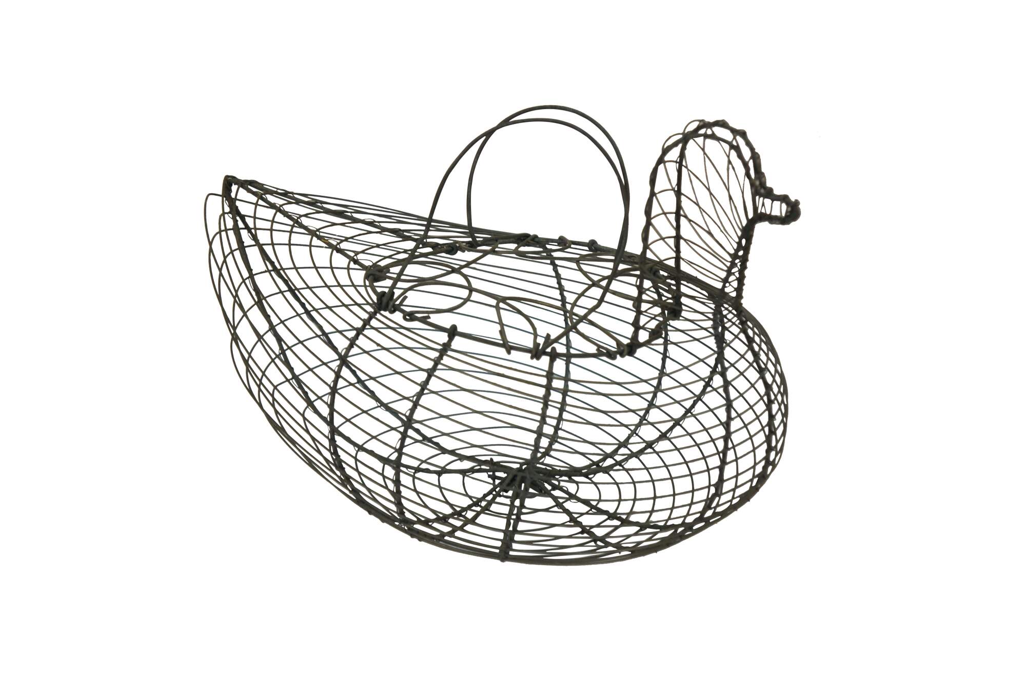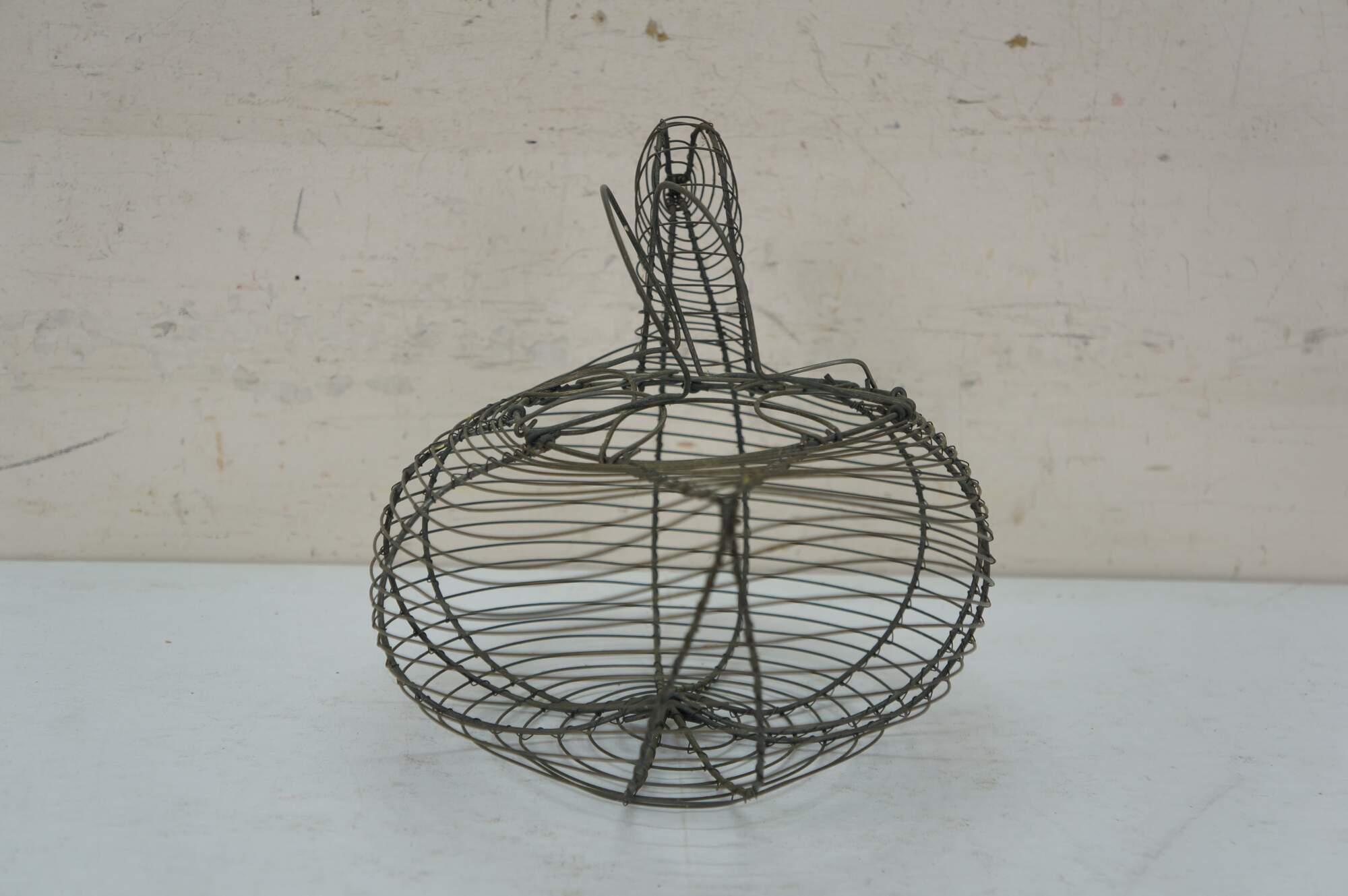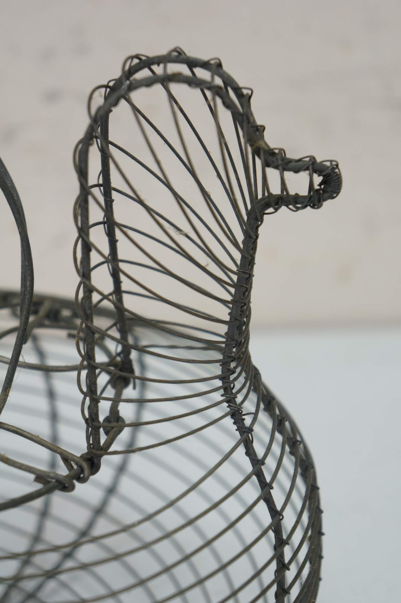 Vintage 20th century wire egg gathering basket in the shape of a hen / chicken with two arched handles and scalloped loop closure over the opening.