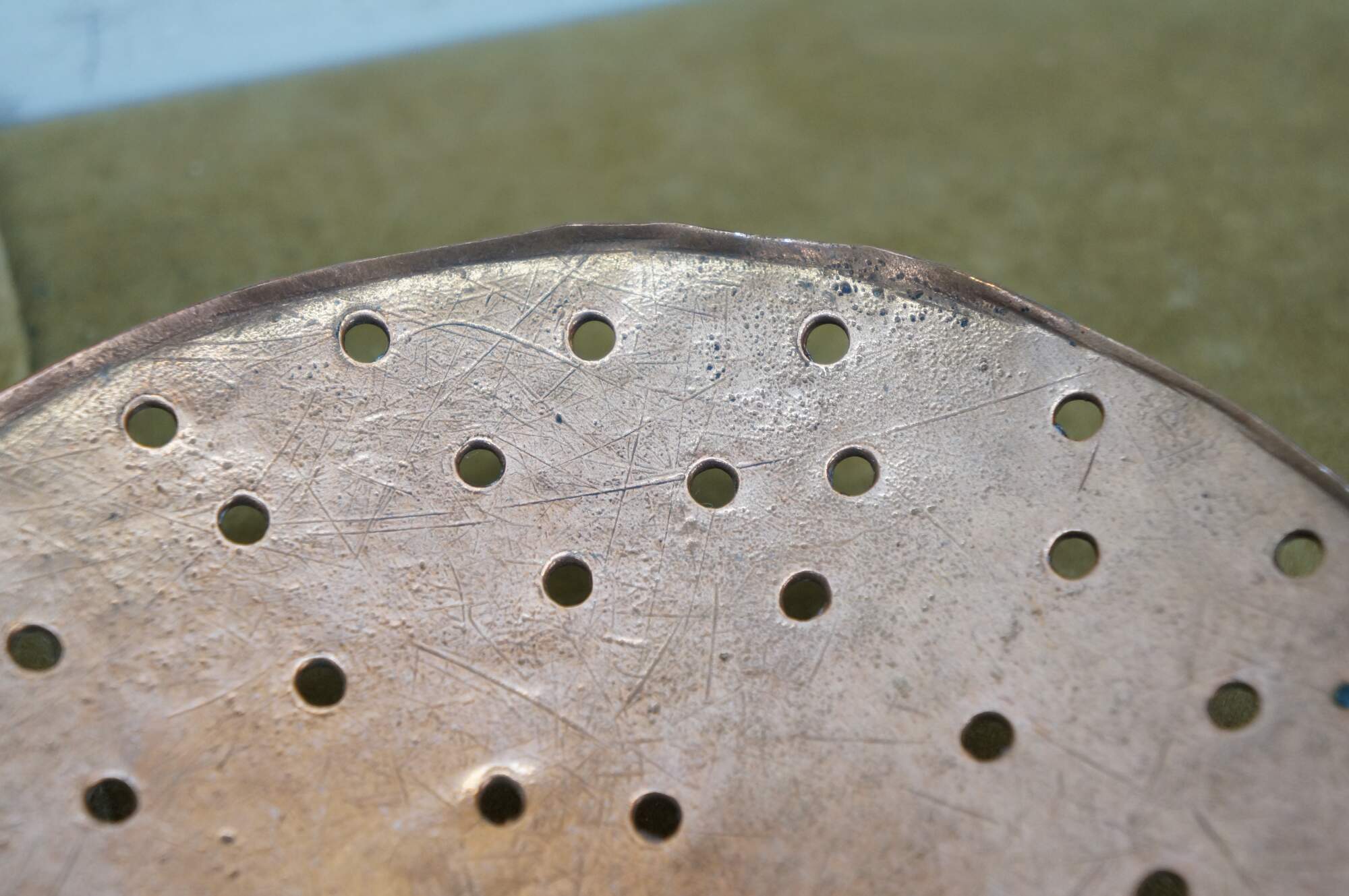 Antique French copper ladle / sieve / strainer featuring a round, flat head studded with holes and flat iron handle with hanging ring at the end.