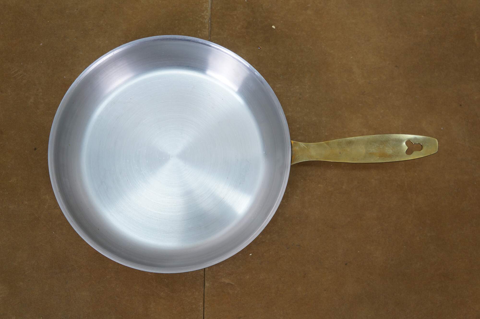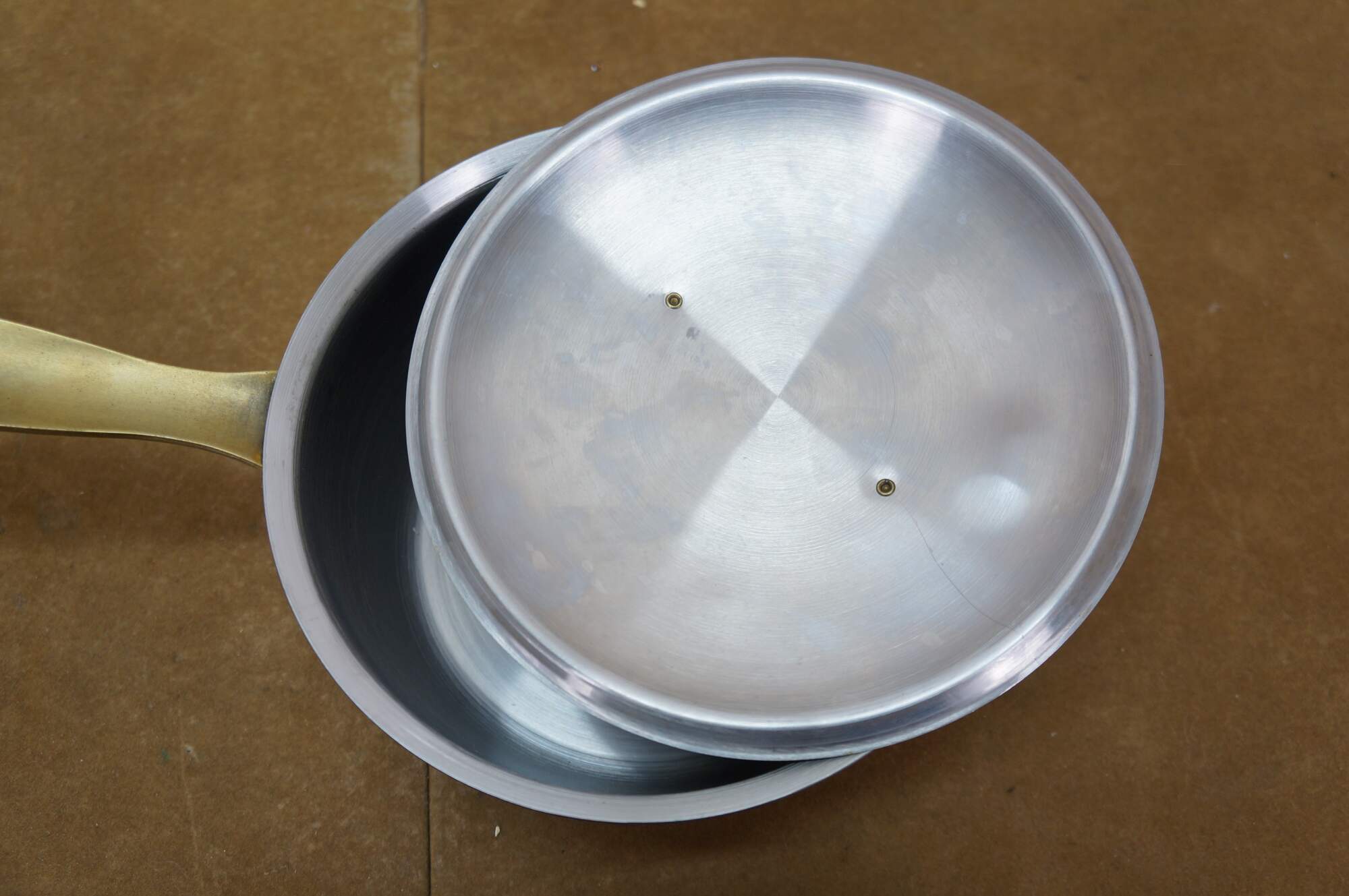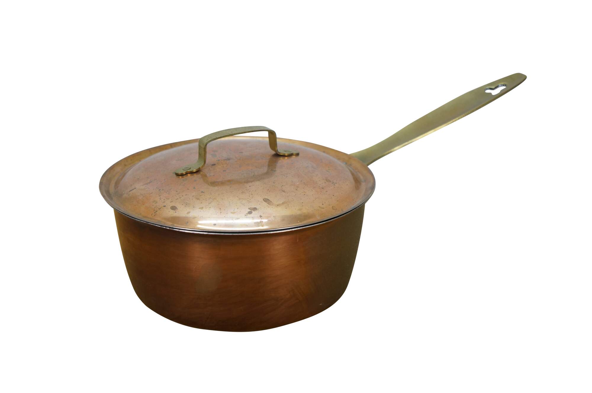 Pair of late 20th century copper pans by Spartan Copperware. Includes one saute / frying pan and one sauce pan with lid. Brass handles.