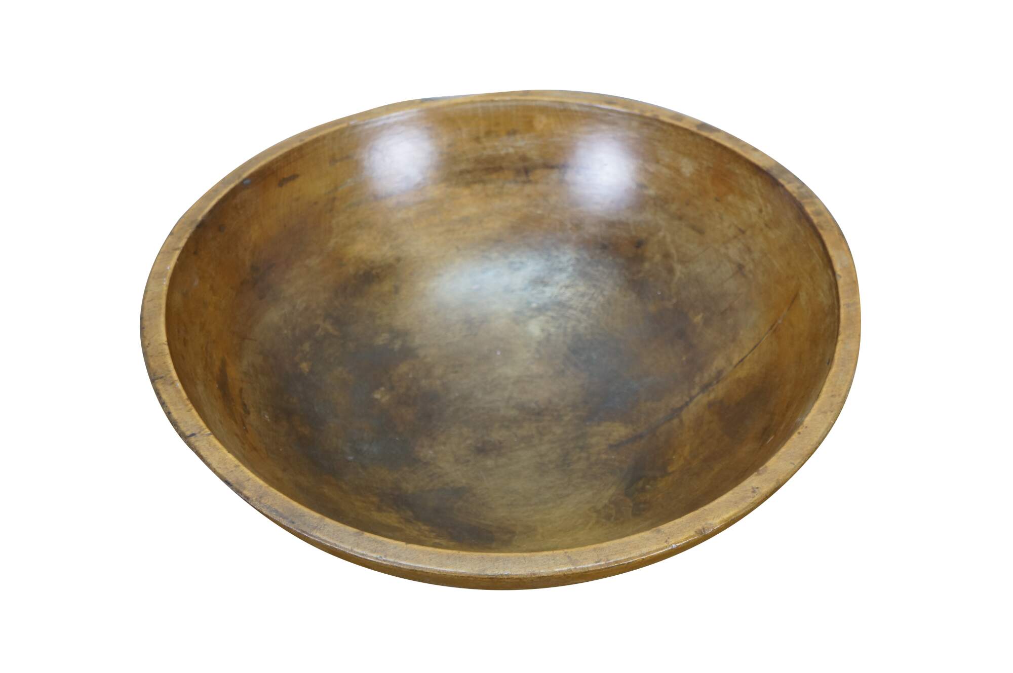 Large antique folk art country farmhouse dough mixing or centerpiece fruit bowl. Made of turned maple wood featuring a round form with banded lip and a nice, glossy finish.
