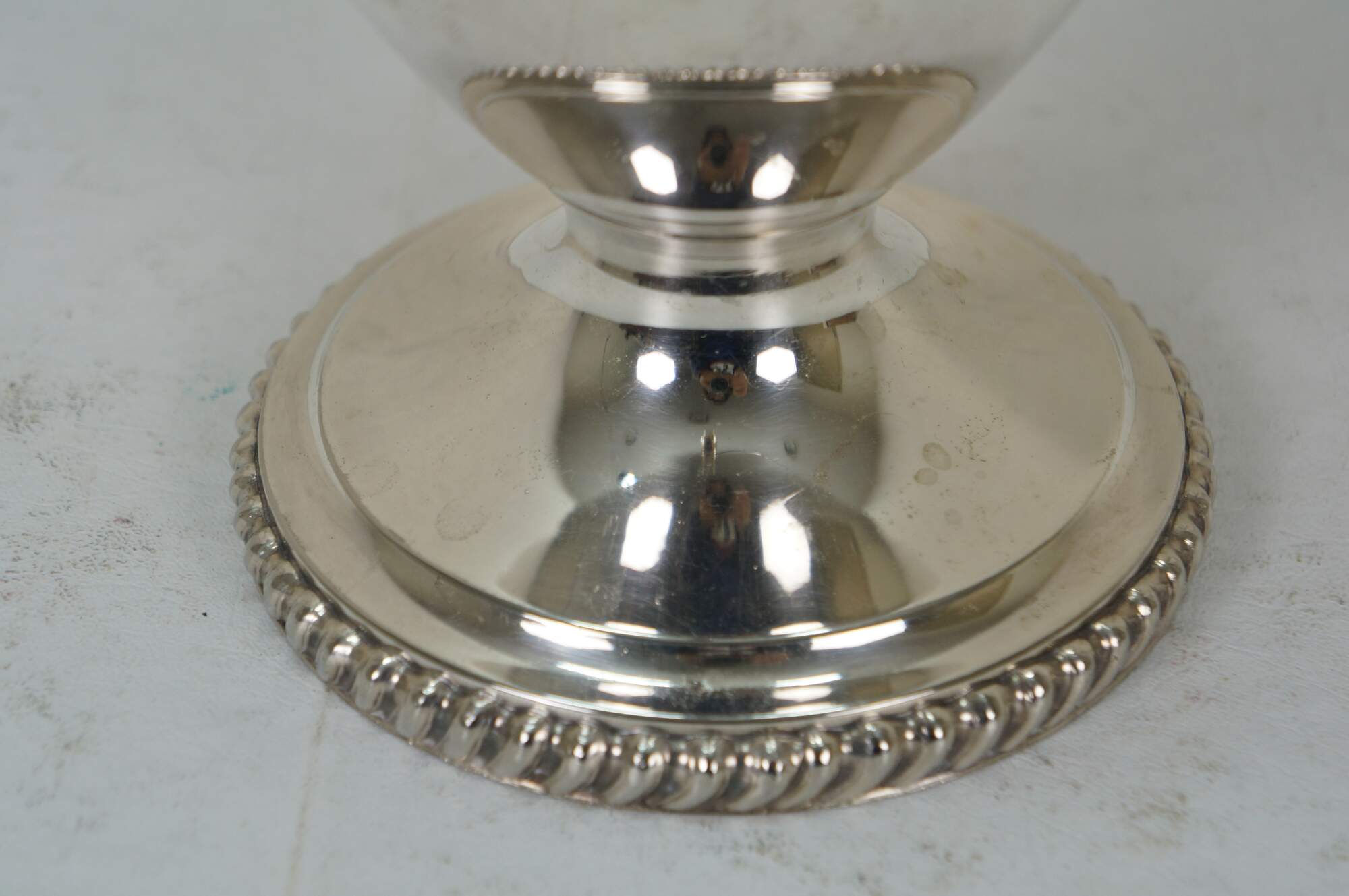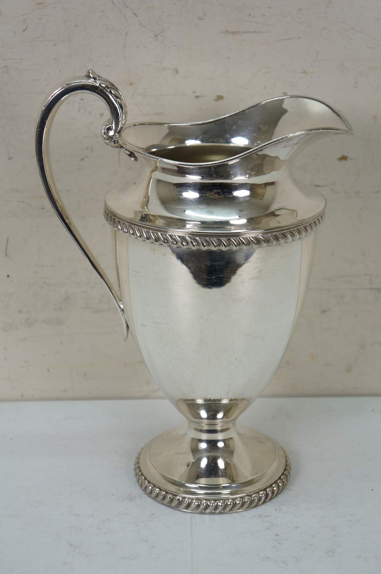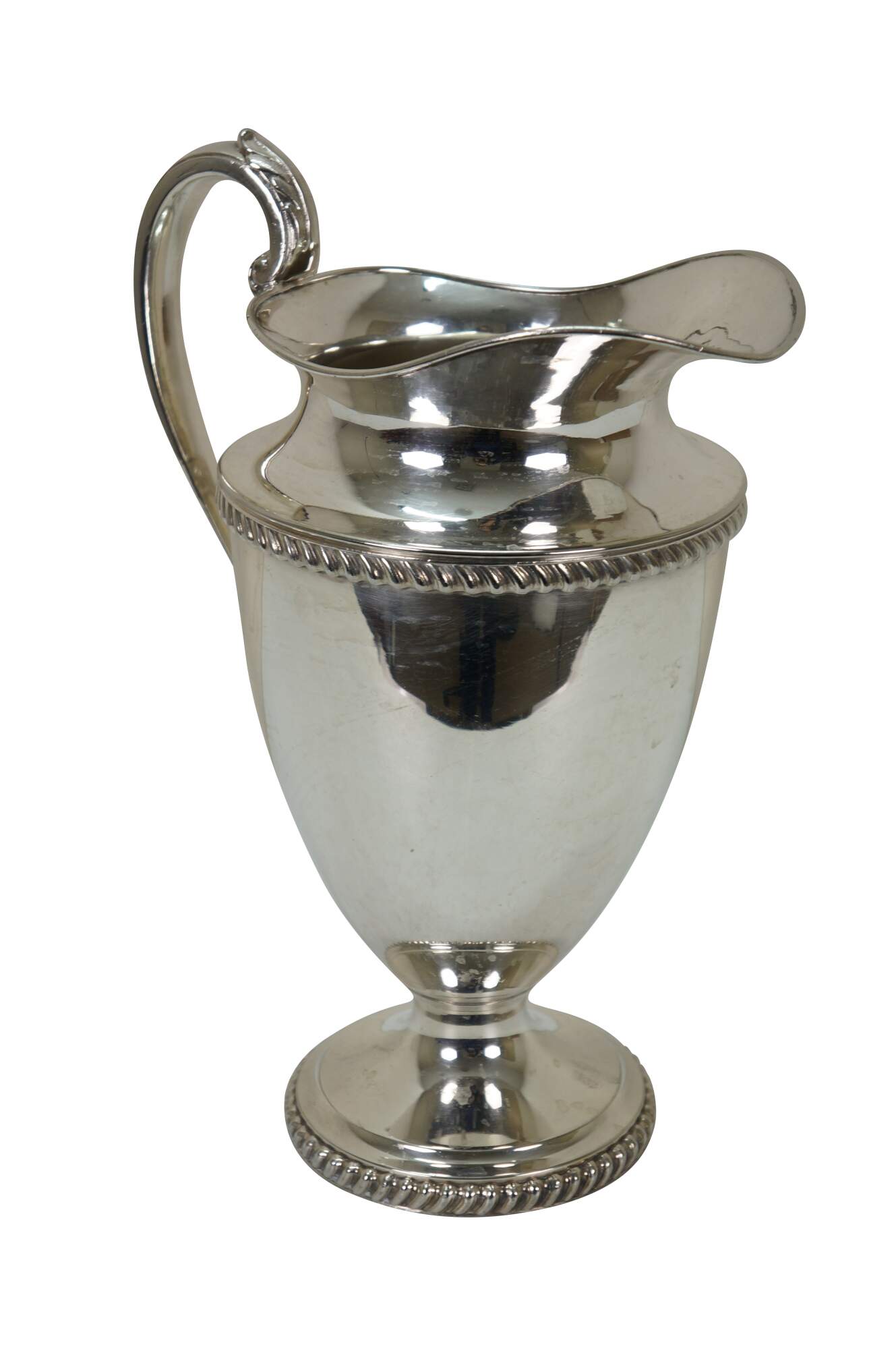 Mid 20th century Friedman Silver Company number 3153 silverplated water pitcher / jug. 5 Pint Capacity. Neoclassical trophy urn shape with rope twist accents and leaf on the handle. Monogrammed with the initial P.