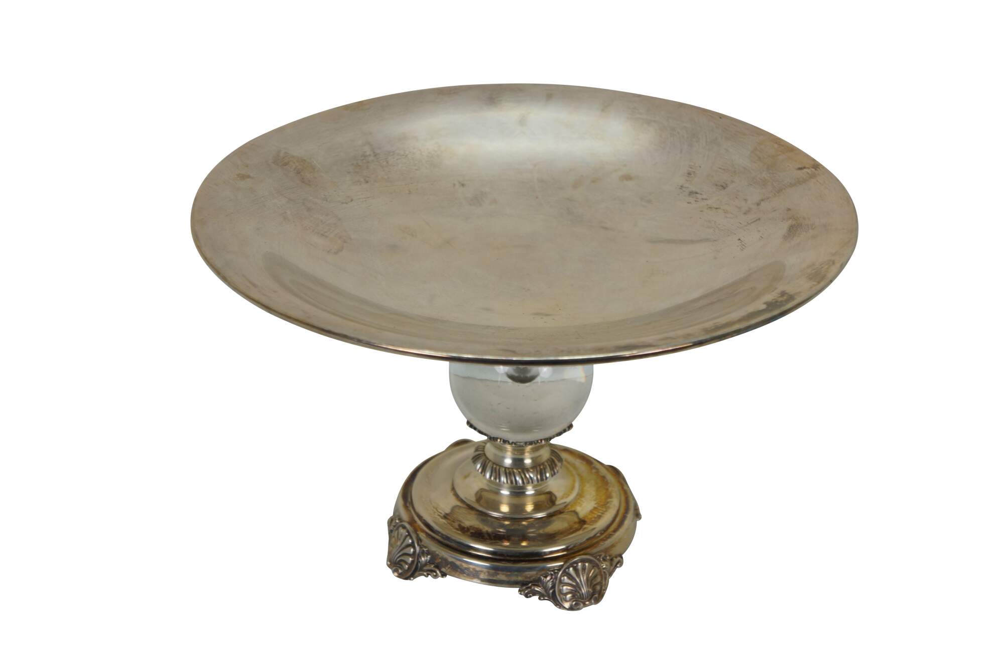 Circa mid 20th century Stirling Castle number S91007 pedestal compote by Quaker Silver Company. Round base with scallop shell accents below a clear glass orb with suspended bubble, trimmed in acanthus leaves and topped with a plain compote / bowl.