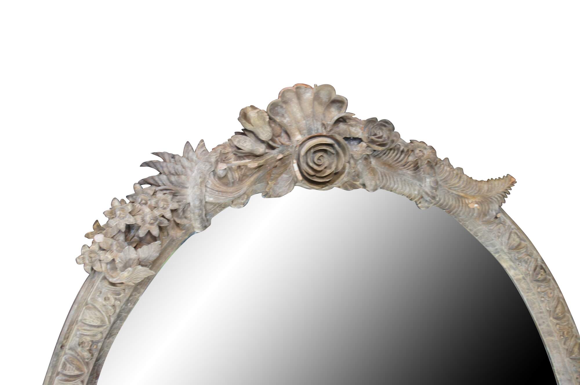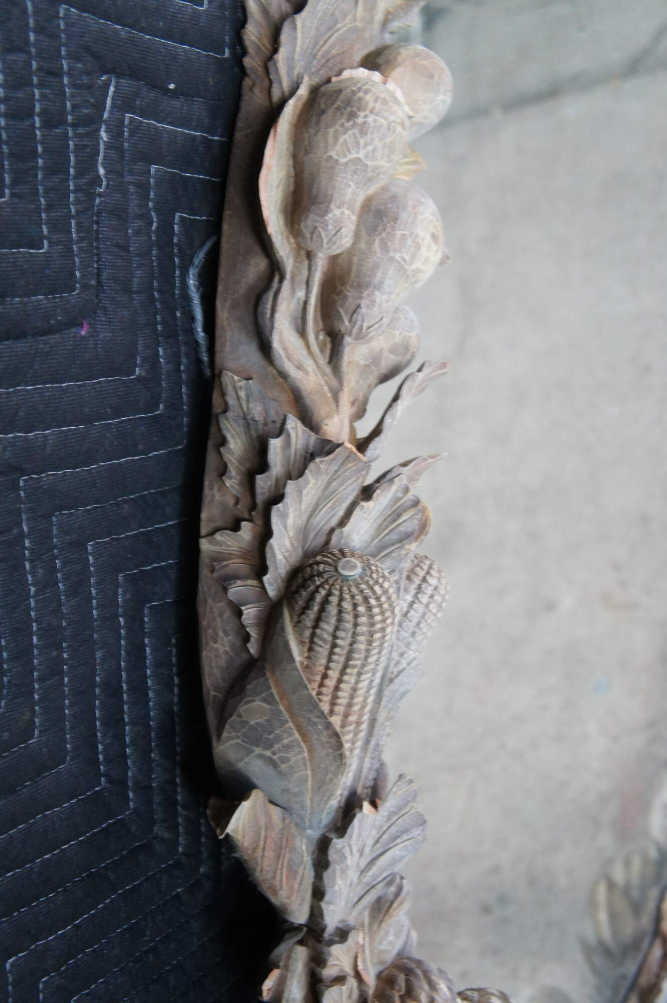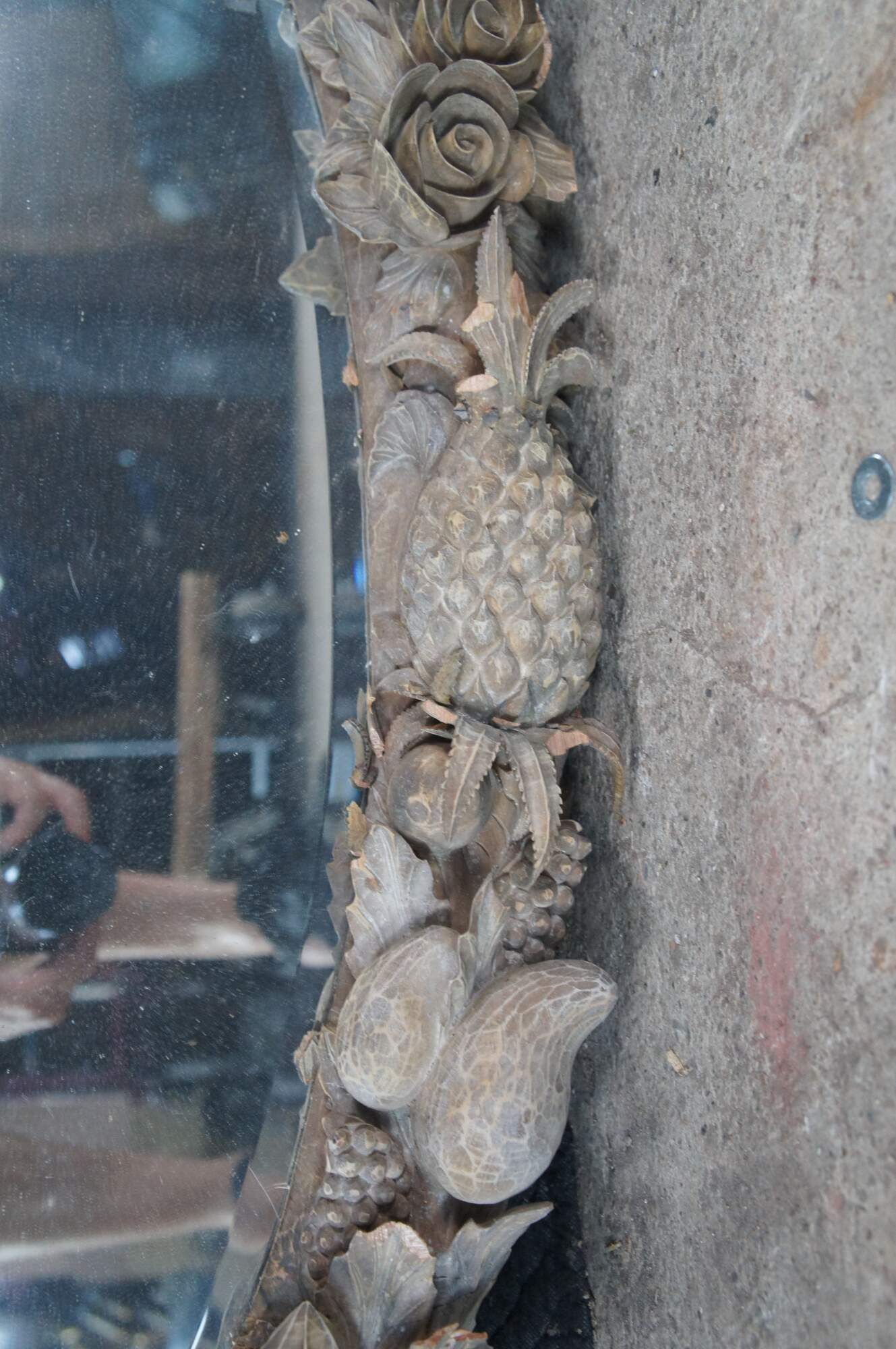 Vintage ornate Dauphine Harrison & Gil mantel / vanity mirror featuring ornate high relief carvings of foliate and fruit.