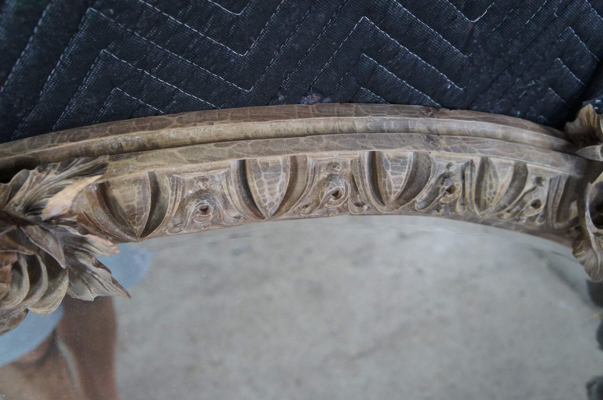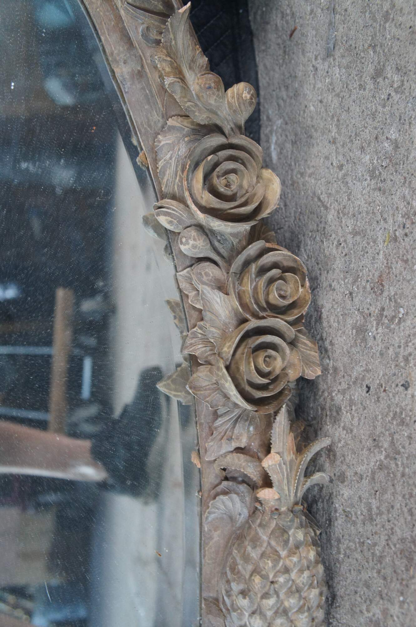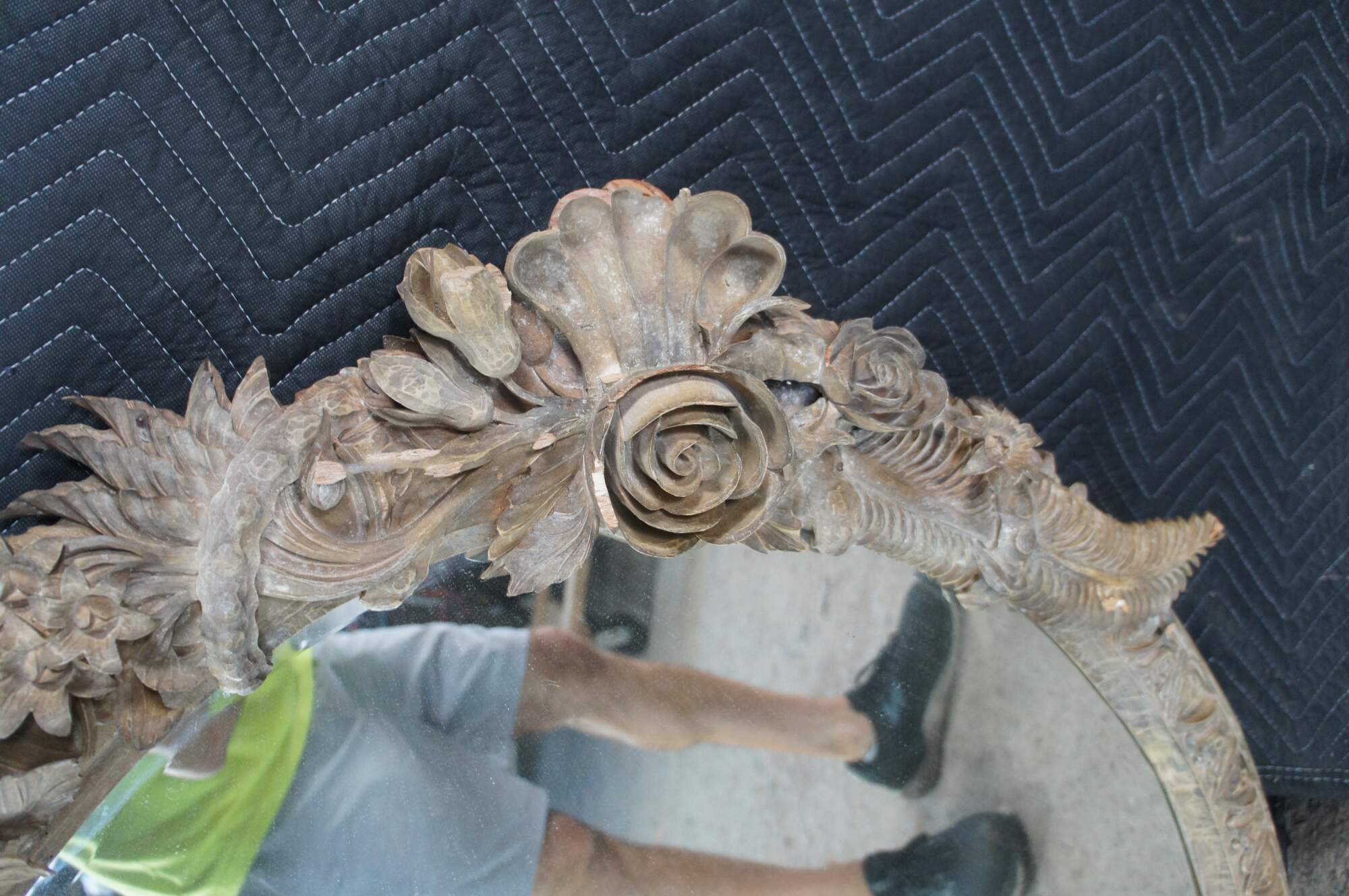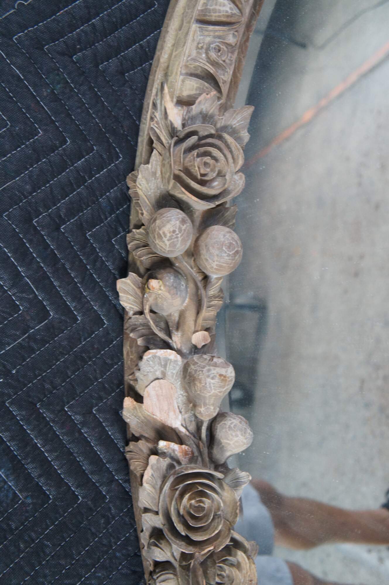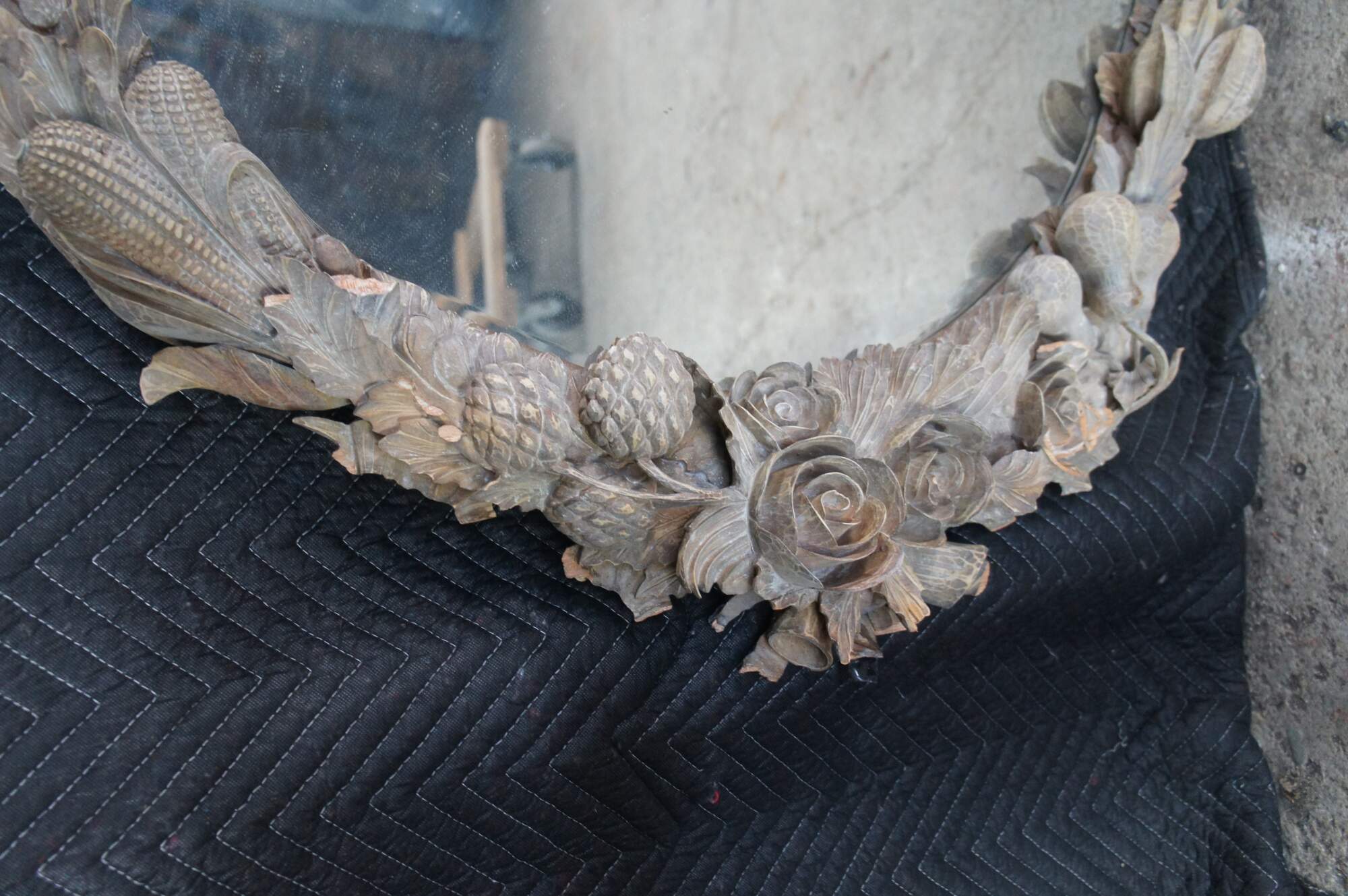 Poor condition. This mirror has damage throughout, many missing pieces of trim etc. When moved, additional pieces will likely fall off. Some broken pieces could be reattached and are included, see last picture.