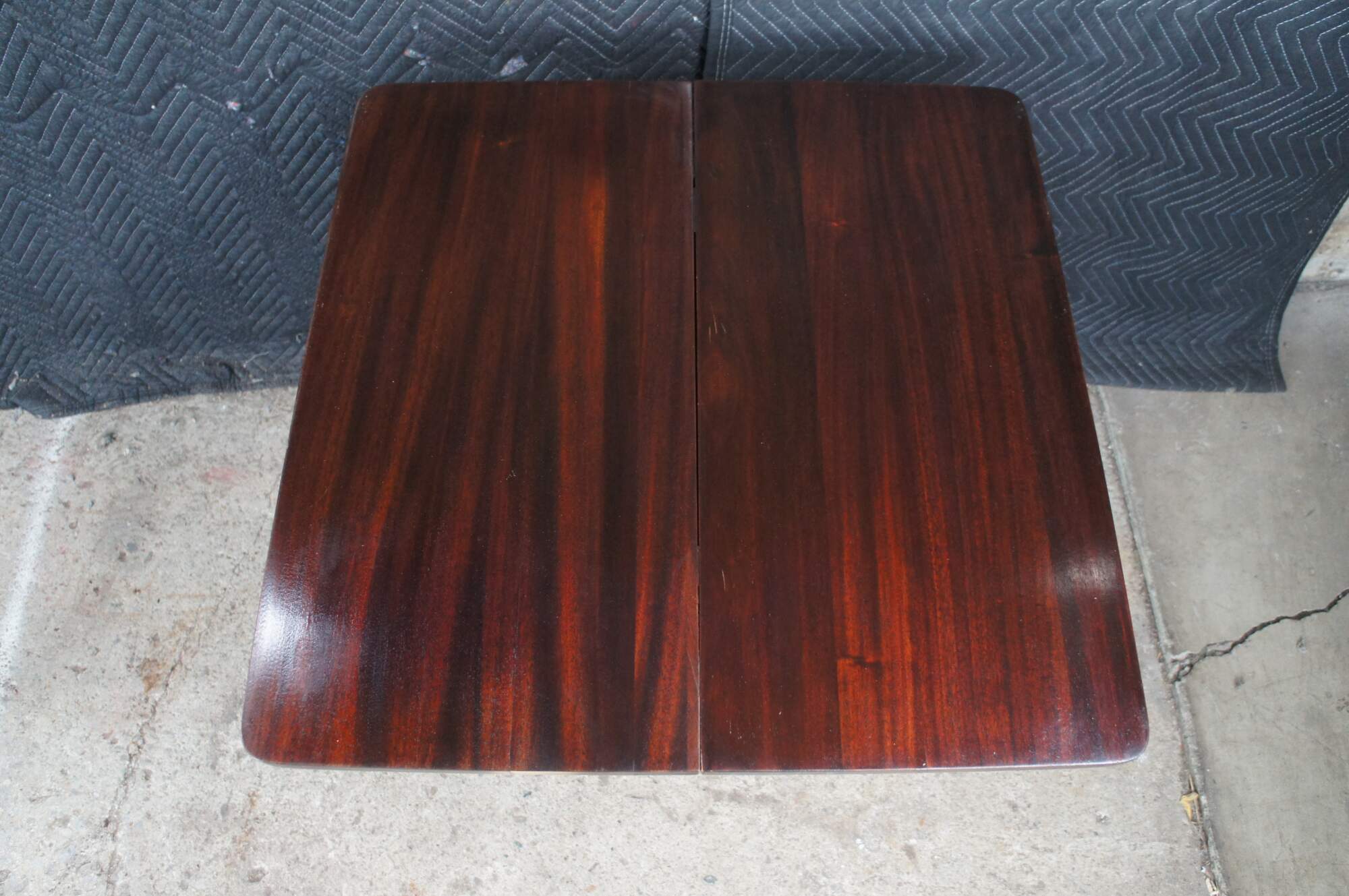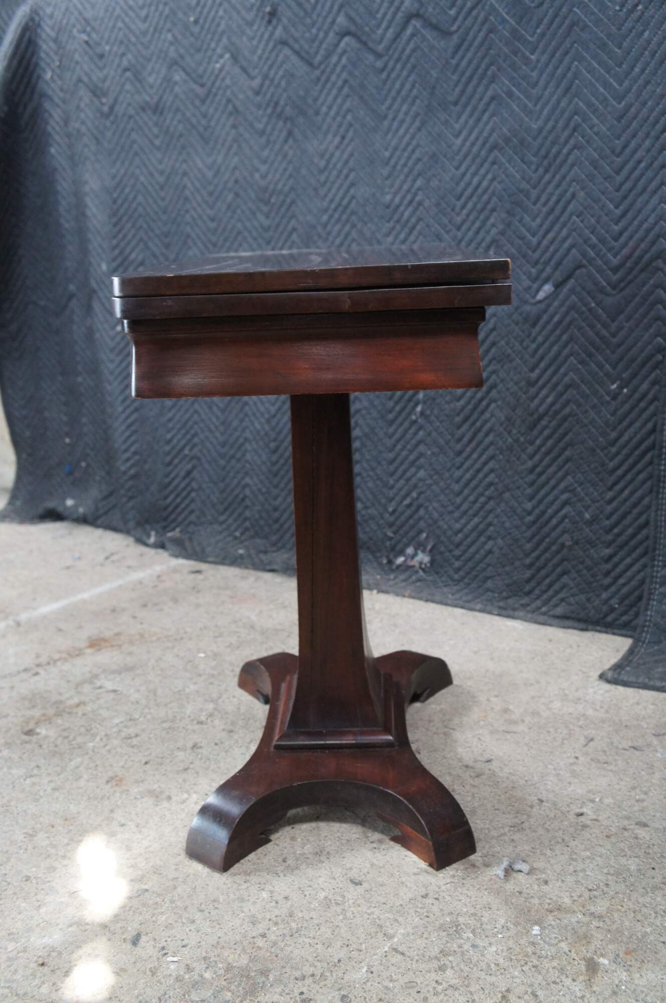 Antique 19th Century Victorian Era American Empire flip top game table or console. Made of mahogany featuring American Empire styling with rectangular form, tapered pedestal over a splayed base with curved feet.