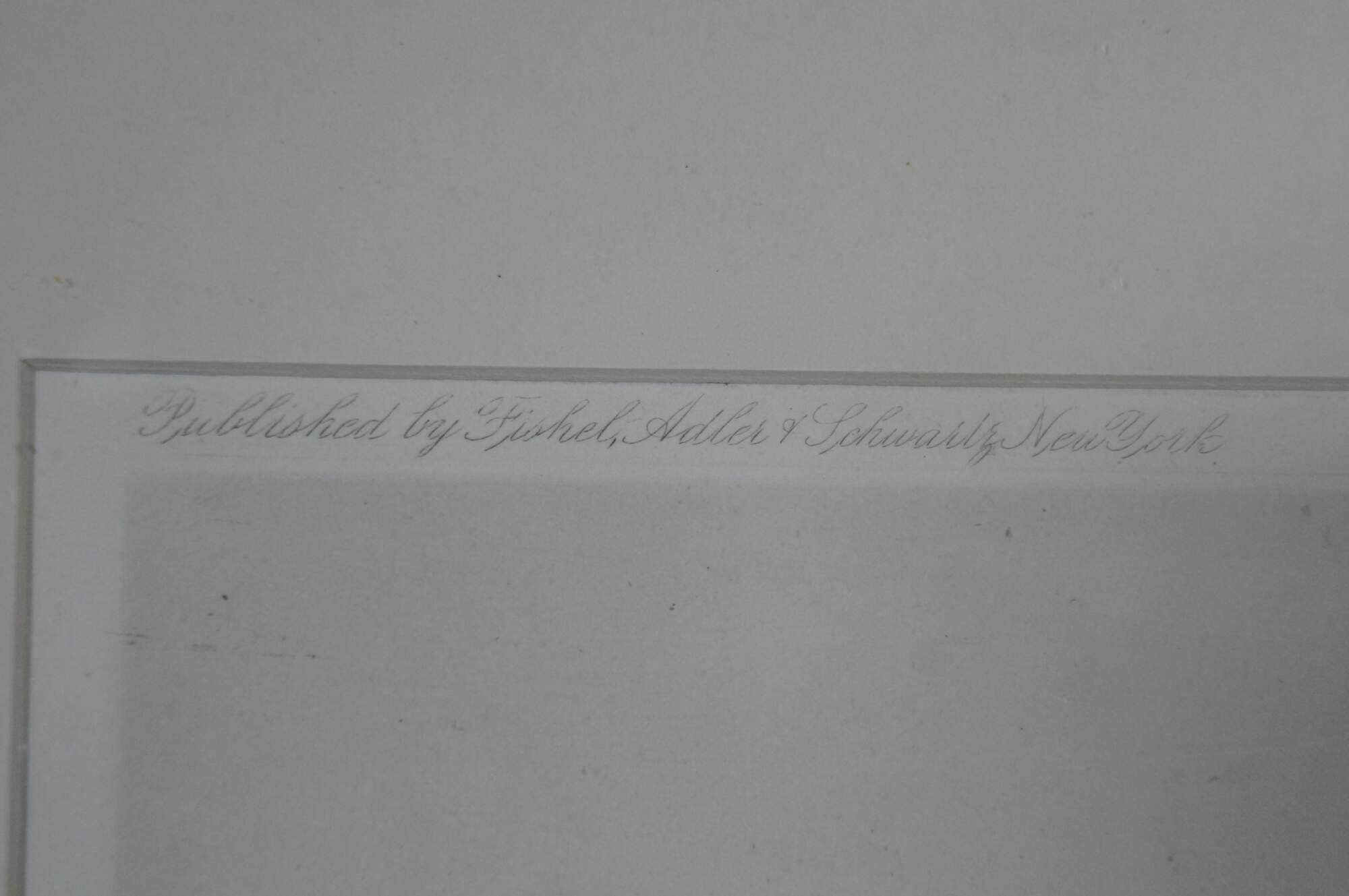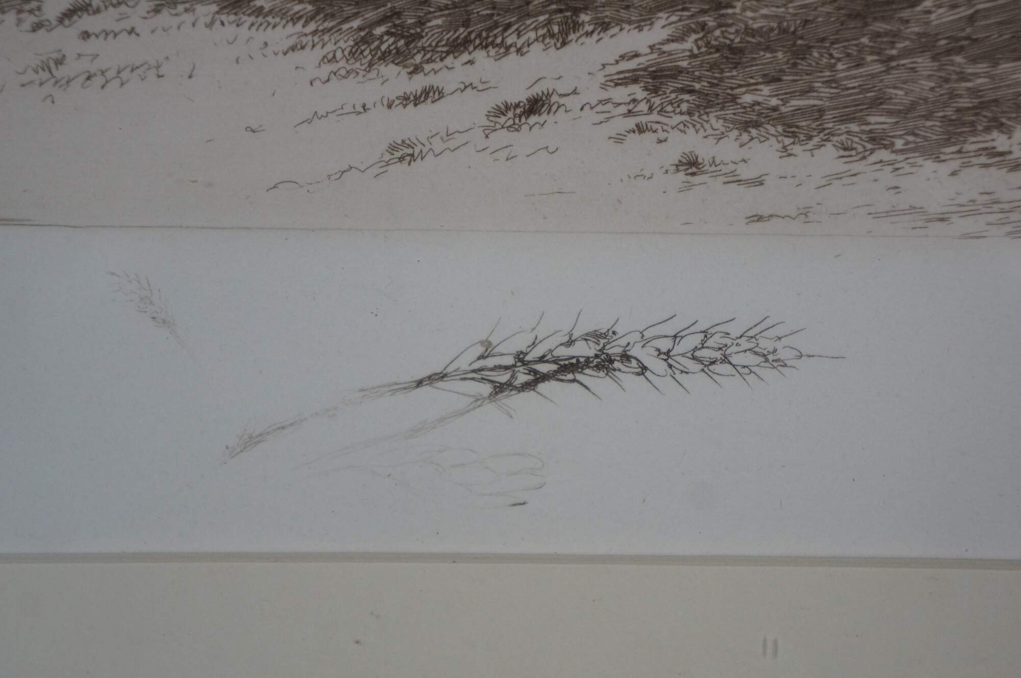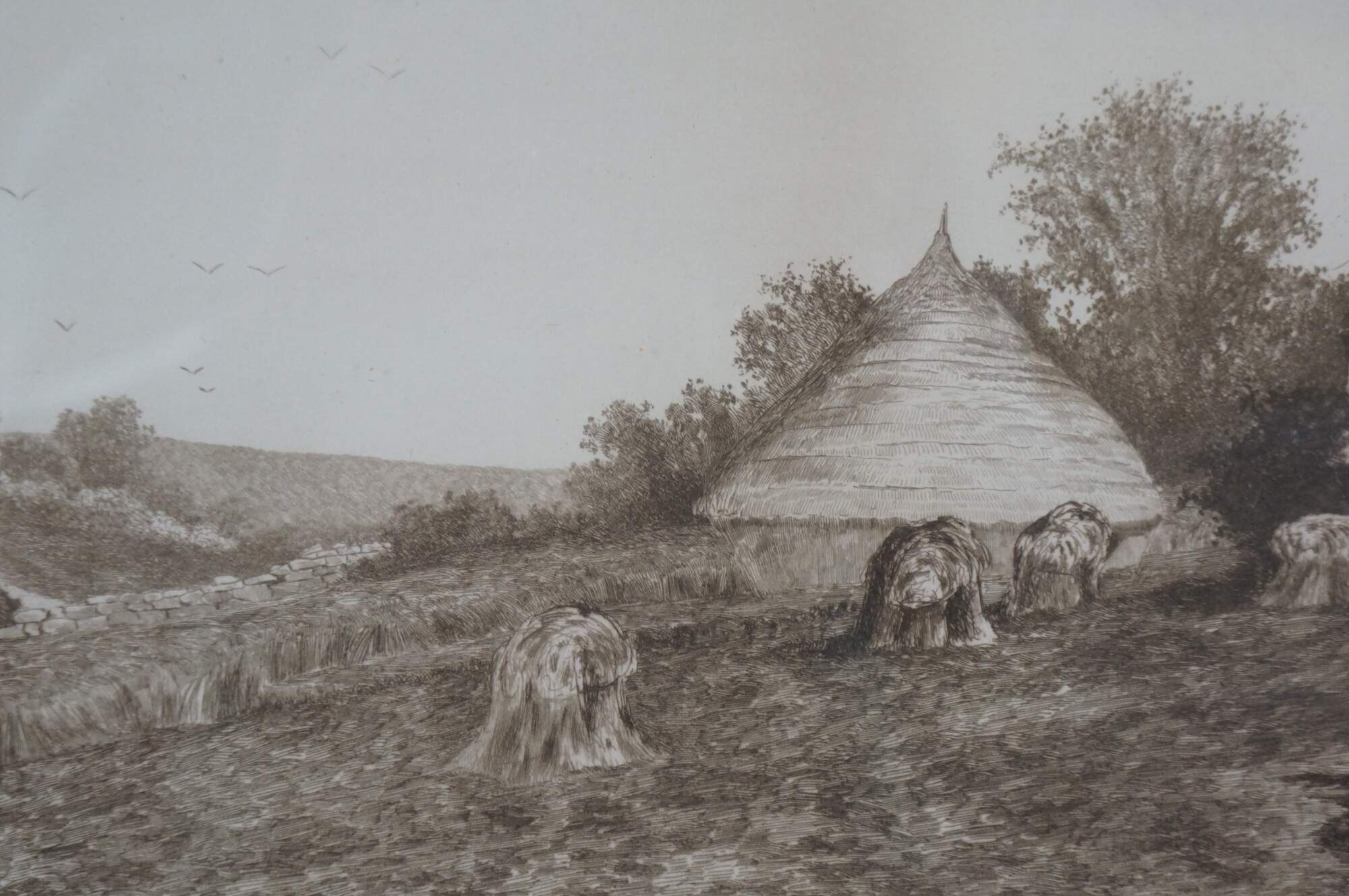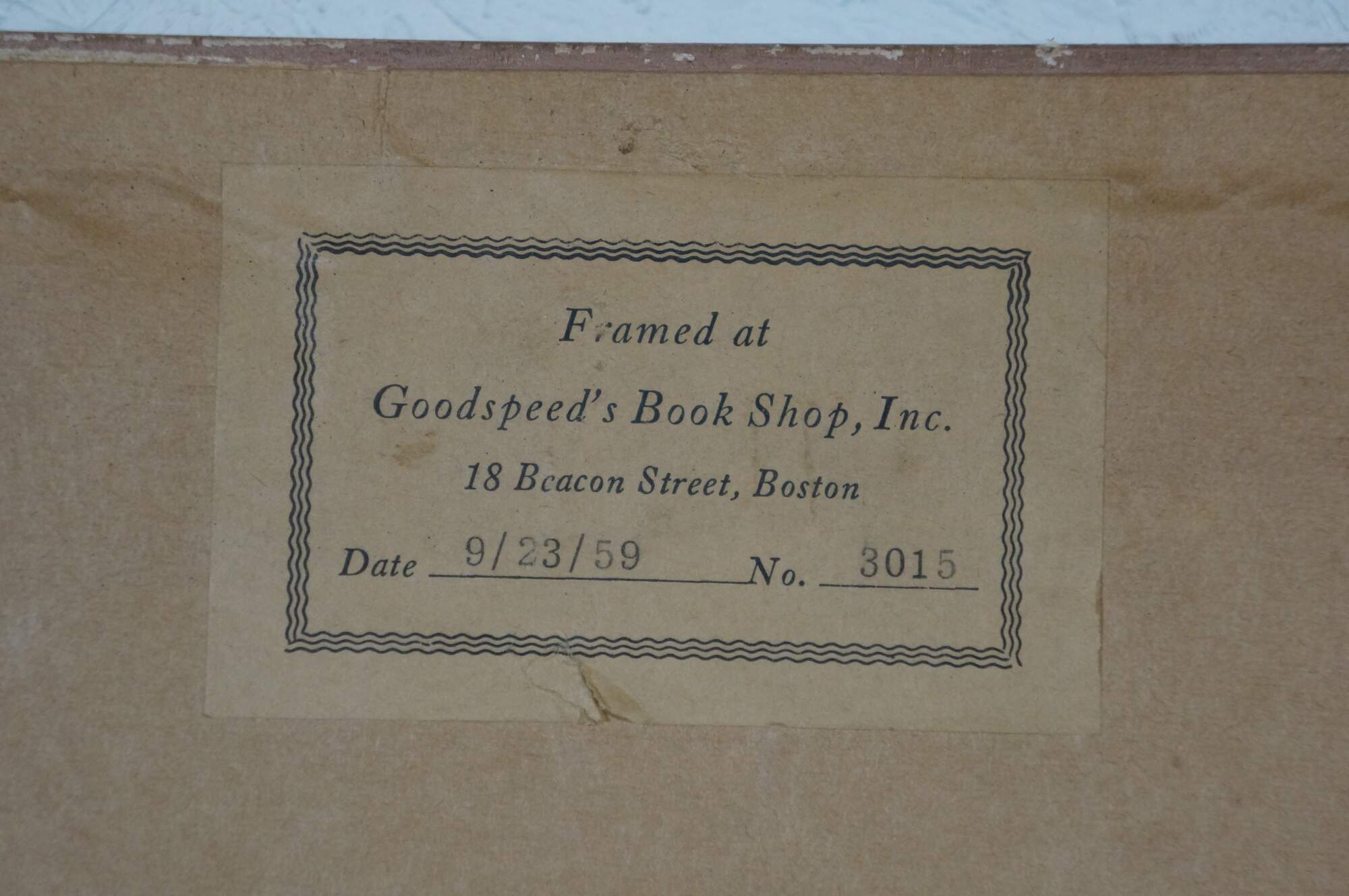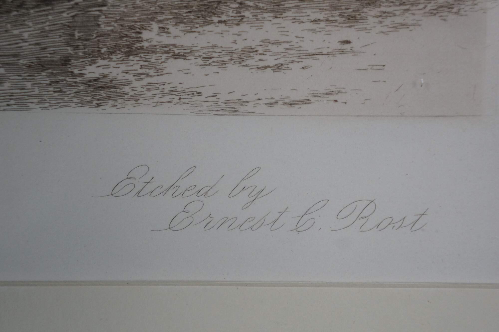 Late 19th century black and white etching by Ernest C. Rost. Harvest landscape showing figures baling hay into a cart near a country farmhouse. Remarke of a head of wheat, lower left. "Etched by Ernest C. rost" printed, lower right. Published by fishel, Adler, & Schwartz, New York. Giltwood frame with raised bevel; white mat. Framed at Goodspeed's Book Shop, Inc - 9/23/1959 - No 3015.