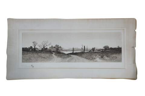 Late 19th century black and white etching by Ernest C. Rost. Panoramic landscape of a split in a country road between a farmhouse and a coastline of docked sailboats. "Etched by Ernest C. Rost" printed, lower left. Remarke of an anchor, lower left. Published by Fishel, Adler & Schwartz, New York. Paper; un-framed.