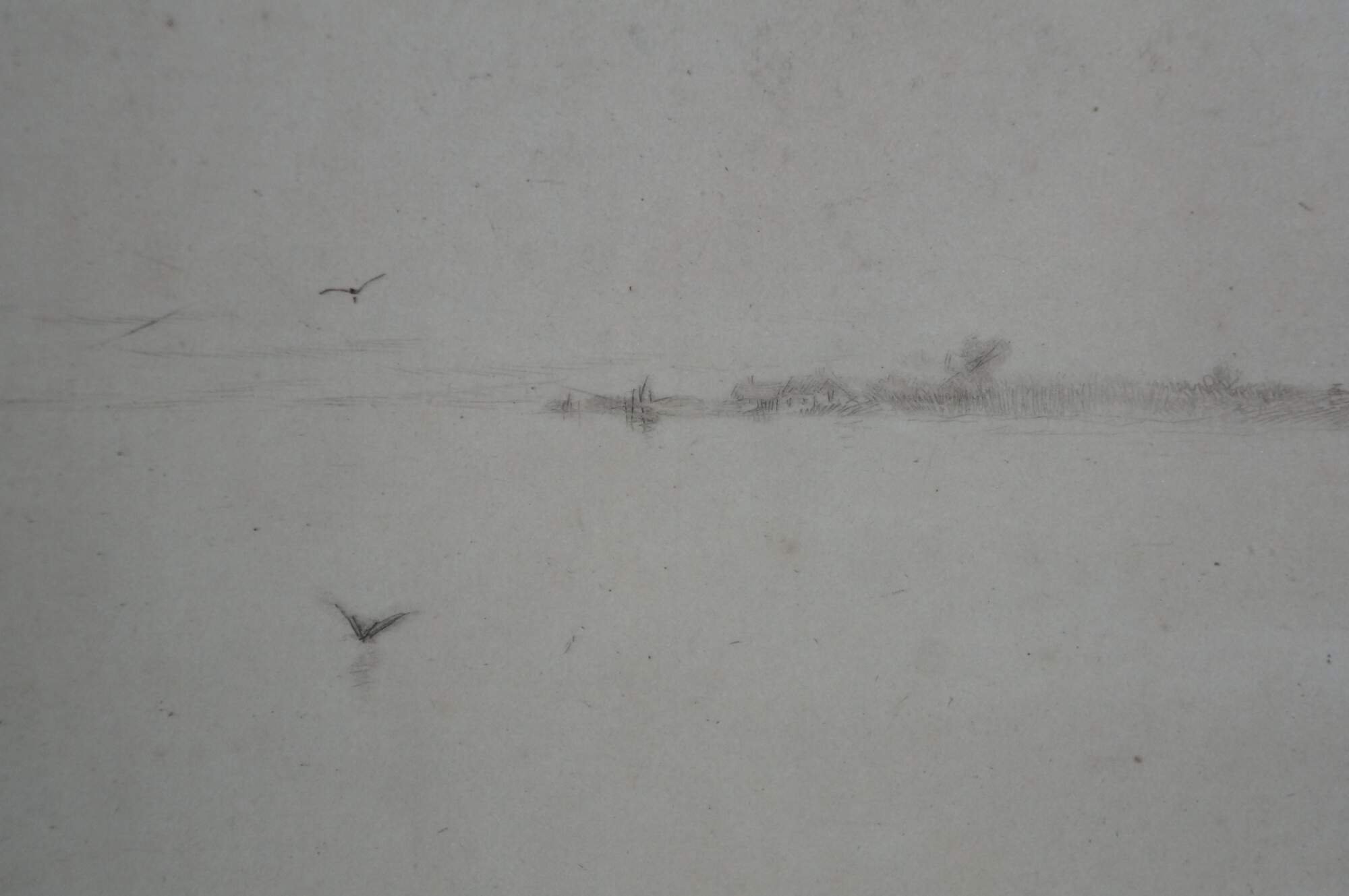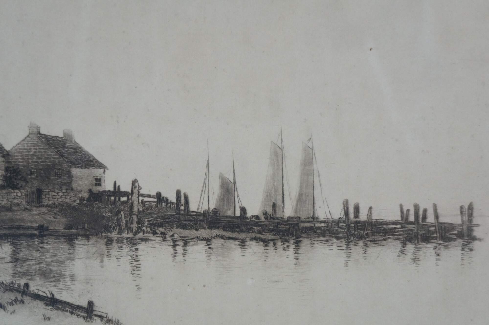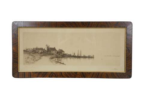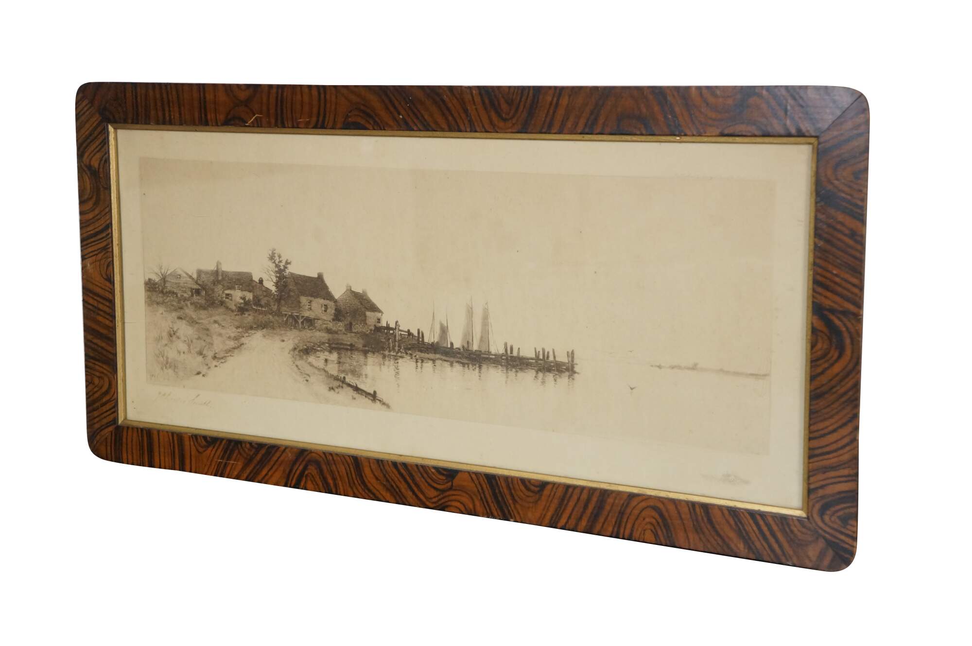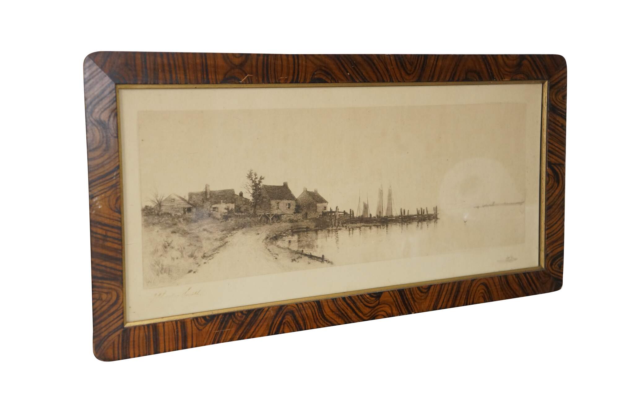 Early 20th century black and white etching. Panoramic coastal landscape of a fishing village near a dock with sailboats. Ink signed, Smith, lower left. Remarke of a cottage, lower right. Published by James Tyroler, New York, 1902. Painted grain frame with gilt inner border; no mat.
