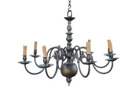 Antique Colonial Williamsburg brass eight arm candlestick chandelier featuring traditional styling with serpentine arms and figural flute players / trumpeters.