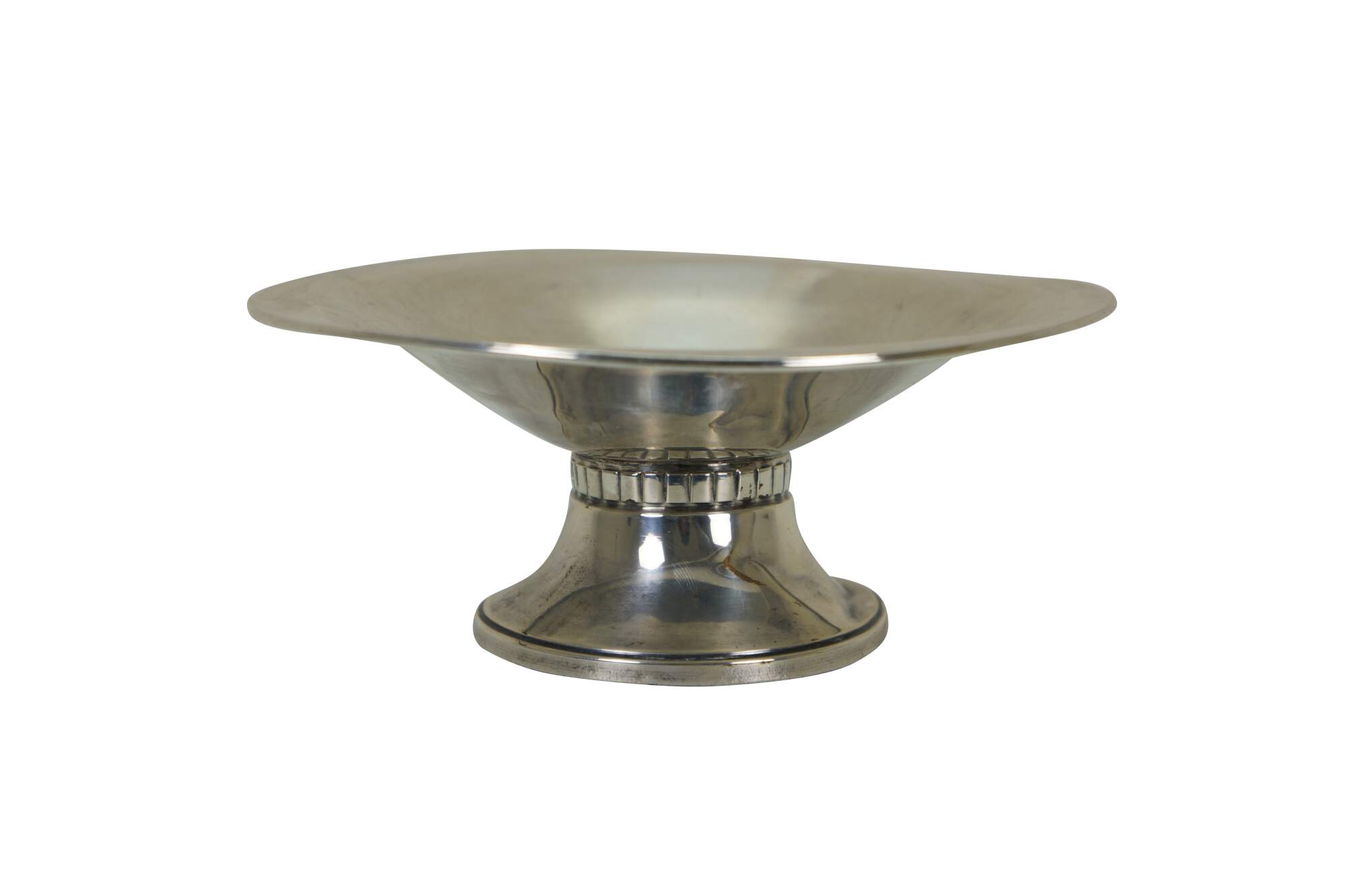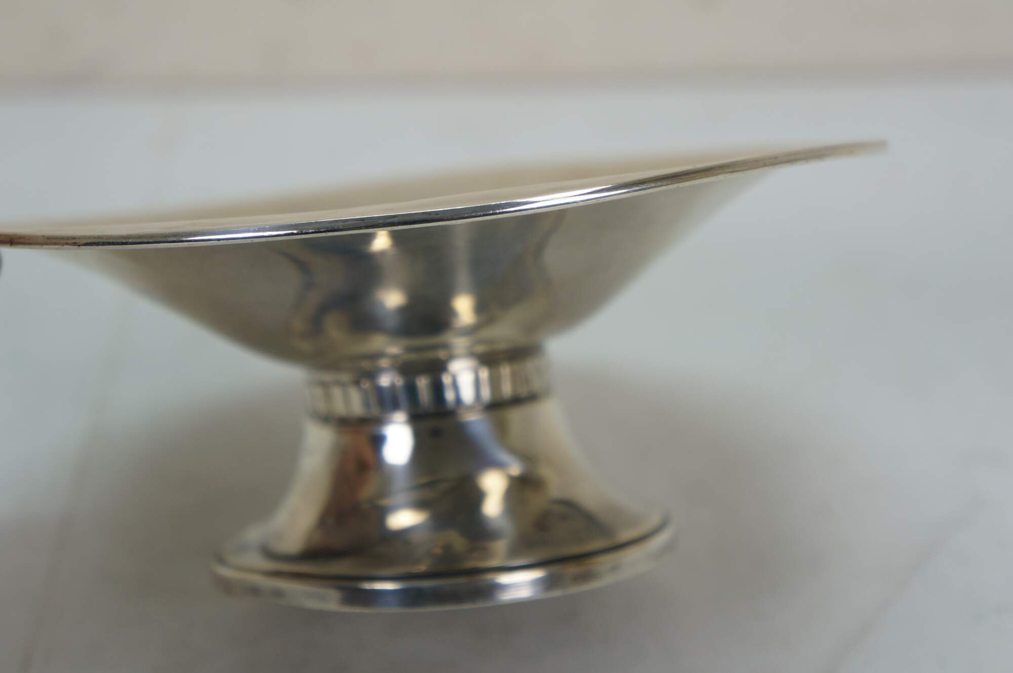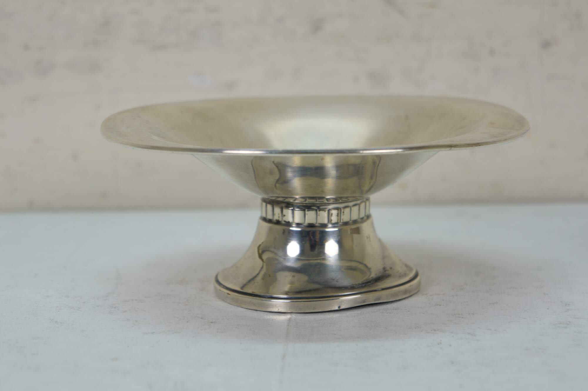 Vintage 20th century Wallace sterling silver number 4798 candy / nut dish in the Modernique pattern. Pedestal style dish with a simple ribbed collar around the middle.