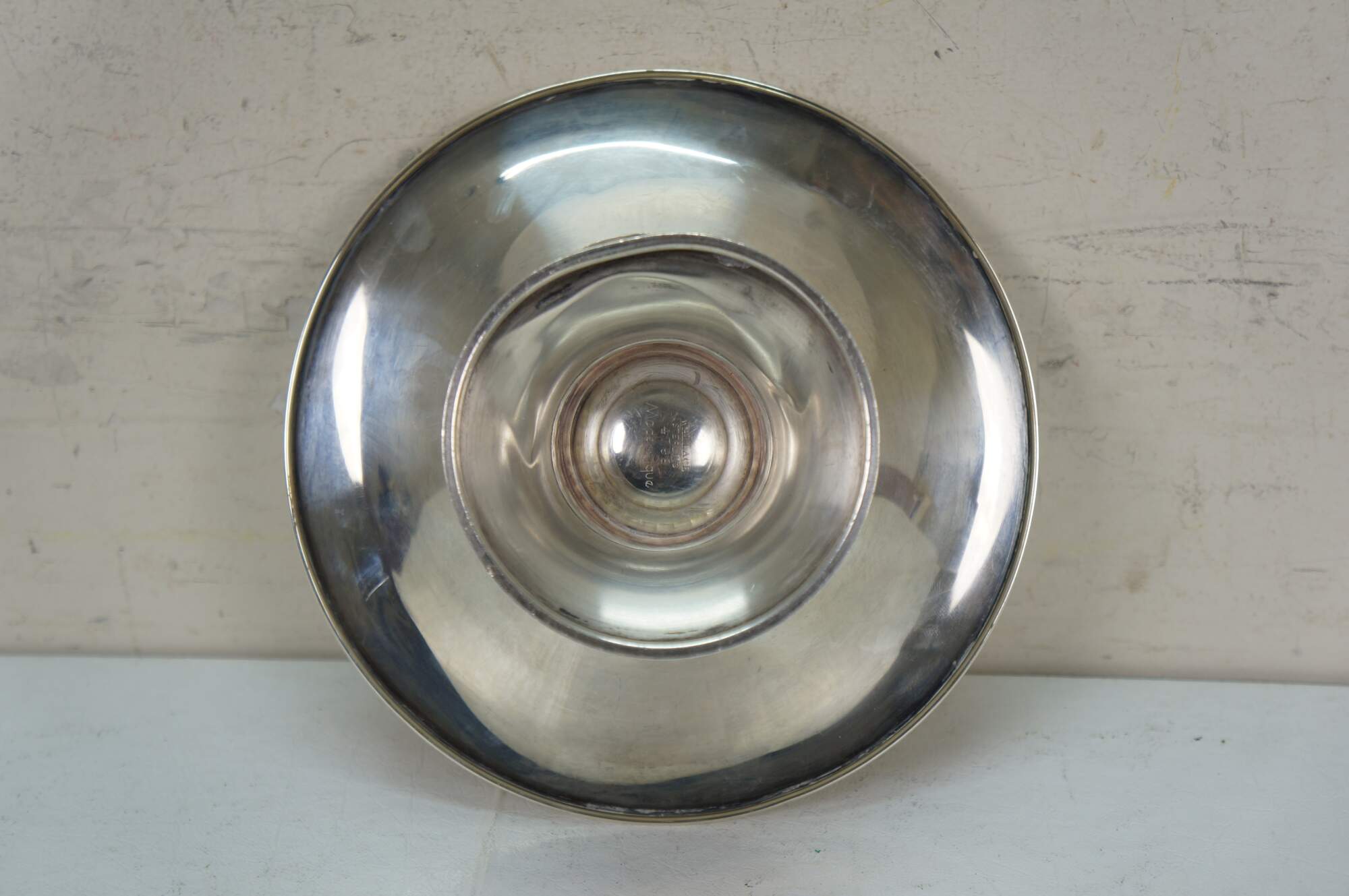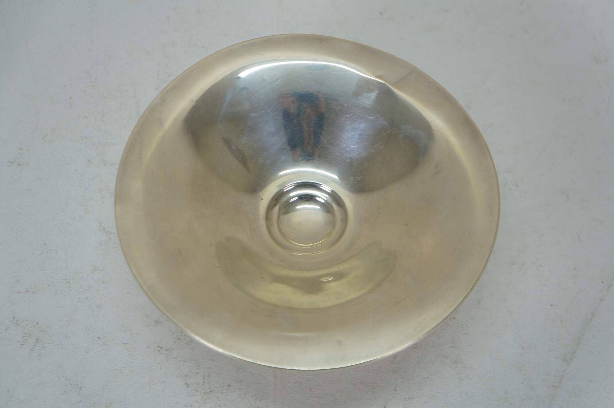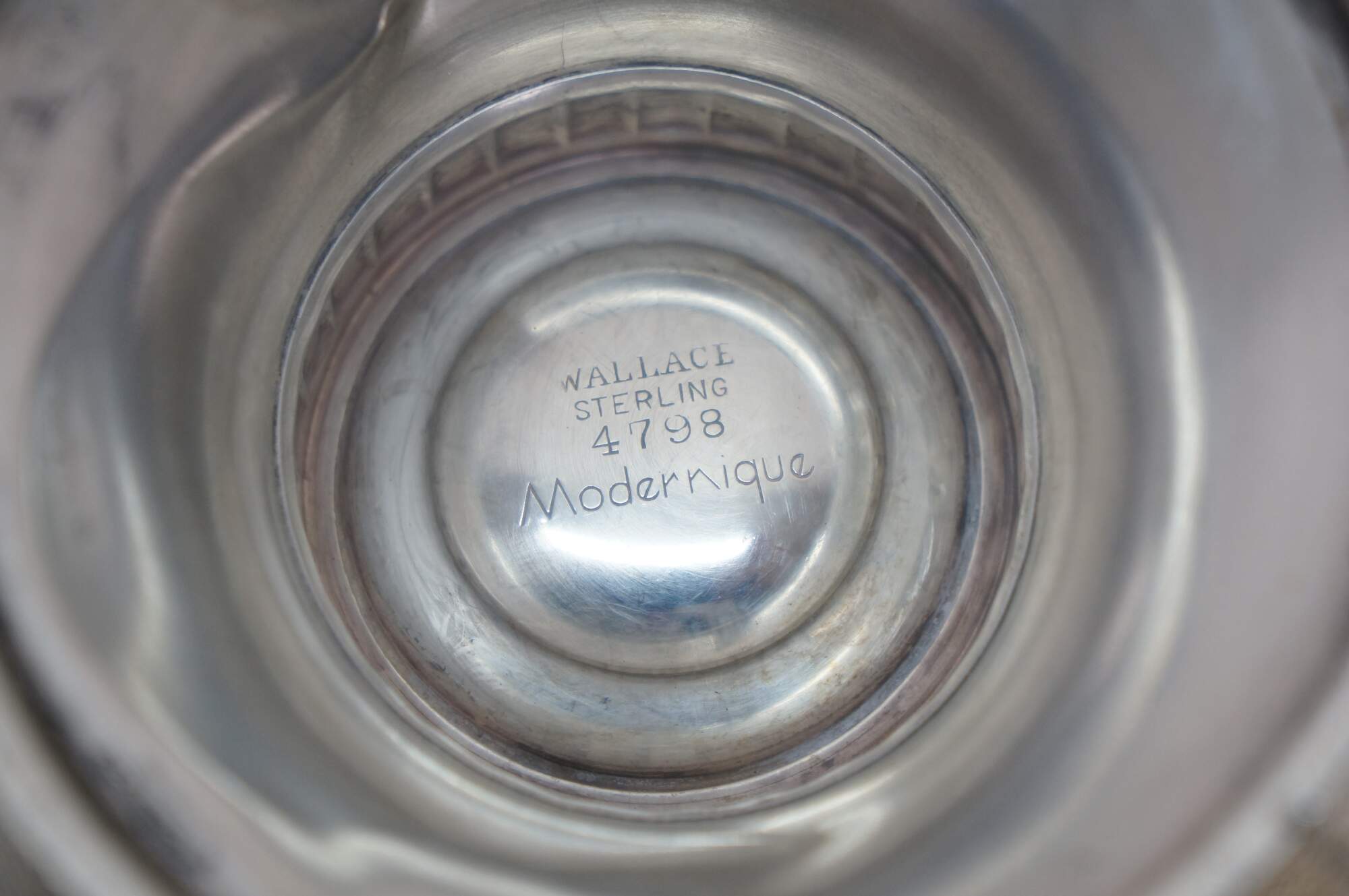 Vintage 20th century Wallace sterling silver number 4798 candy / nut dish in the Modernique pattern. Pedestal style dish with a simple ribbed collar around the middle.