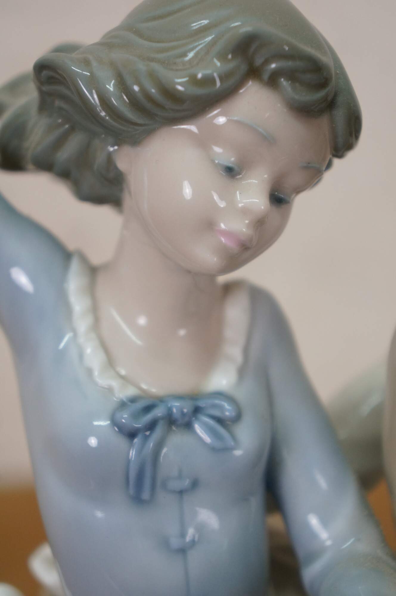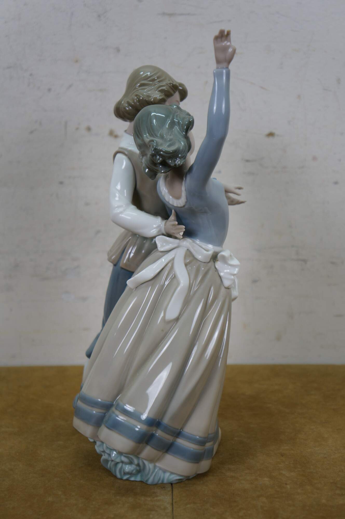 Vintage 1984 Lladro porcelain figurine in the shape of a couple dancing together dressed in brown and blue late 18th century / Colonial era clothing. Item Number 5256. F-20 D.
